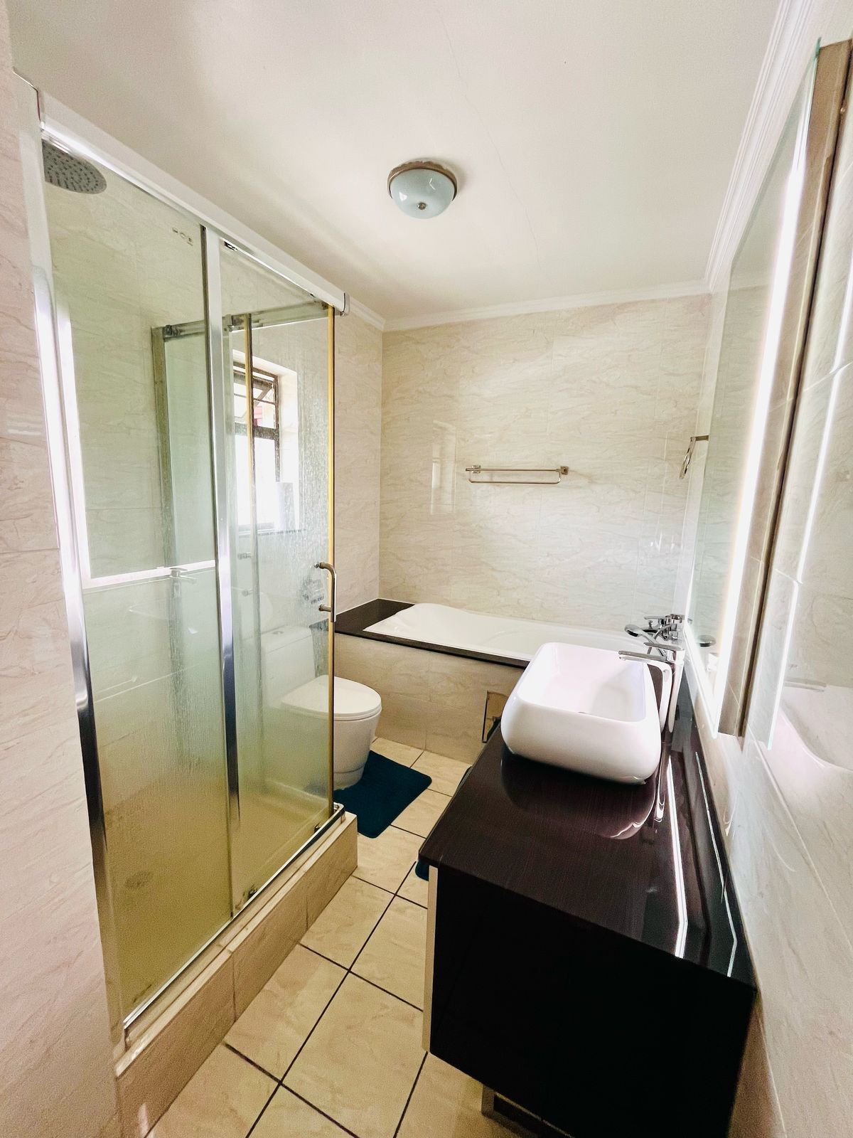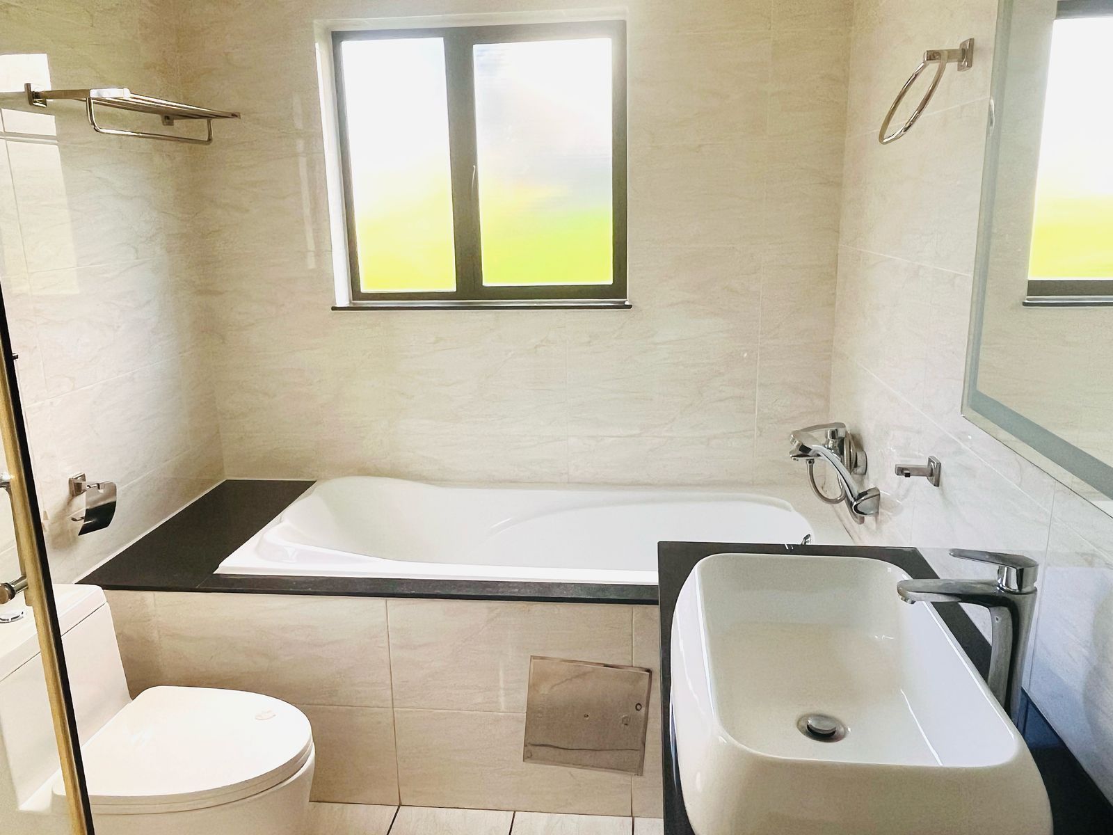 The two bathrooms are elegantly designed with modern fixtures and finishes. The guest bathroom is conveniently located near the second bedroom, while the master ensuite ensures privacy and convenience for the main bedroom.