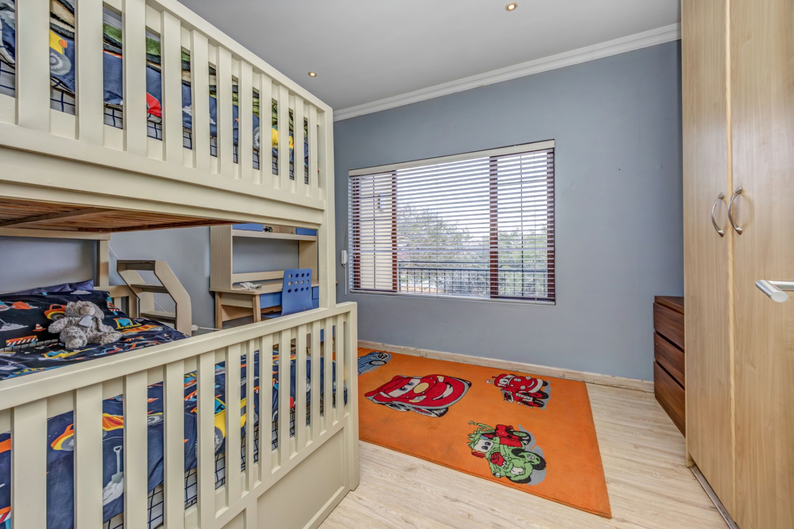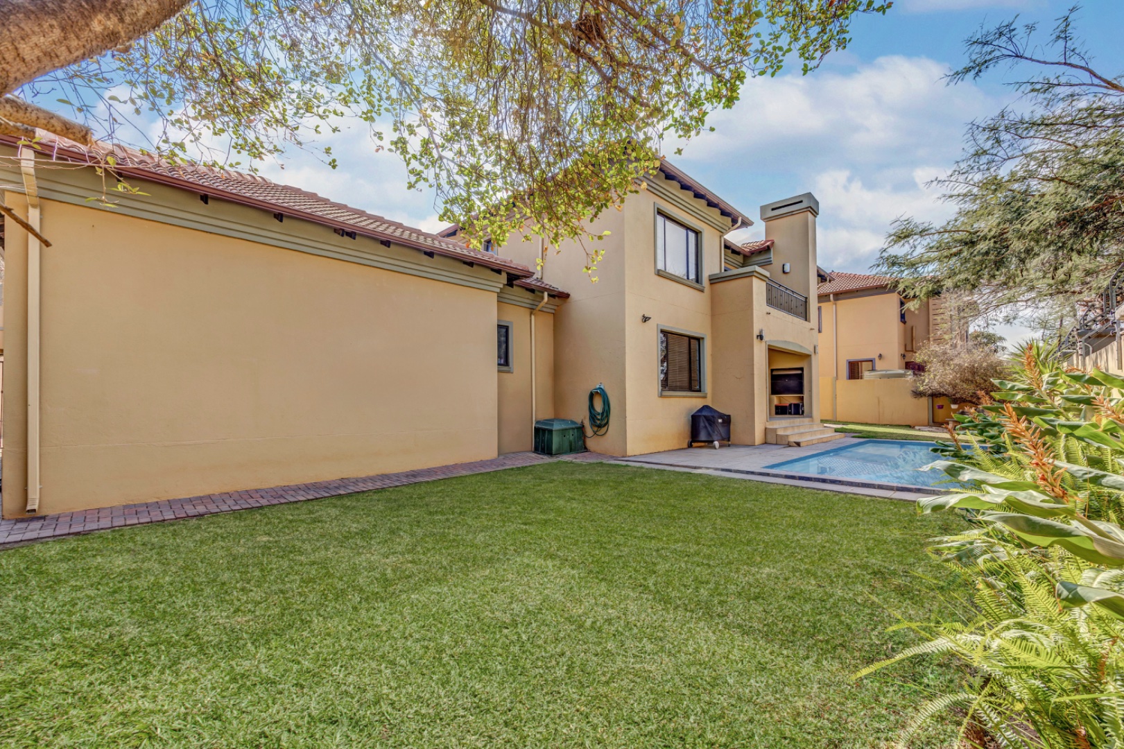 The outdoor space features a beautifully manicured garden, offering a low-maintenance and private setting for relaxation and play.
