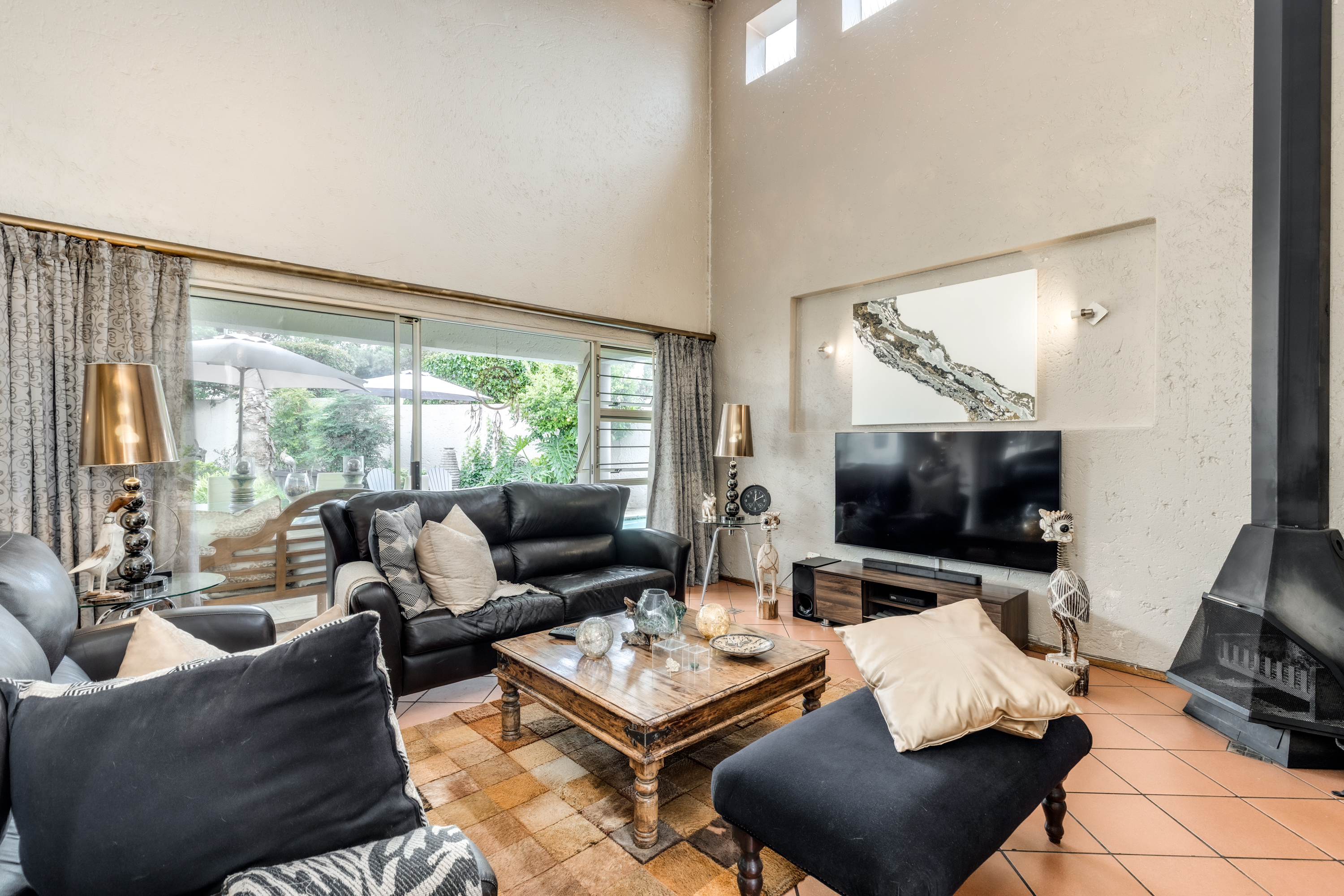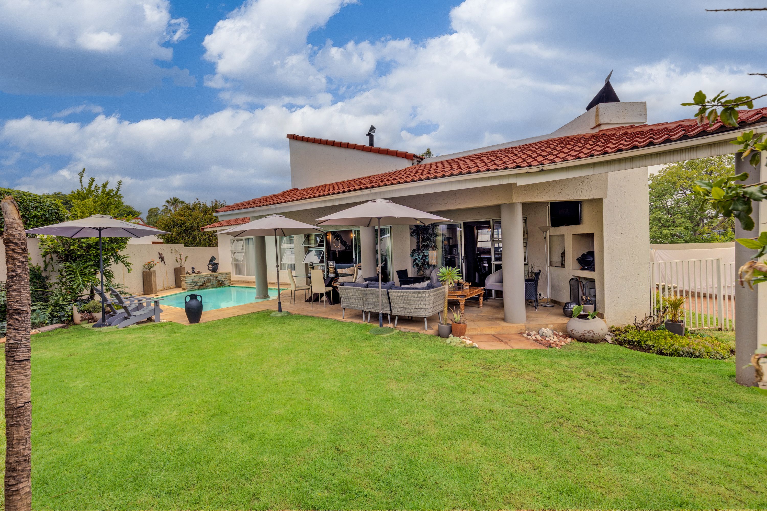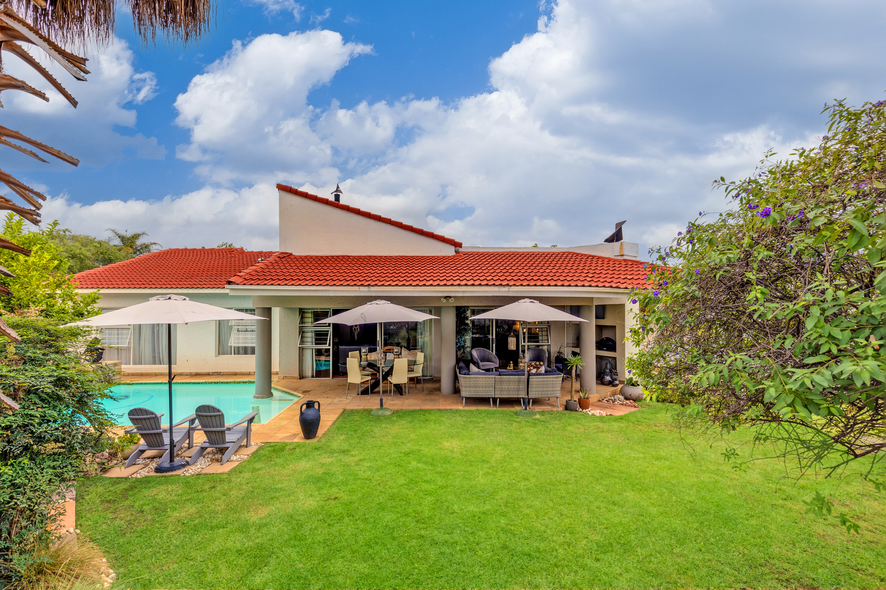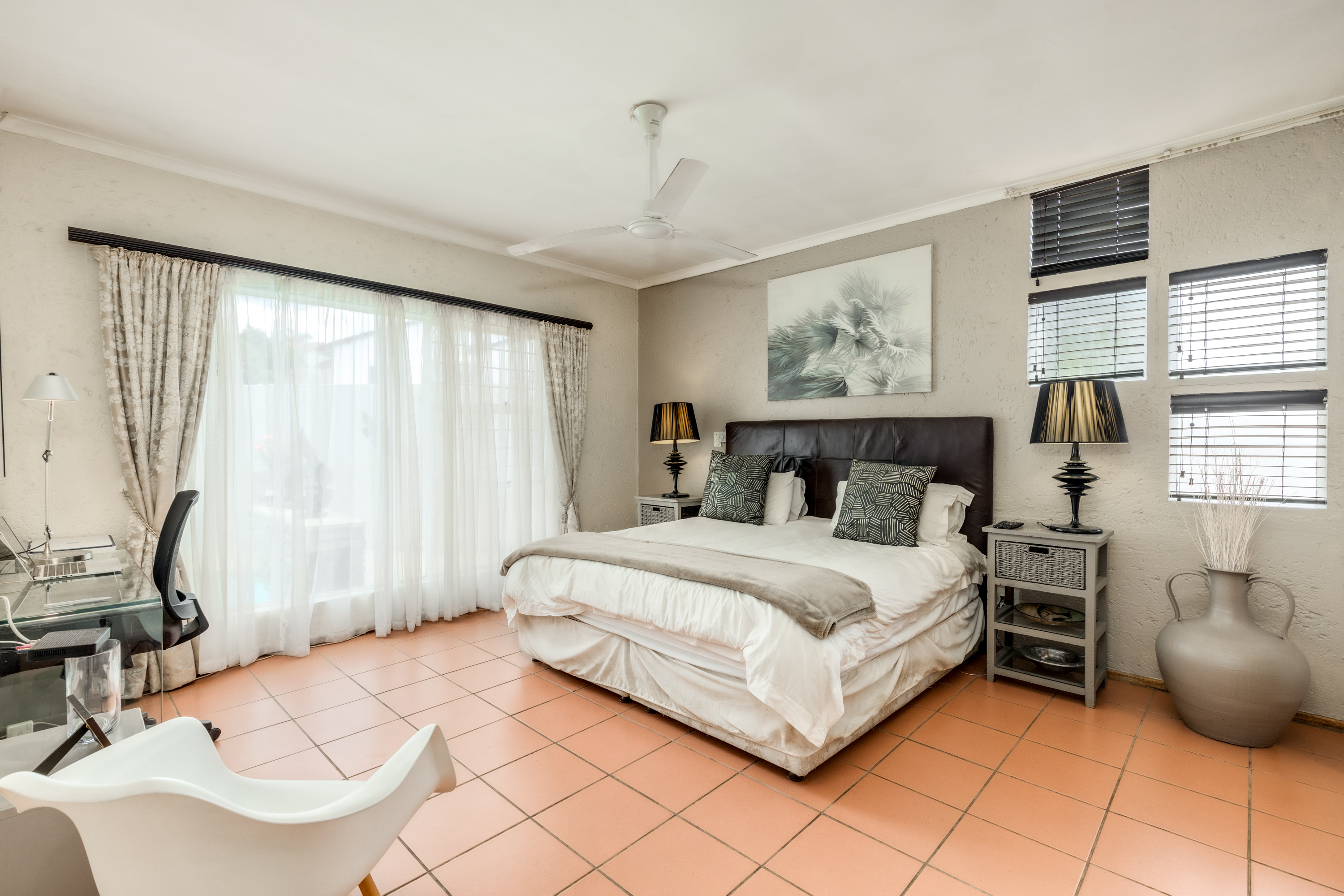 Glass sliding doors open onto the covered entertainer’s patios, with a built-in braai, overlooking a well-maintained and pet friendly garden, and a refreshing swimming pool, making it an ideal setting for indoor-outdoor living