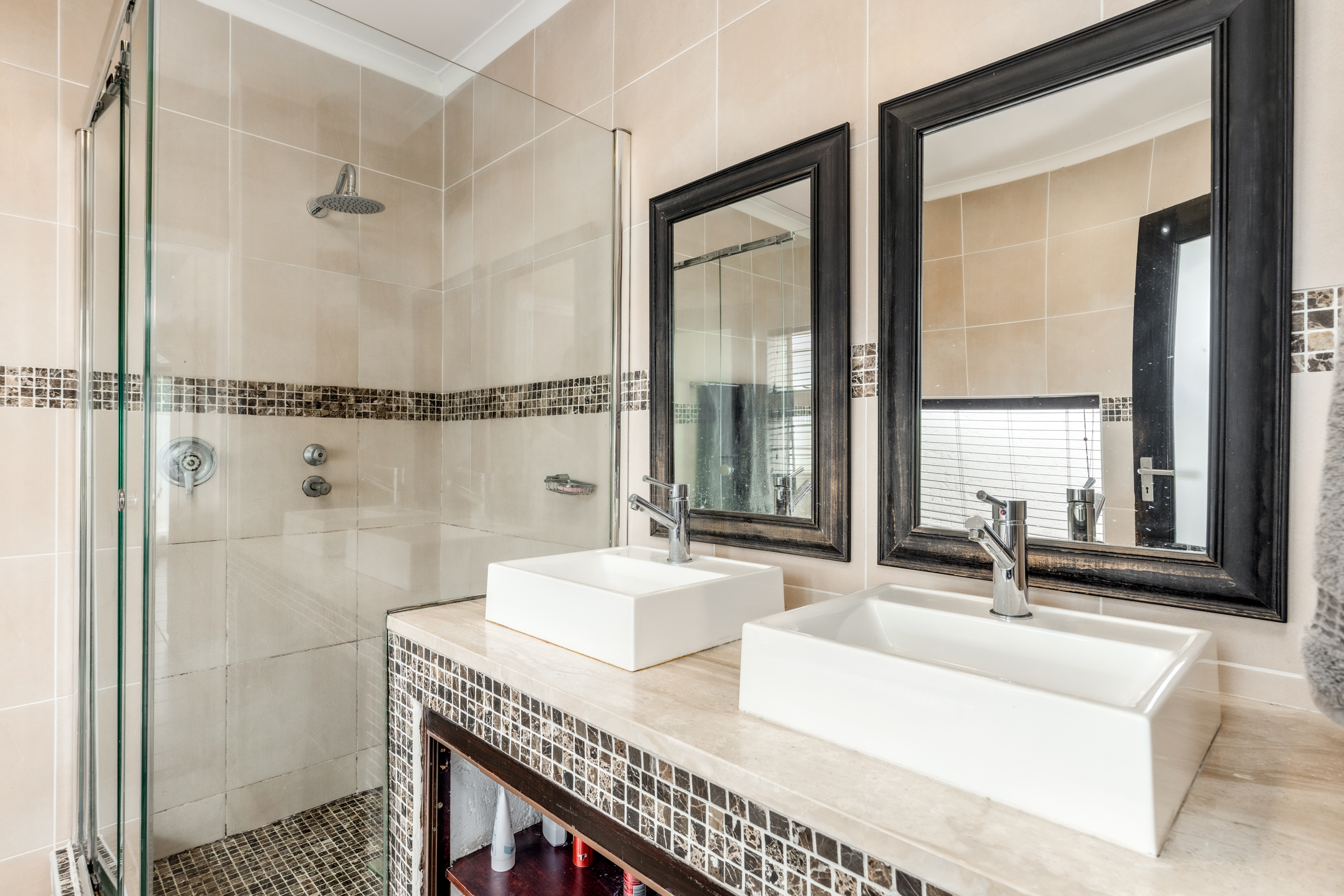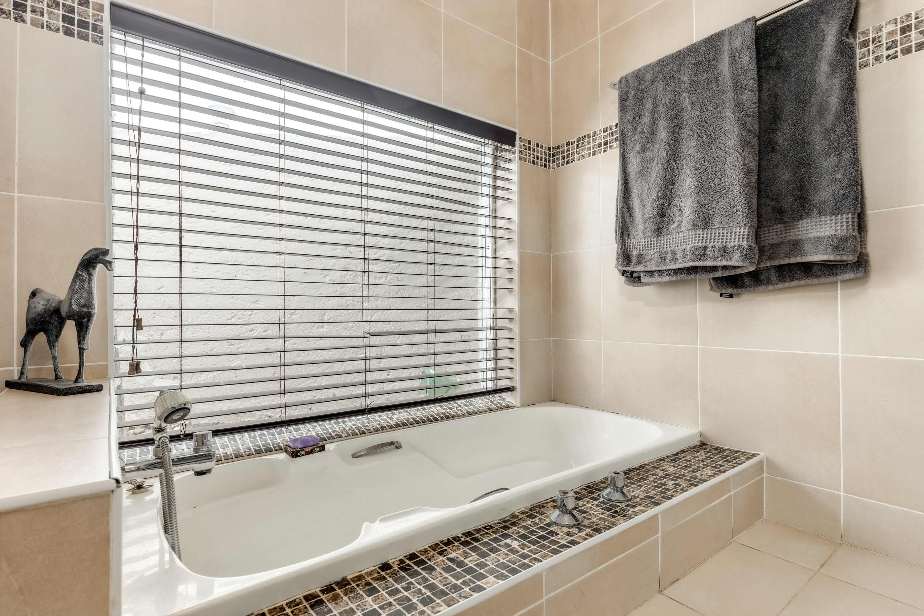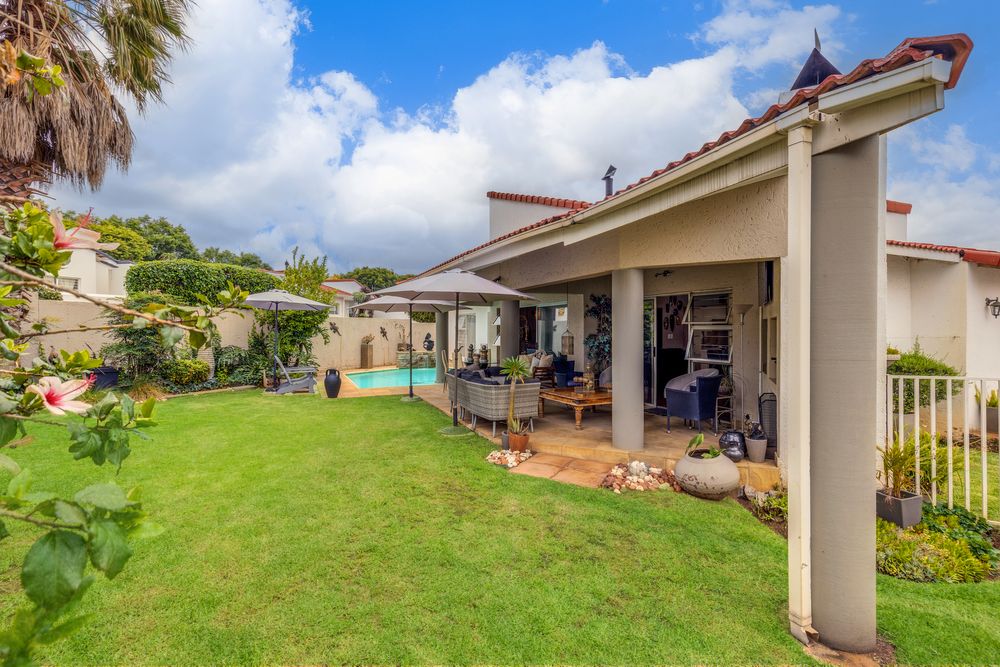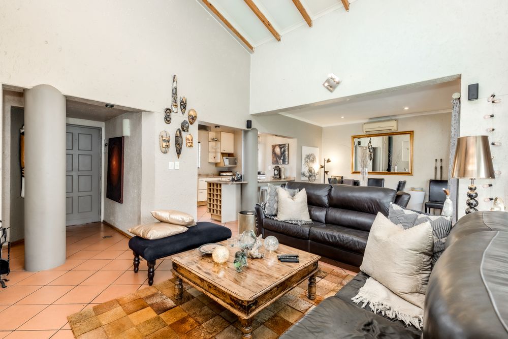 Glass sliding doors open onto the covered entertainer’s patios, with a built-in braai, overlooking a well-maintained and pet friendly garden, and a refreshing swimming pool, making it an ideal setting for indoor-outdoor living