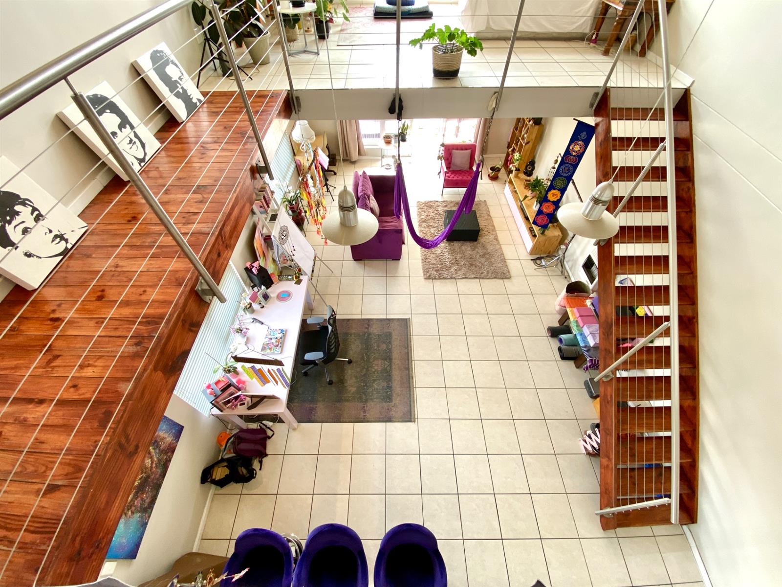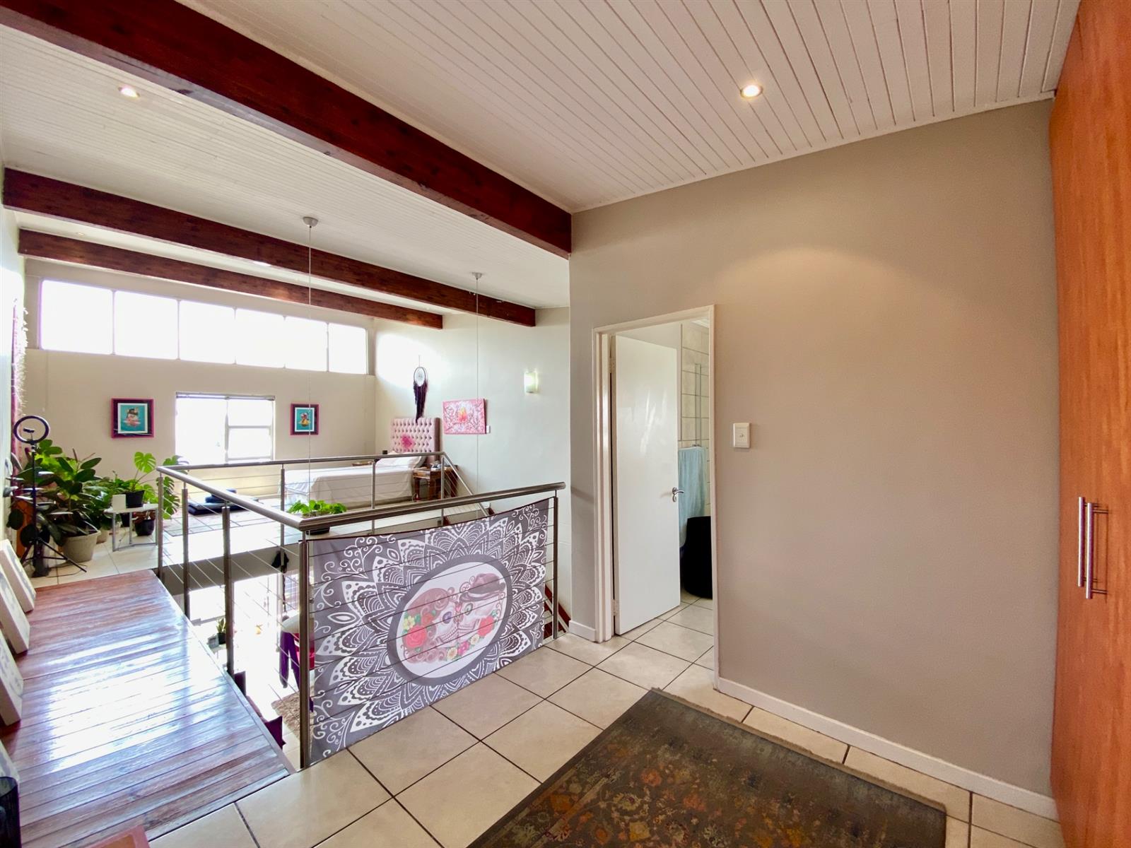 A dramatic wooden staircase with steel balustrades leading to a large main bedroom with inspiring views, a wooden walkway to cupboard areas, and a spacious en-suite bathroom with a shower