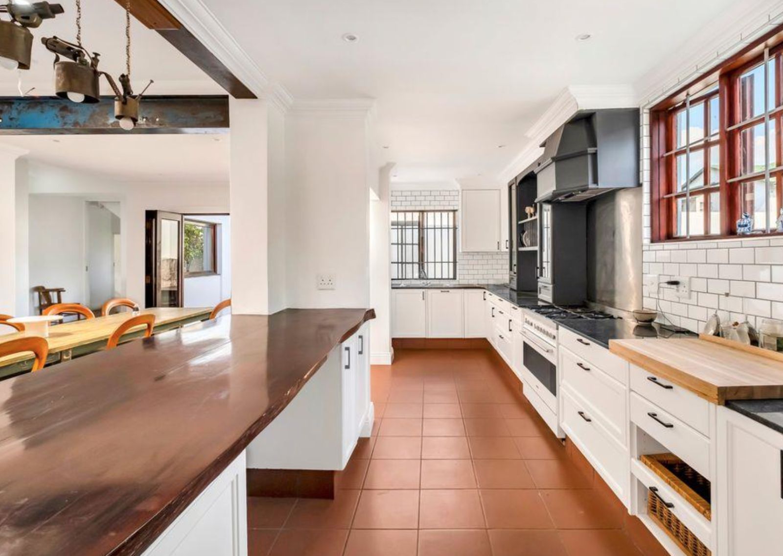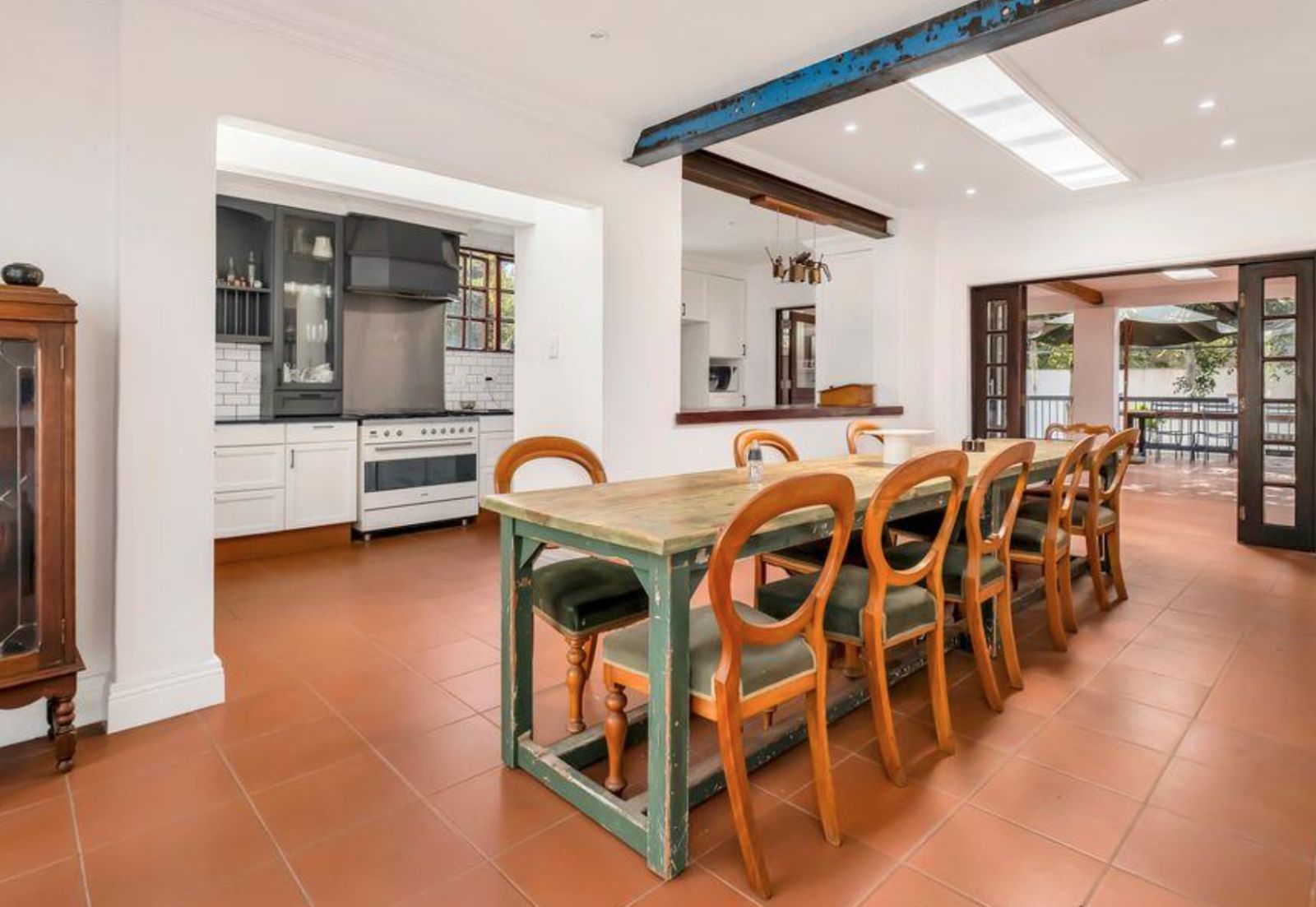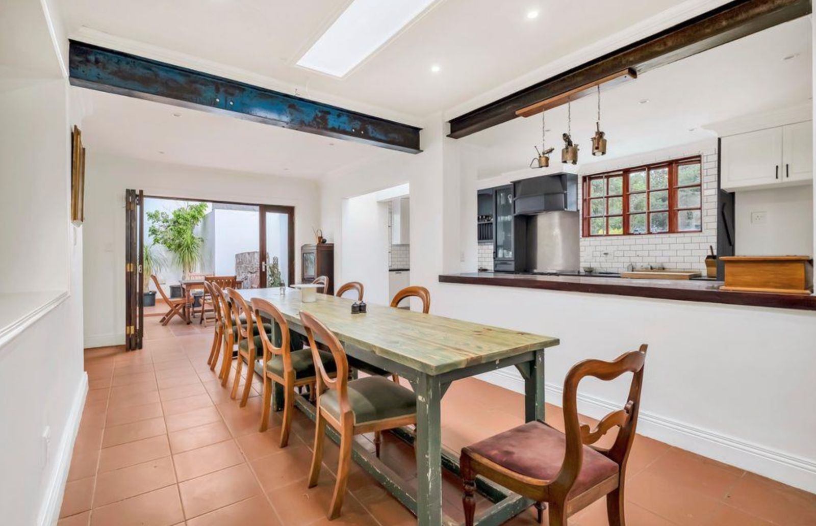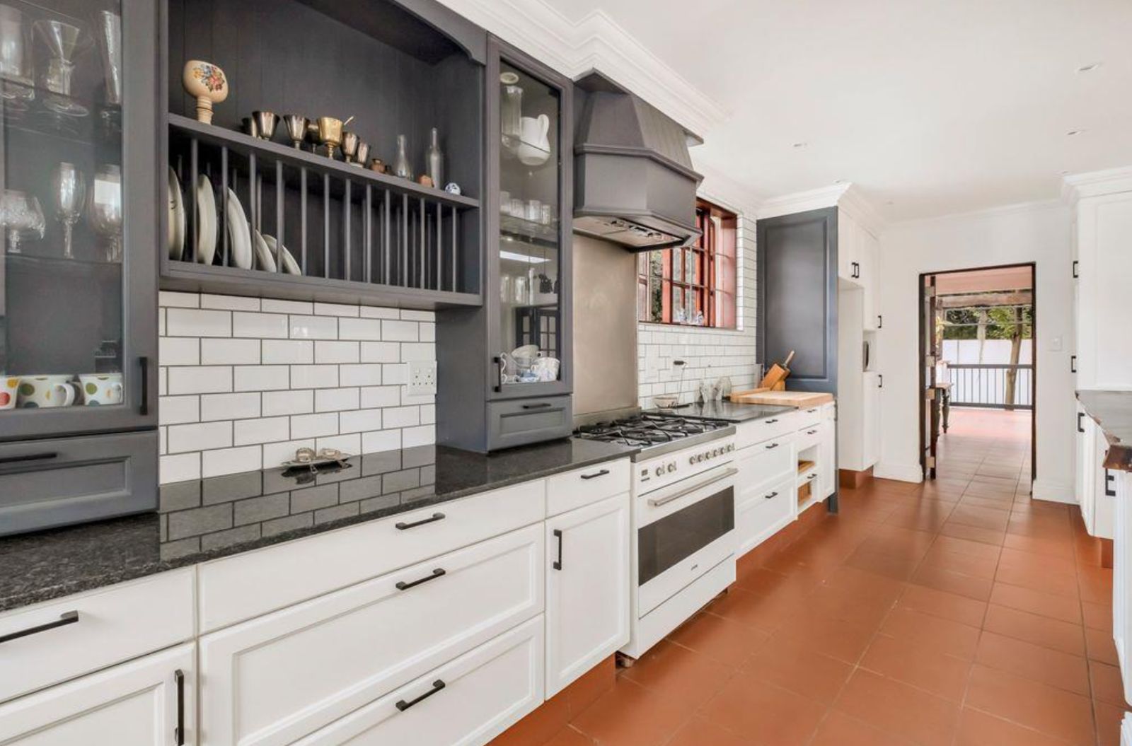 The heart of the home is a chef's kitchen, boasting white cabinetry, black granite countertops, a dark wood island, and a SMEG gas stove. It opens to an intimate alfresco courtyard, for your morning delights!
