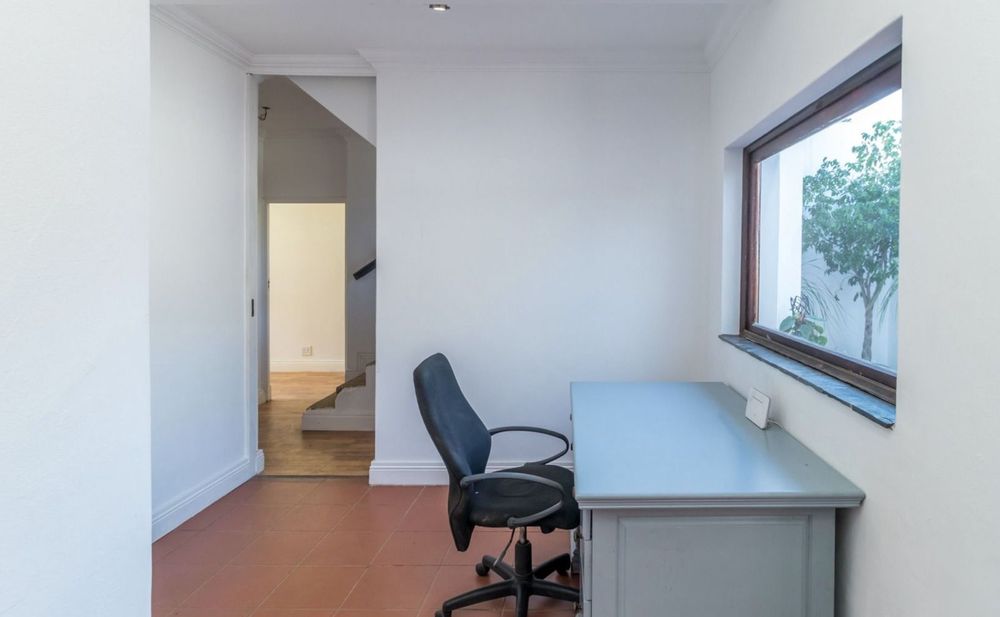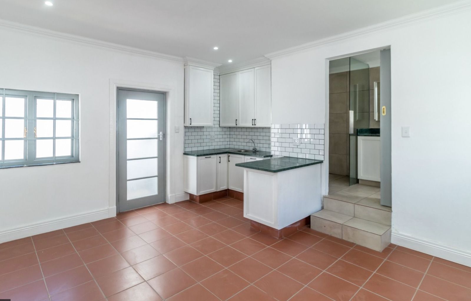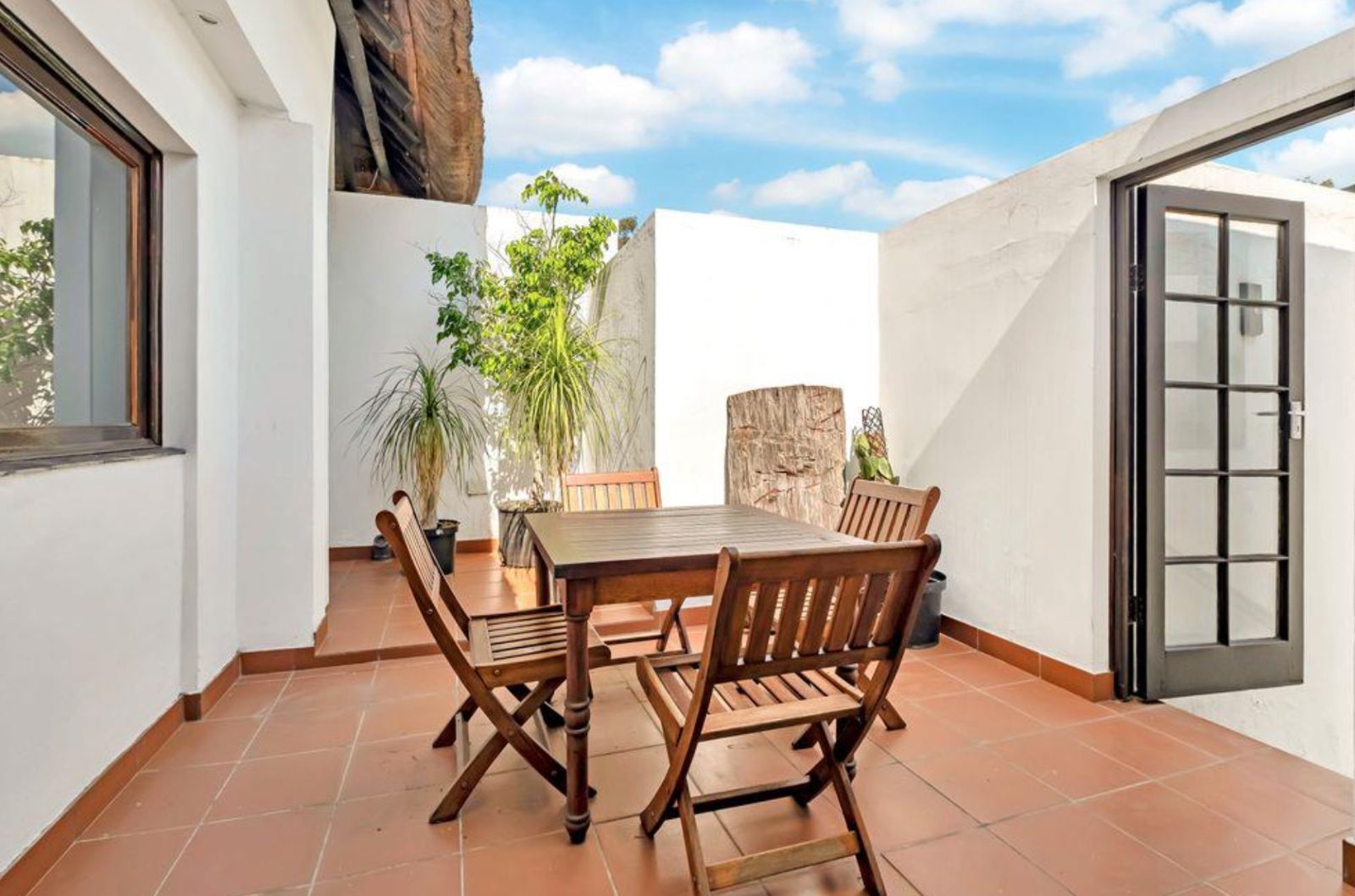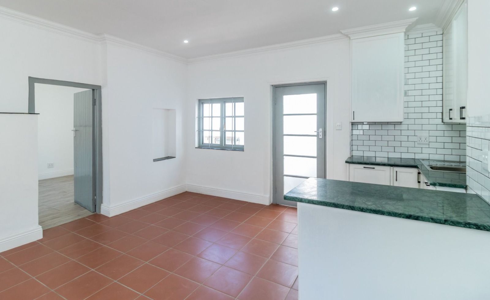 The heart of the home is a chef's kitchen, boasting white cabinetry, black granite countertops, a dark wood island, and a SMEG gas stove. It opens to an intimate alfresco courtyard, for your morning delights!