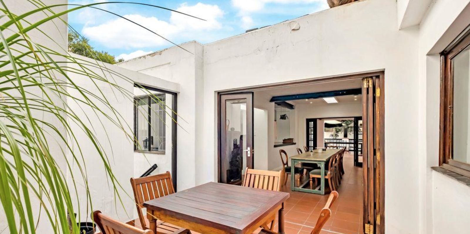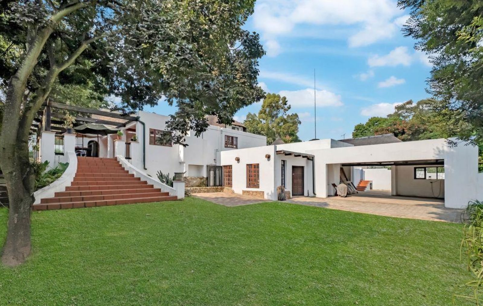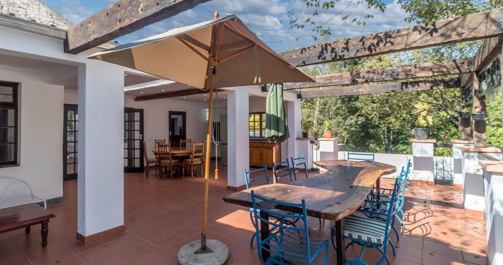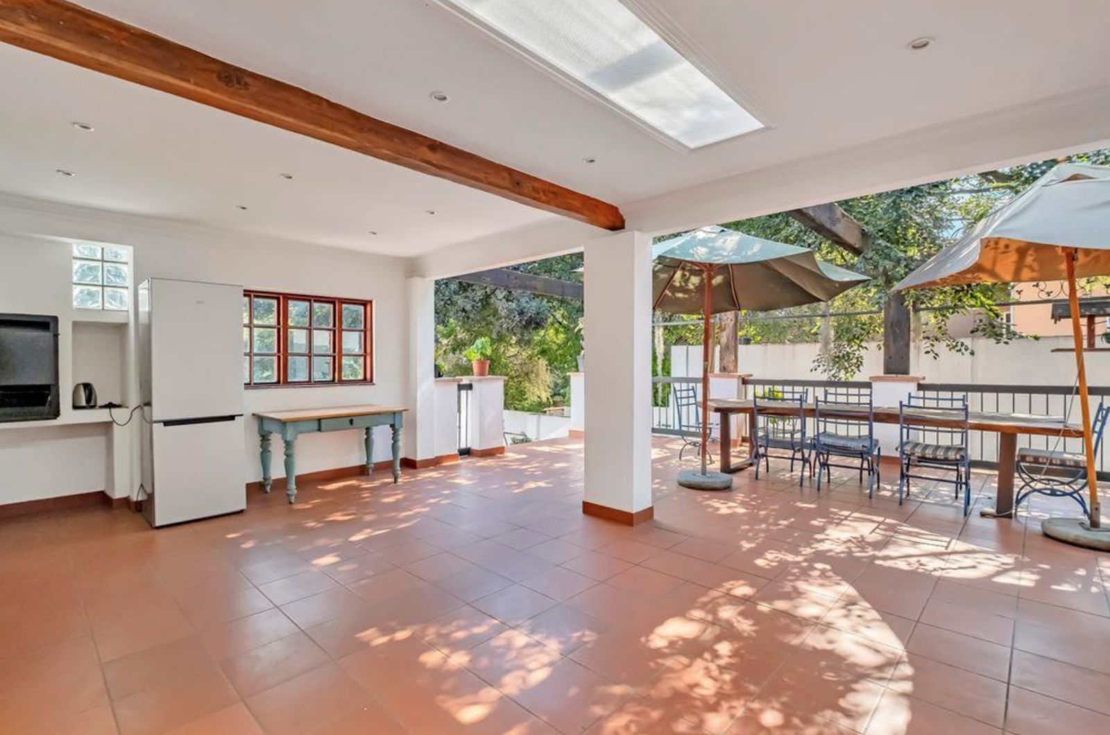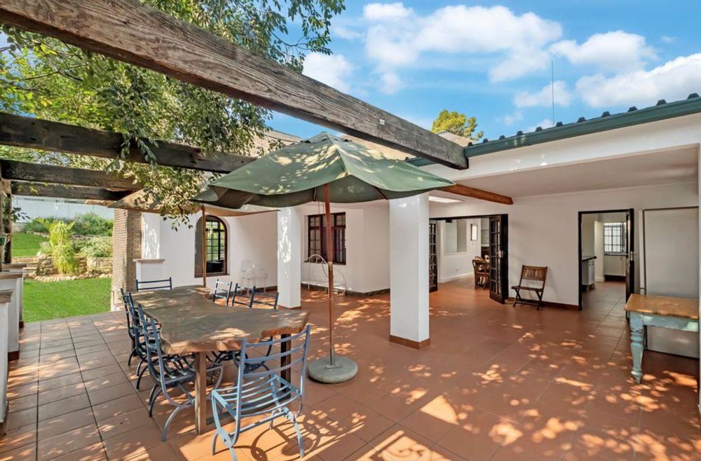 An expansive entertainer's patio with a built-in braai extends from the dining room and kitchen.