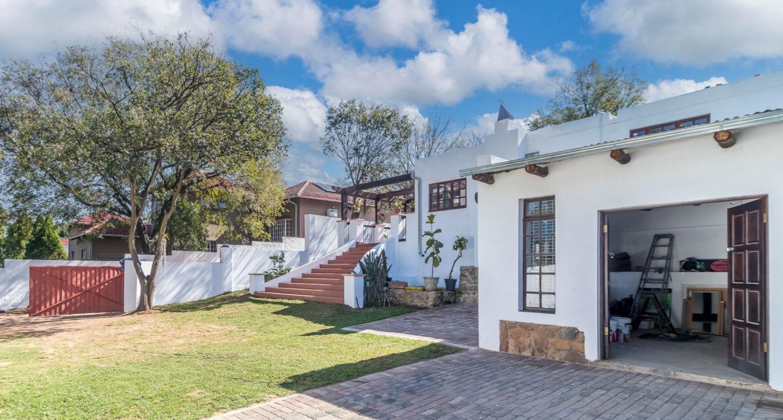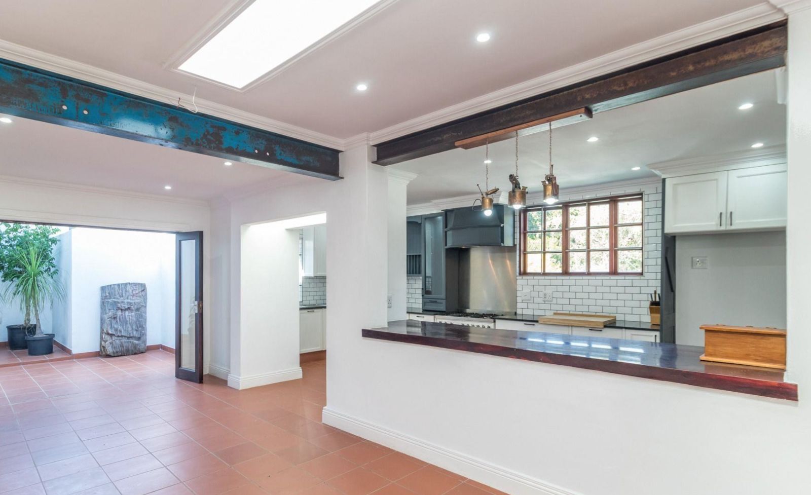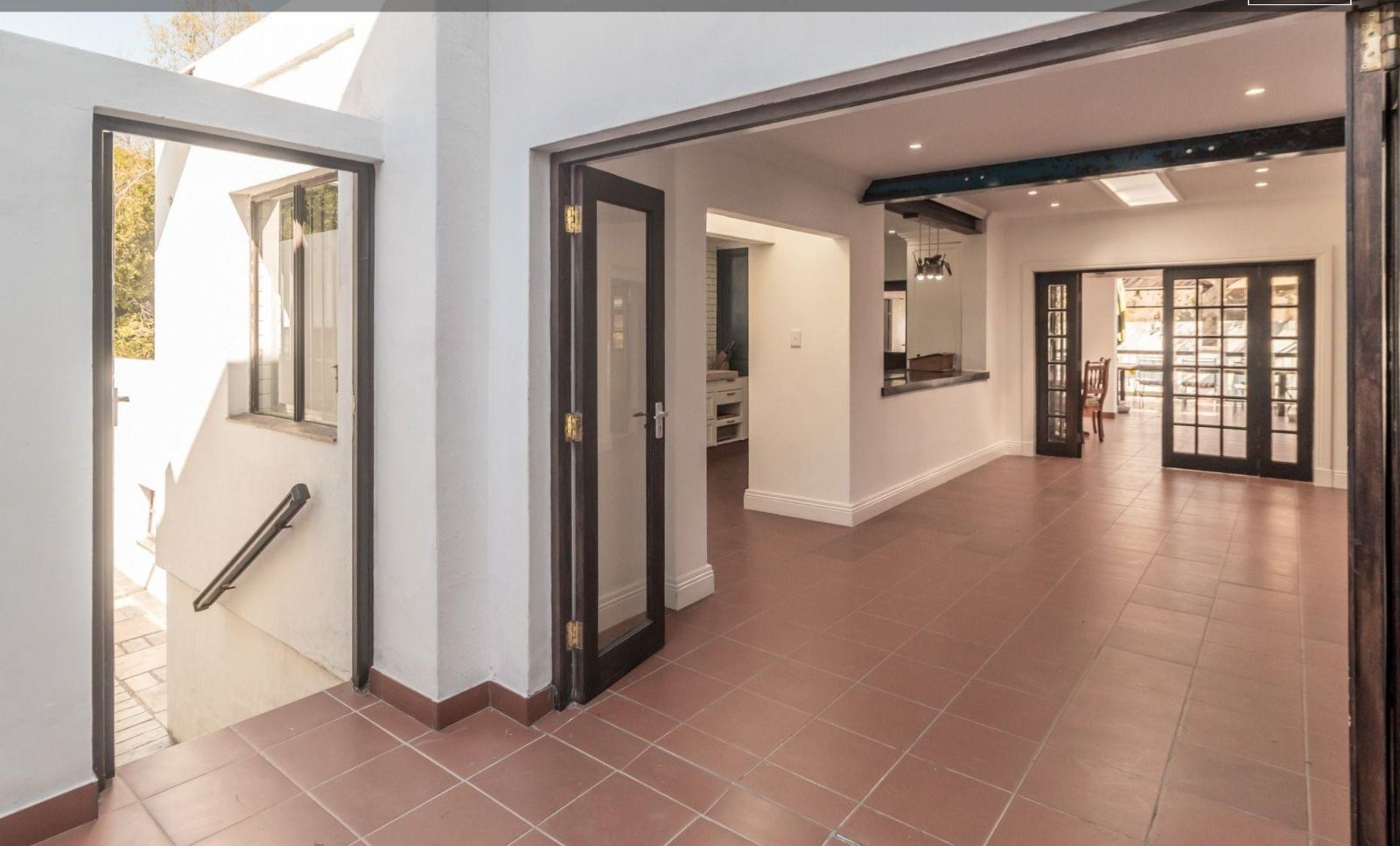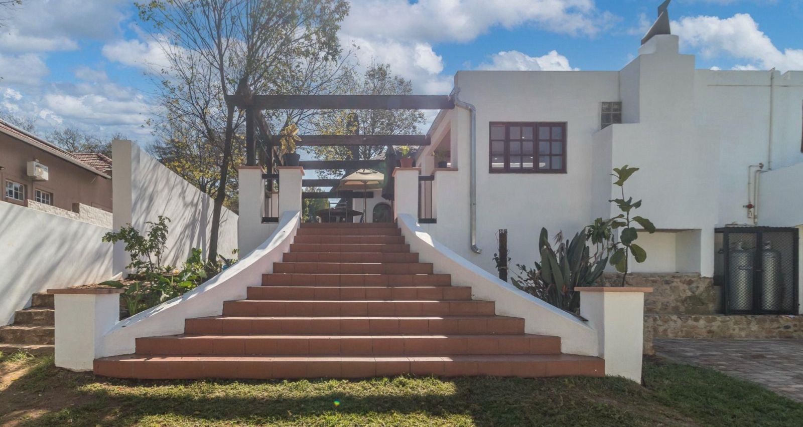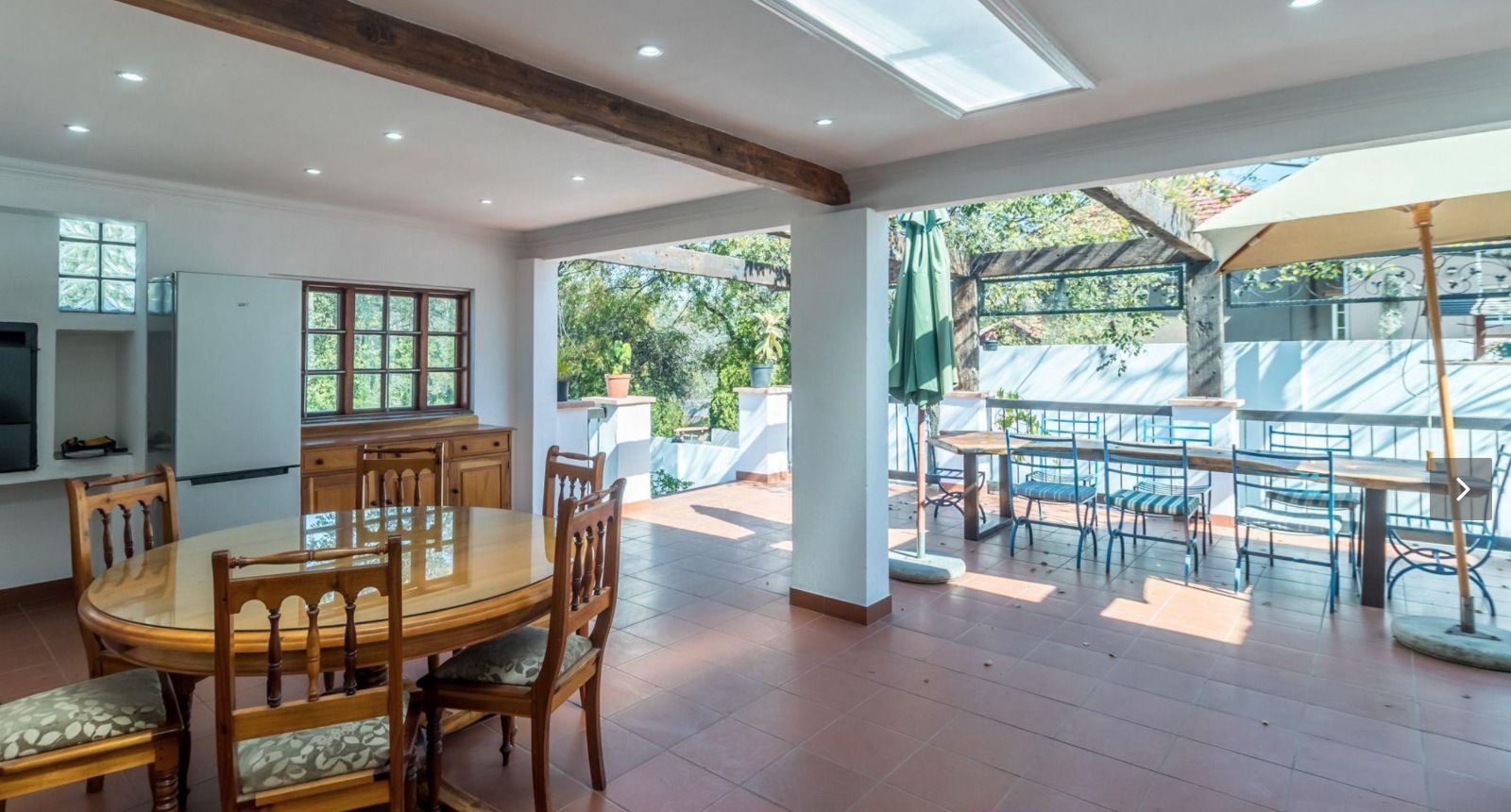 An expansive entertainer's patio with a built-in braai extends from the dining room and kitchen.