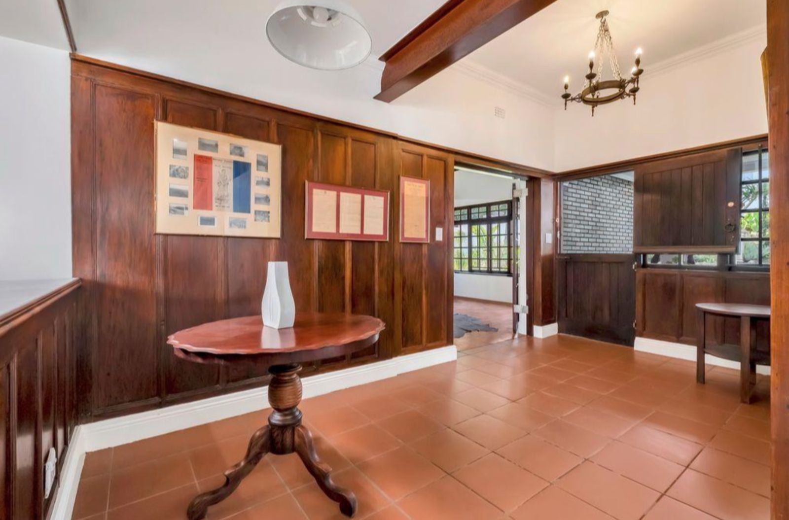Upon entering the wood panelled foyer, you are drawn to a large family lounge with a wood-burning fireplace inclusive of a cigar/reading lounge, with a view to the dining and kitchen areas.