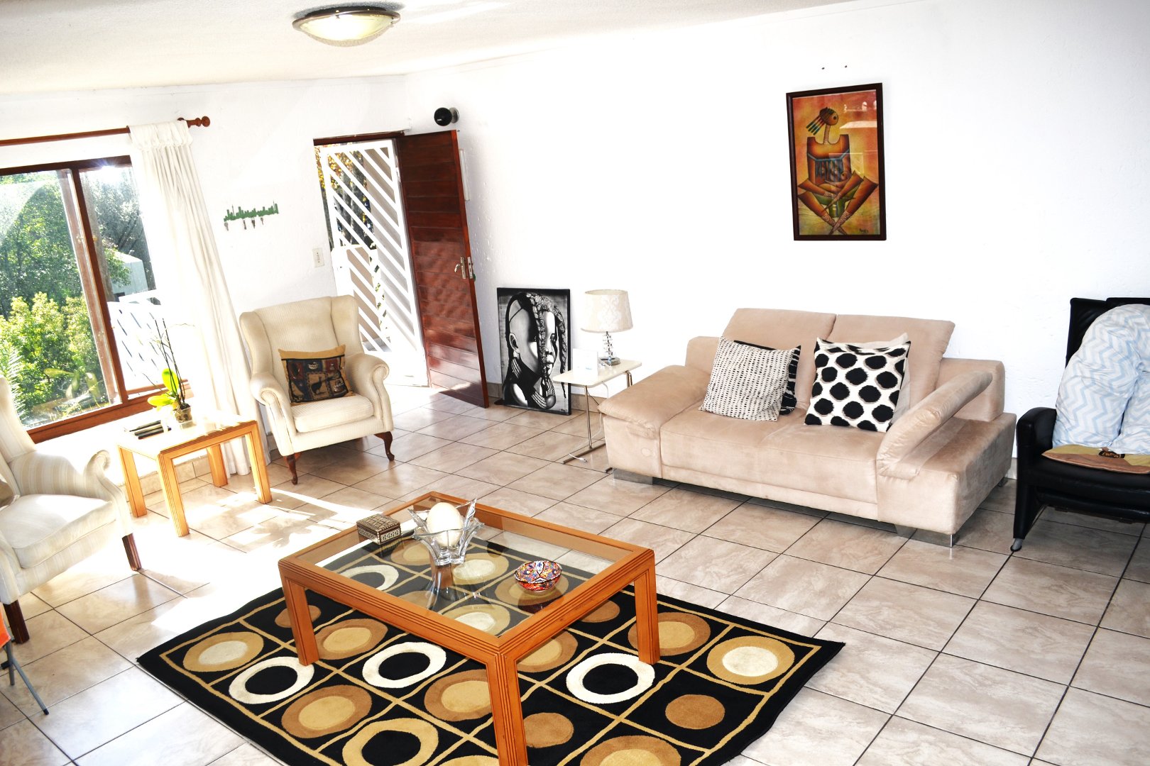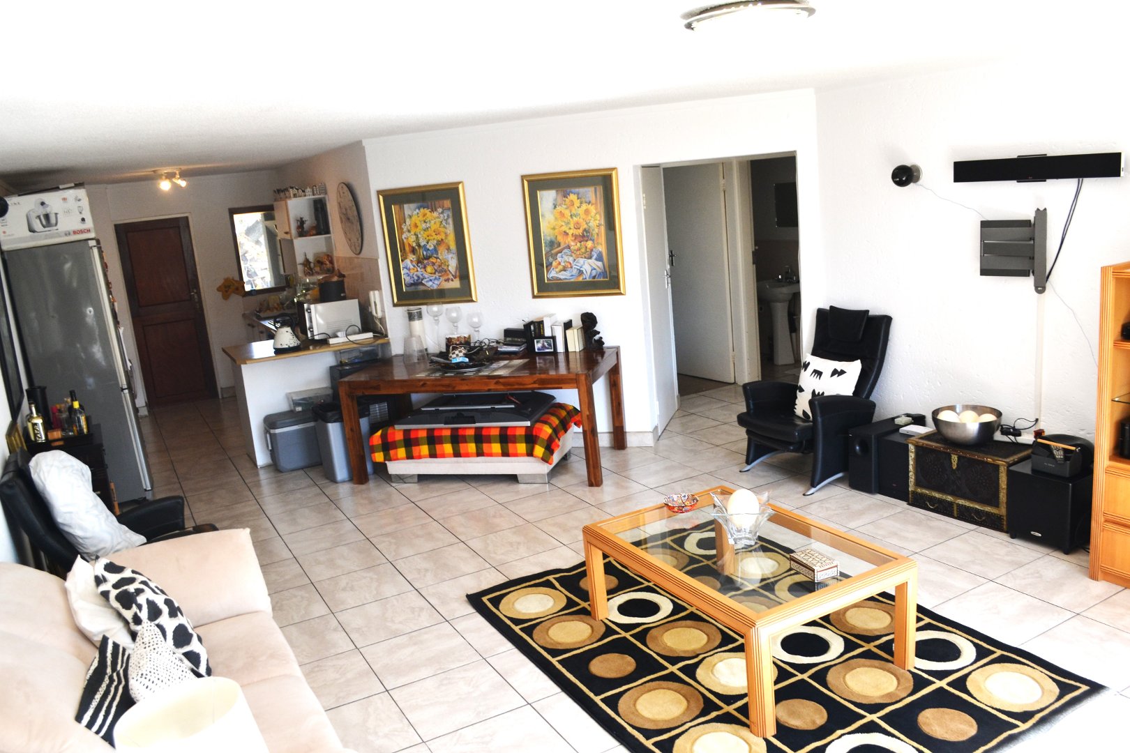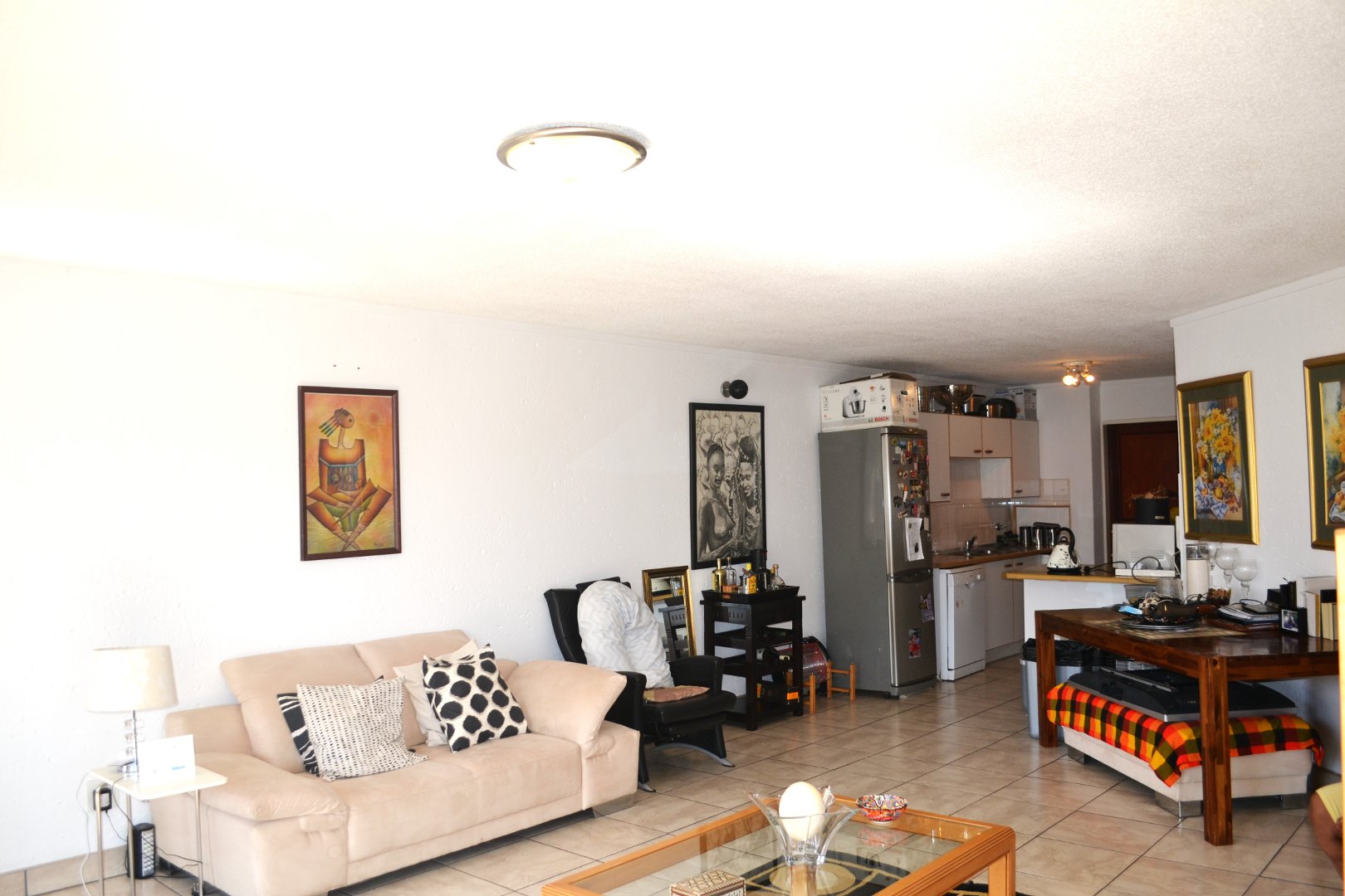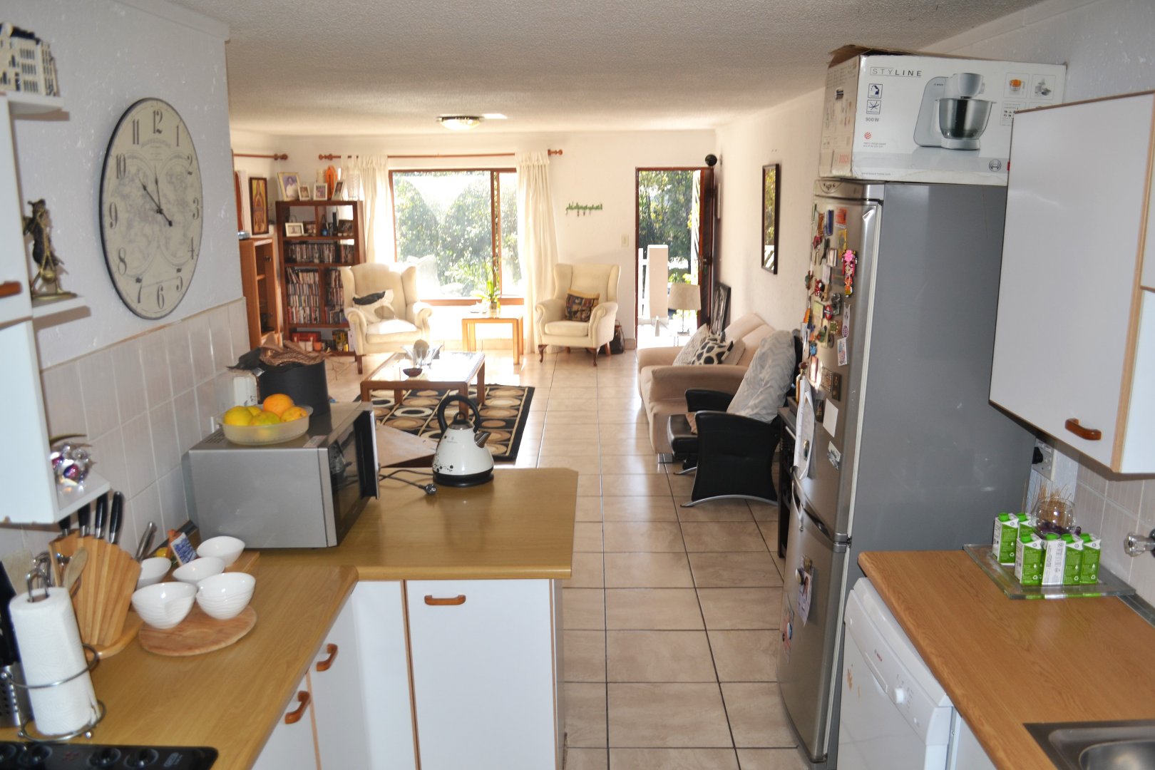 Inviting large open plan tiled, lounge/dining-room/kitchen.