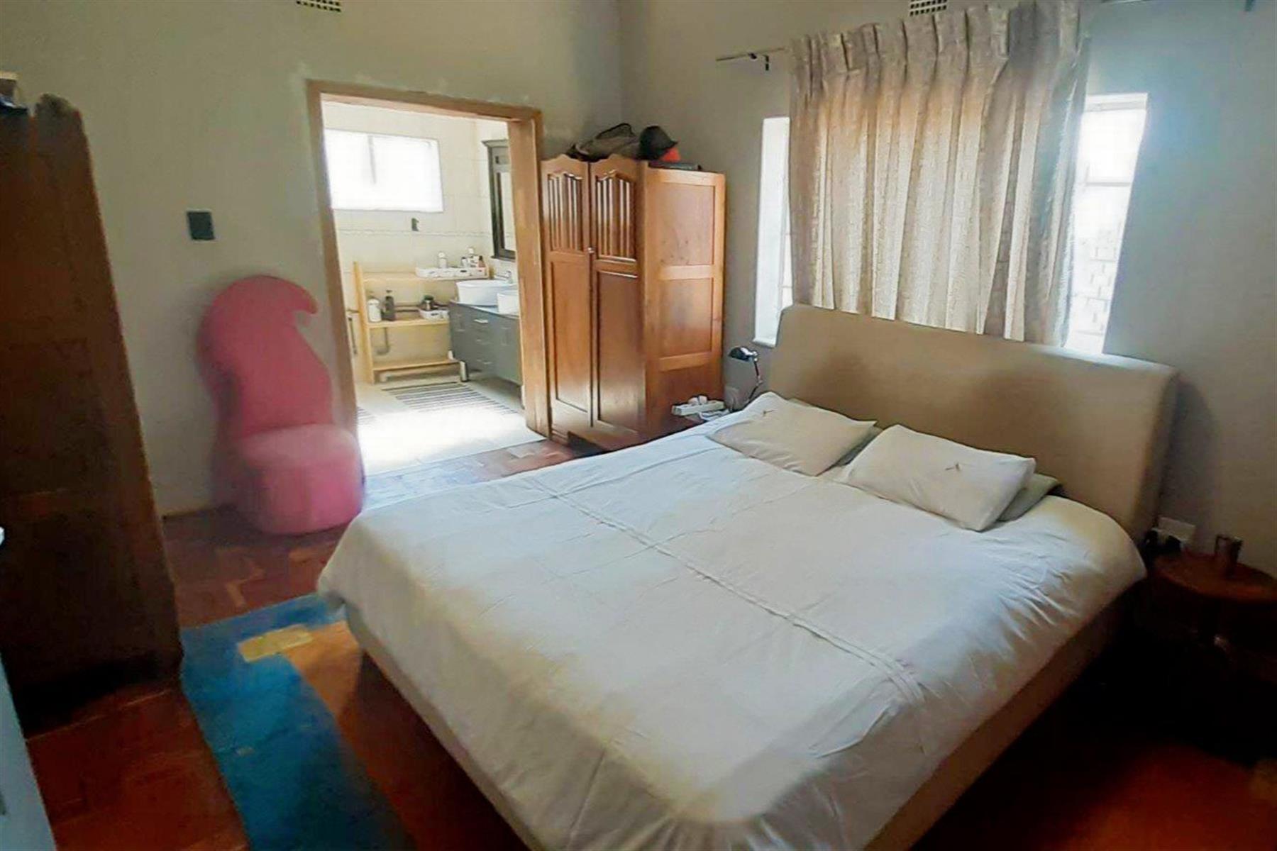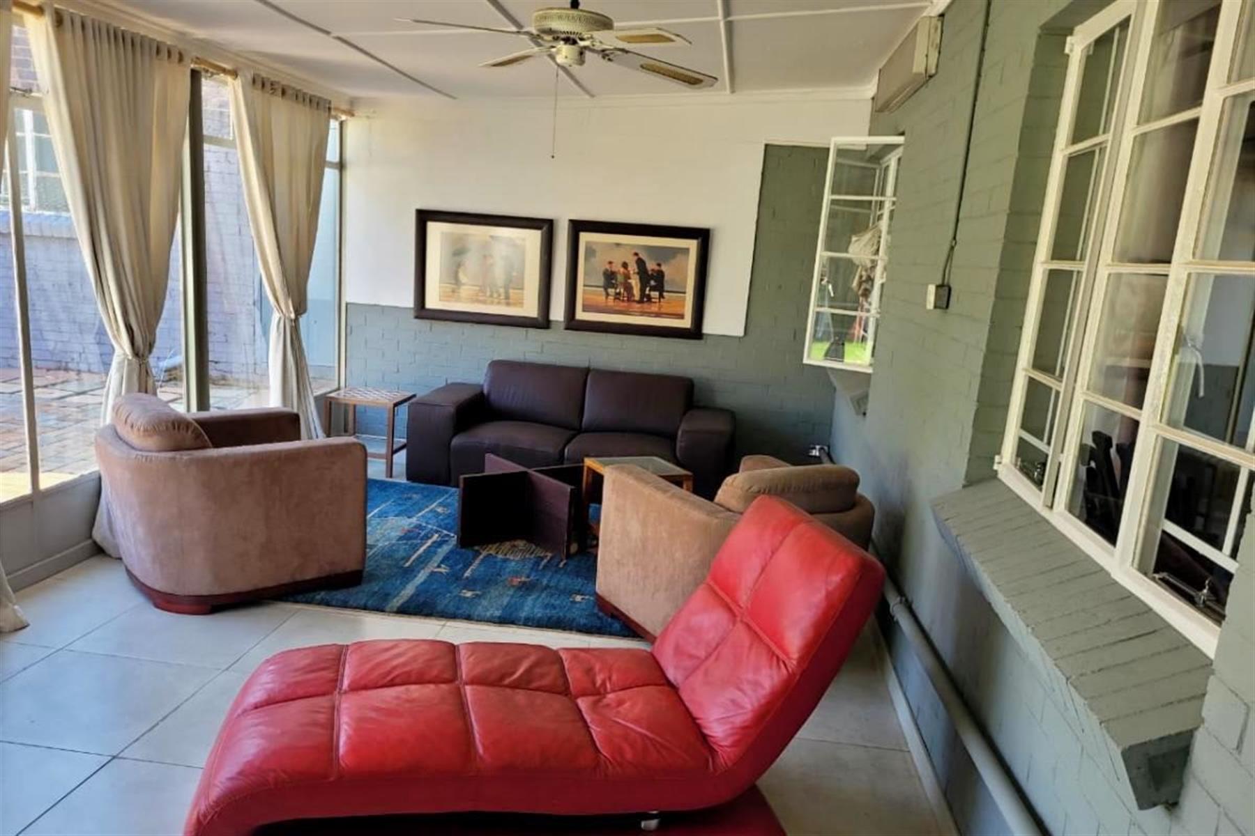The home features a neat, tiled kitchen fitted with built-in cupboards and granite countertops, providing ample workspace and storage. A separate dining room flows effortlessly into the living areas, while the spacious lounge and TV room create versatile spaces for relaxing and entertaining. A sunny sunroom adds an extra living area, perfect for enjoying natural light throughout the day.