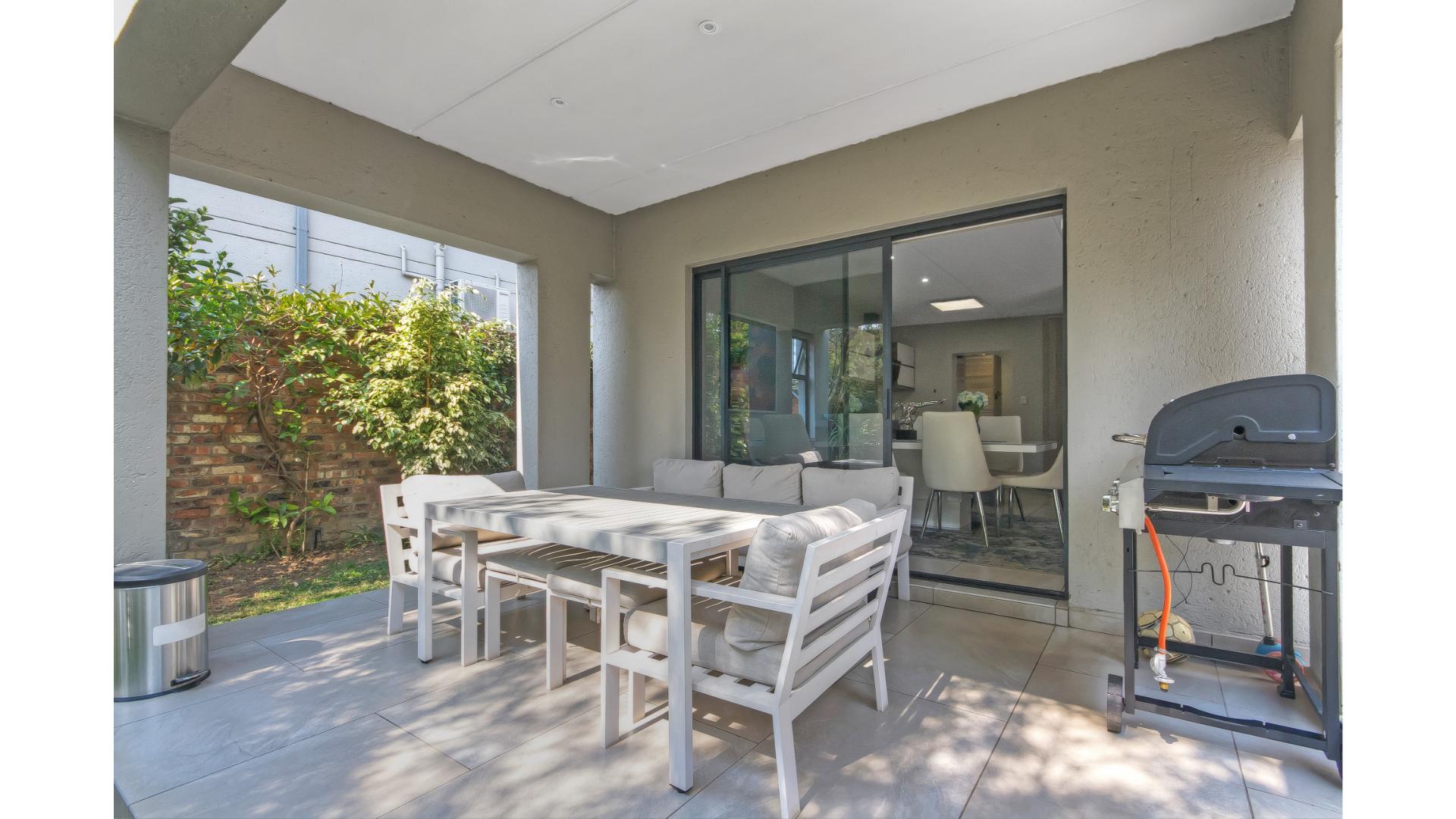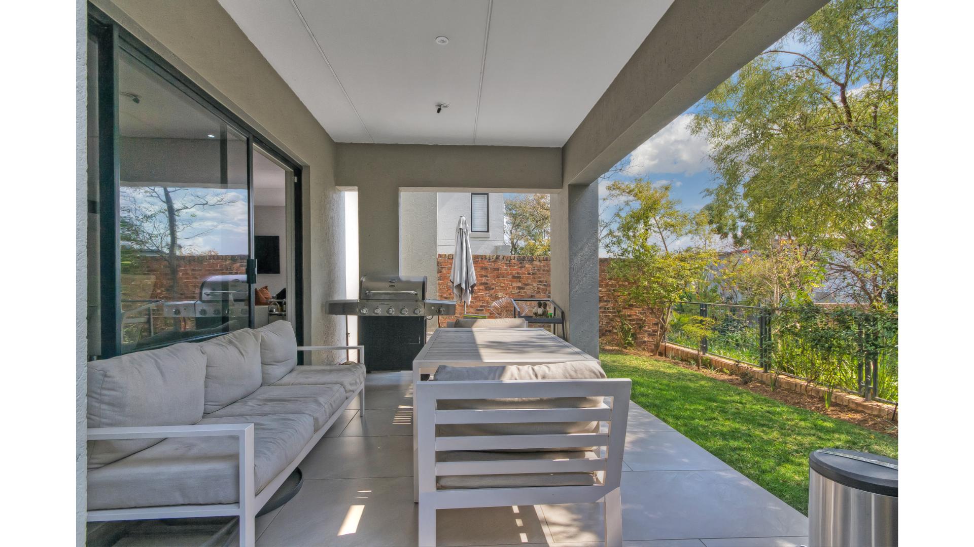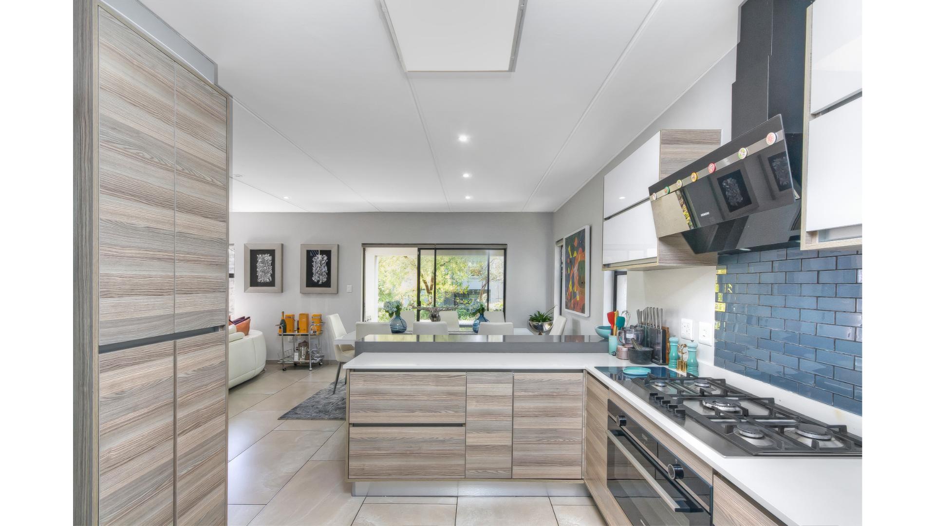 The open-plan kitchen is fitted with a gas stove, seamlessly flowing into the dining area and spacious lounge. The living space extends outdoors to a covered patio, ideal for entertaining.