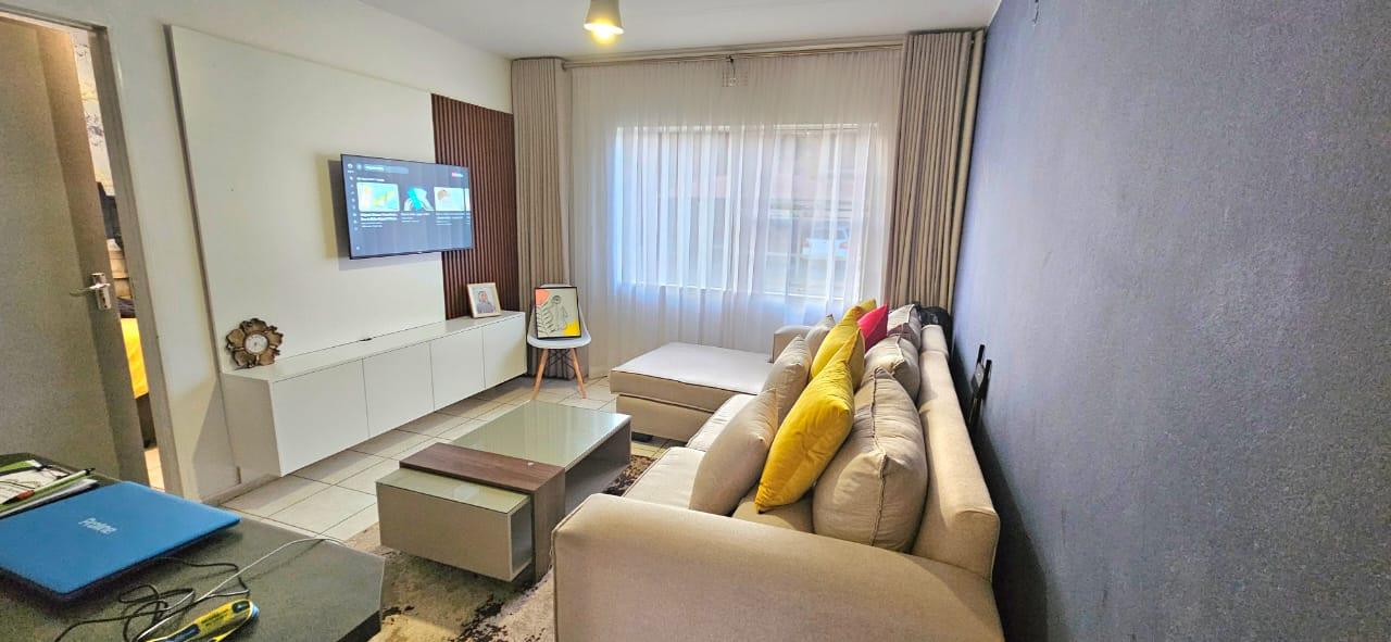1 bedroom with built in cupboards & tiled floor. -1 fully tiled bathroom.
