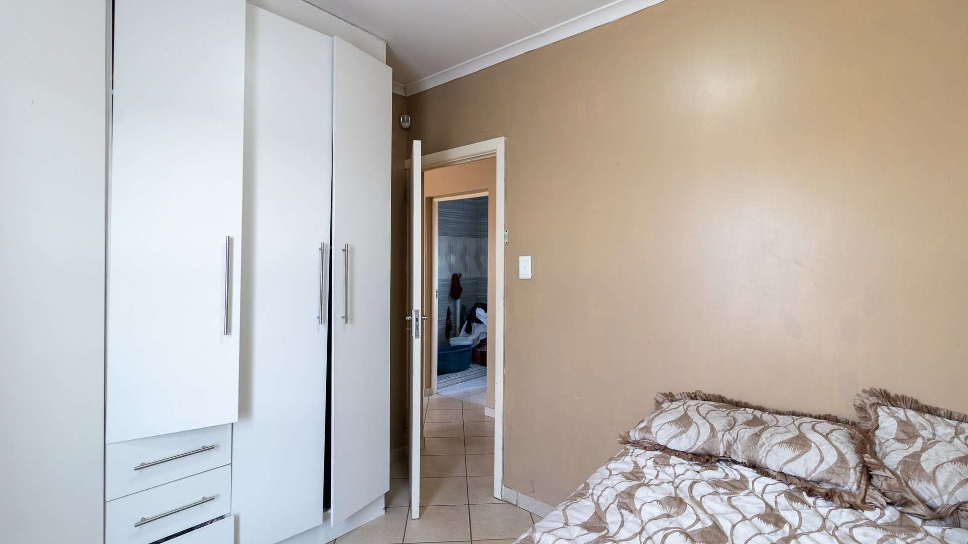 The kitchen is fitted with neat built-in units and offers a practical, functional setup. The home includes a well-maintained bathroom with a shower, ensuring comfort and ease.