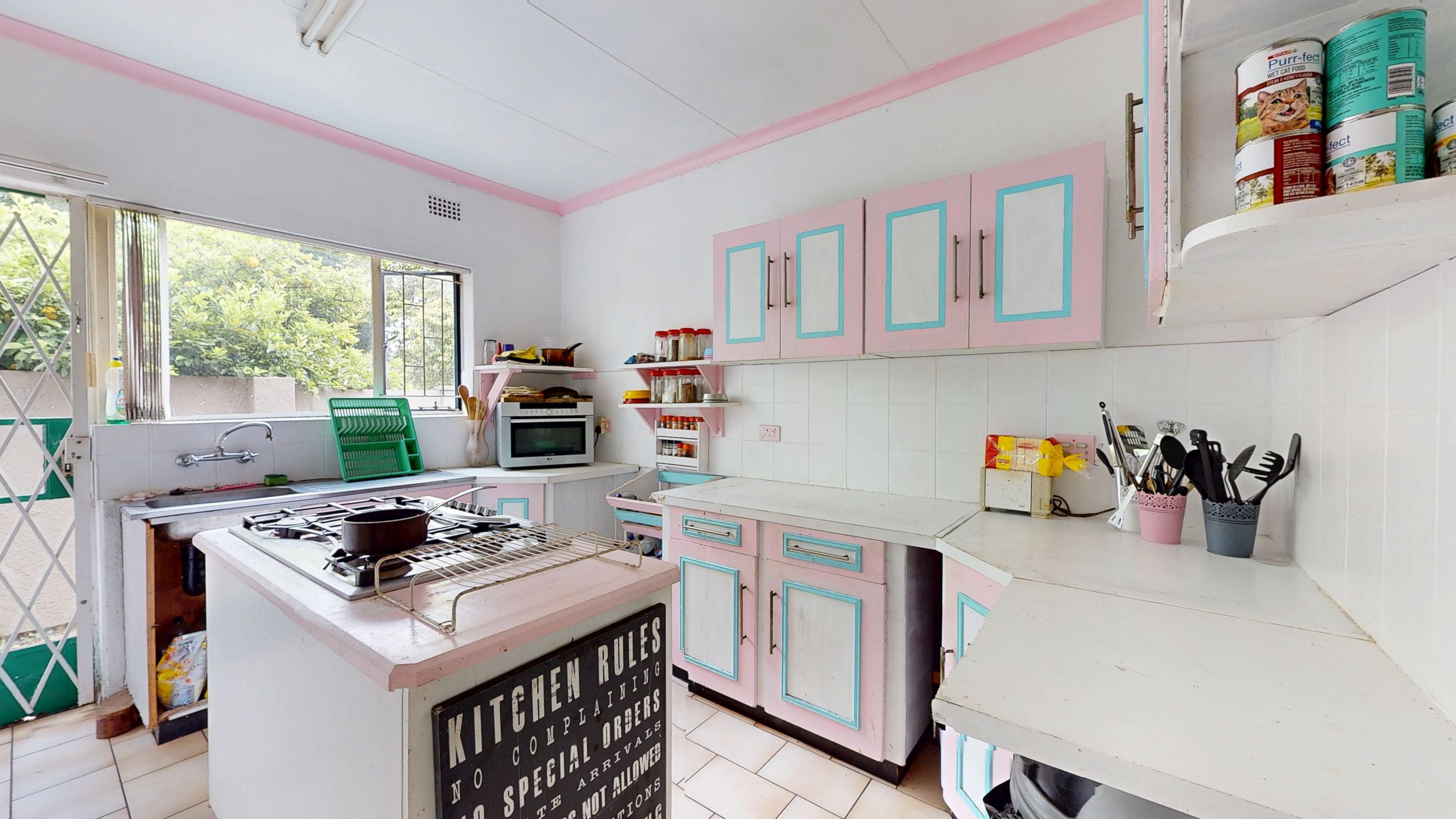 At the heart of the home is an open-plan kitchen and dining area, thoughtfully designed with a gas stove, ample cupboard space, and a central island that doubles as a breakfast nook and workspace.