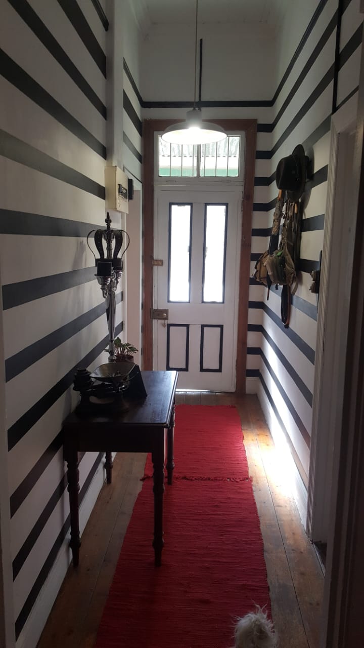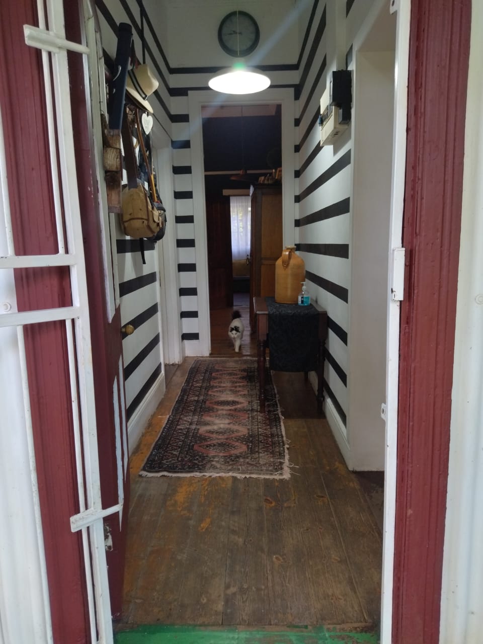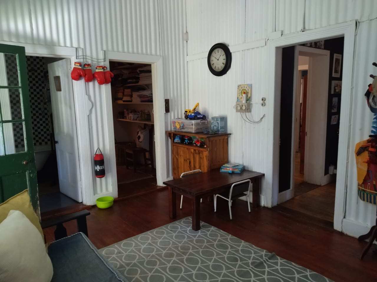 Although the house’s exterior resembles corrugated metal, it is actually constructed with solid, thick brick walls cladded with corrugated iron—giving it a distinctive, durable, and historic look.