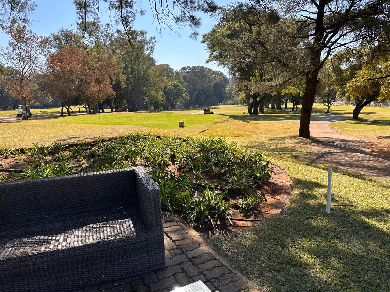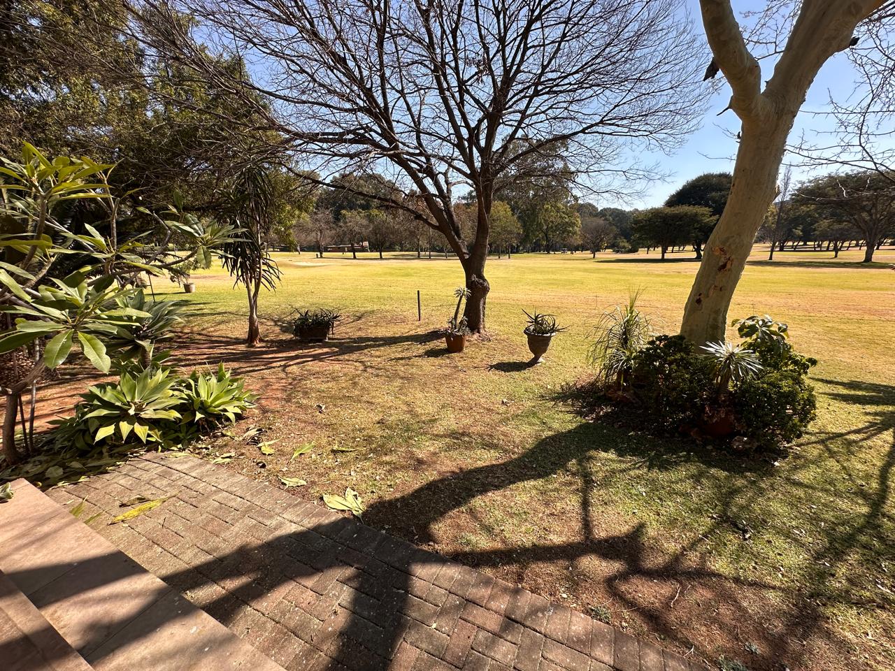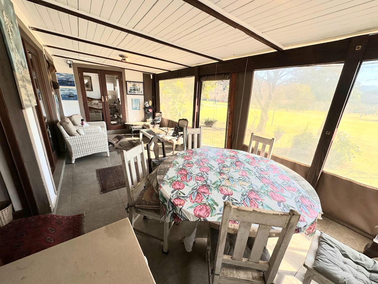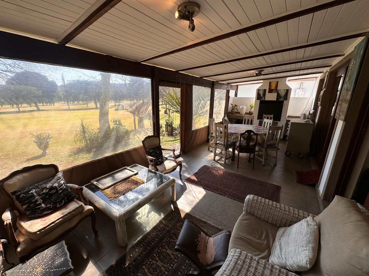 The covered entertainment area includes a built-in braai with large dropdown canvas that overlook the lush golf course—ideal for entertaining or simply enjoying the view.