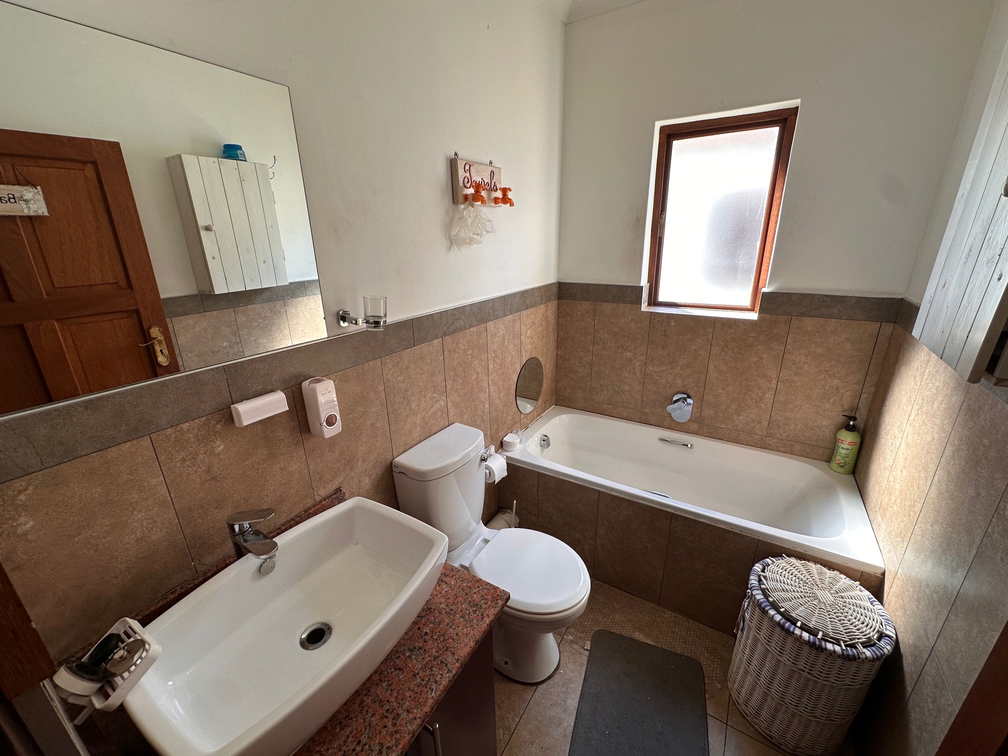 A second bathroom includes a bath, basin, and toilet.