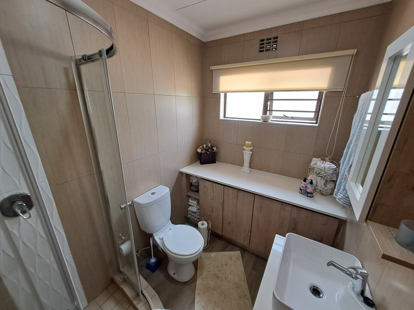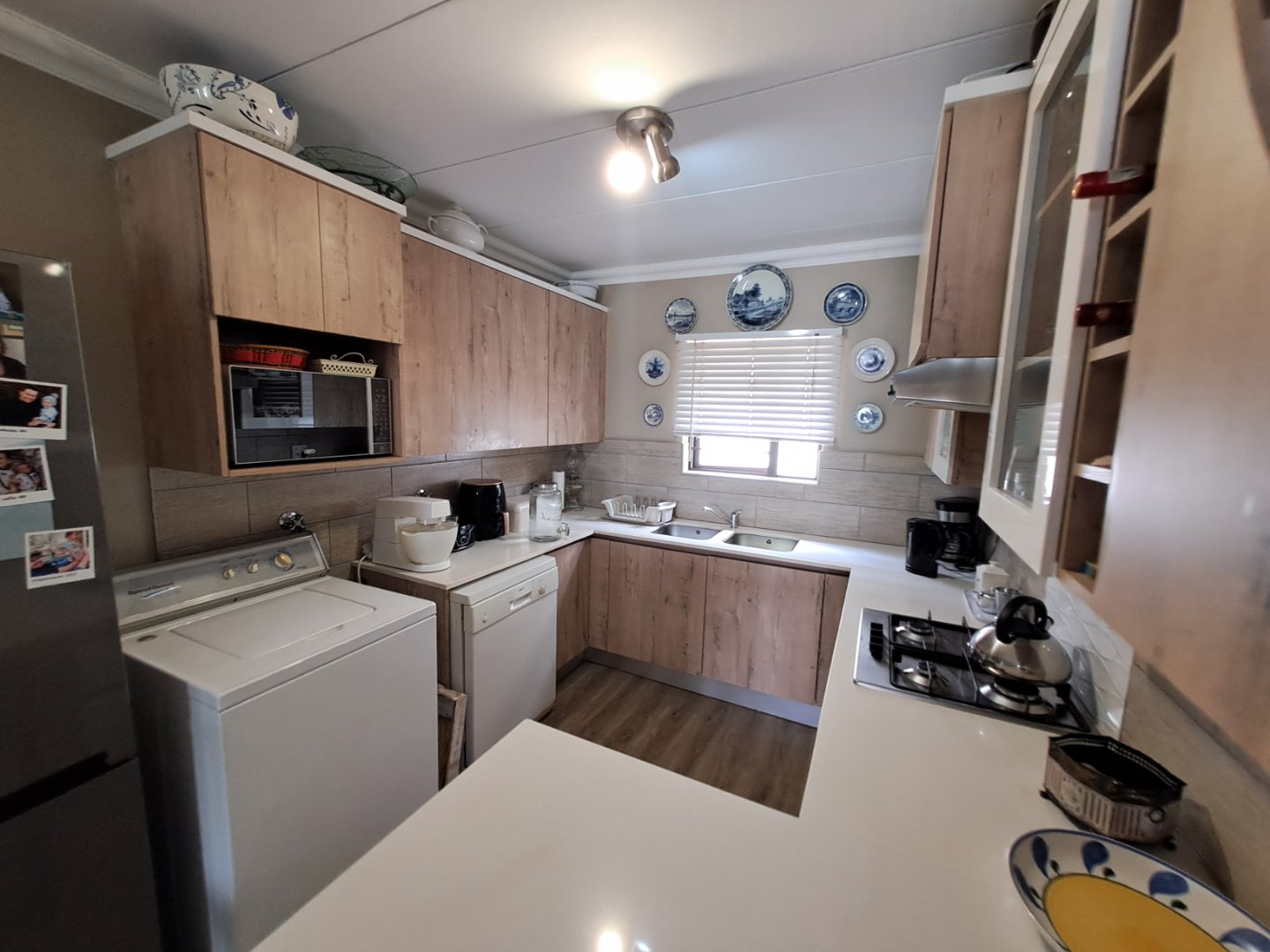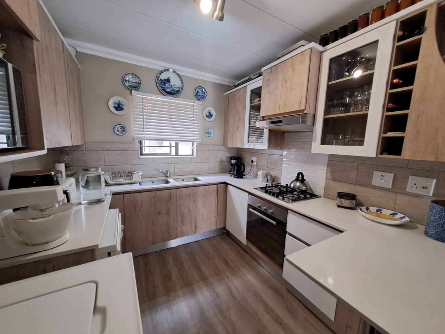The open-plan kitchen and living area is designed to maximise natural light, with tinted windows adding comfort and privacy. The kitchen is fitted with a gas hob, electric oven and energy-efficient gas geyser. Additional features include a 5kW inverter with two 5kW batteries, prepaid electricity, and the benefit of a loadshedding-free estate.