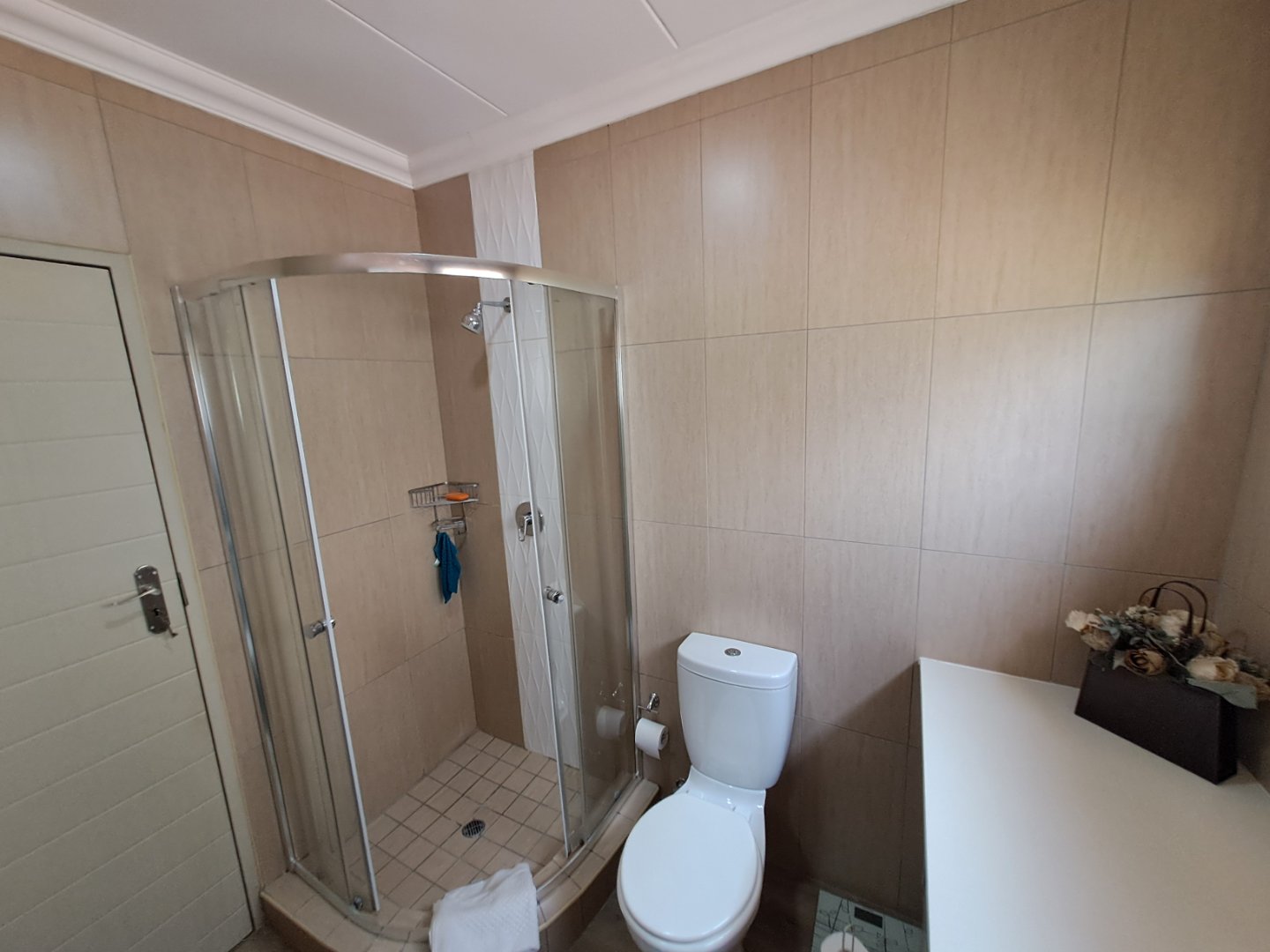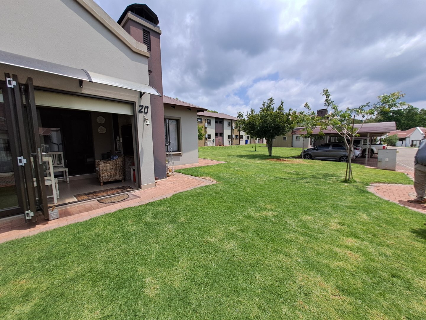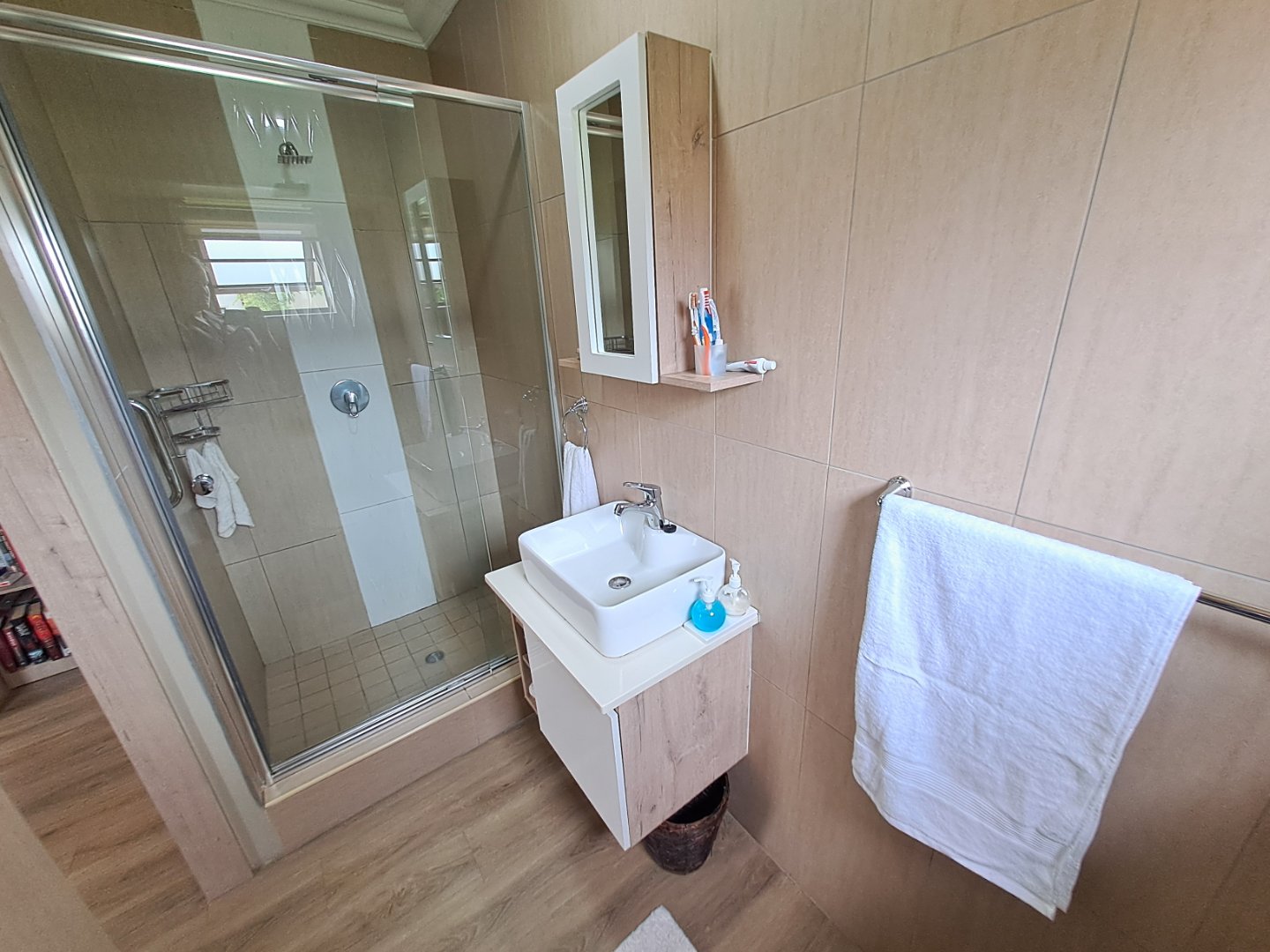 The open-plan kitchen and living area is designed to maximise natural light, with tinted windows adding comfort and privacy. The kitchen is fitted with a gas hob, electric oven and energy-efficient gas geyser. Additional features include a 5kW inverter with two 5kW batteries, prepaid electricity, and the benefit of a loadshedding-free estate.