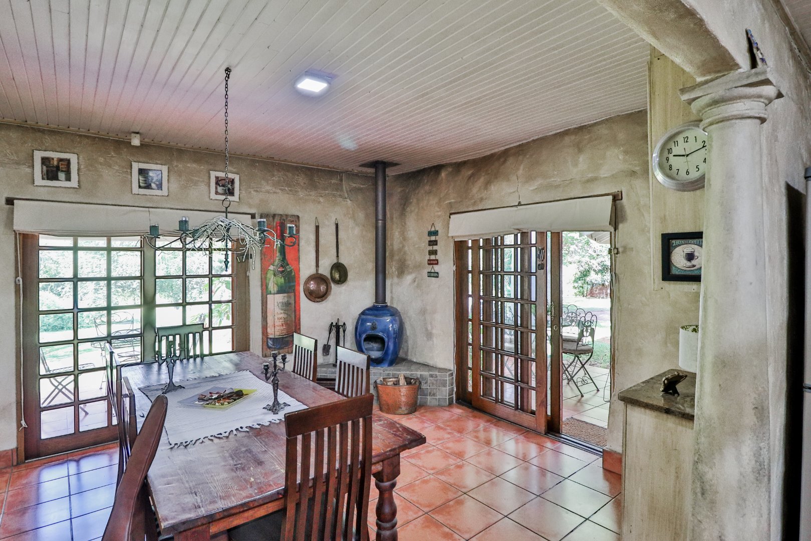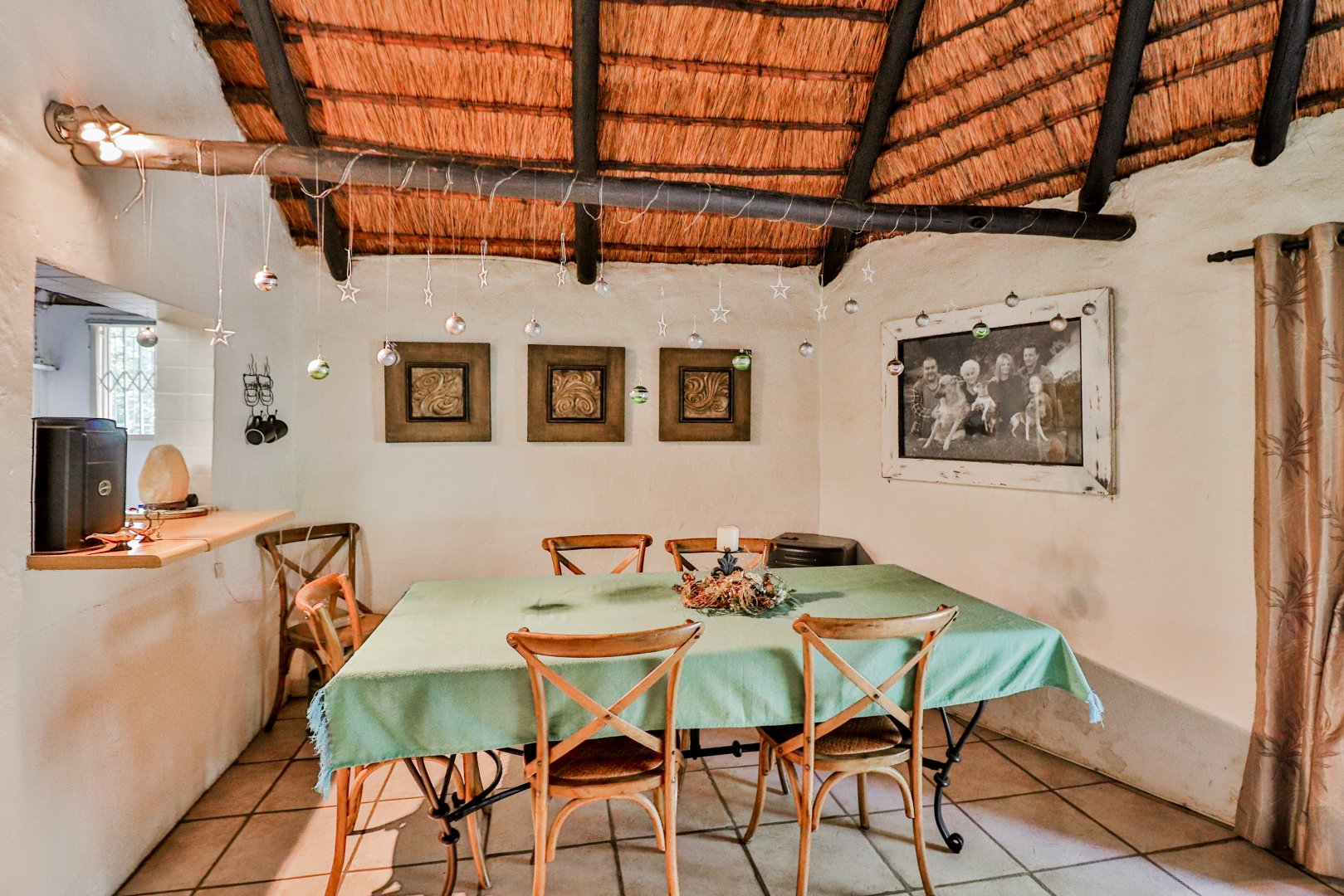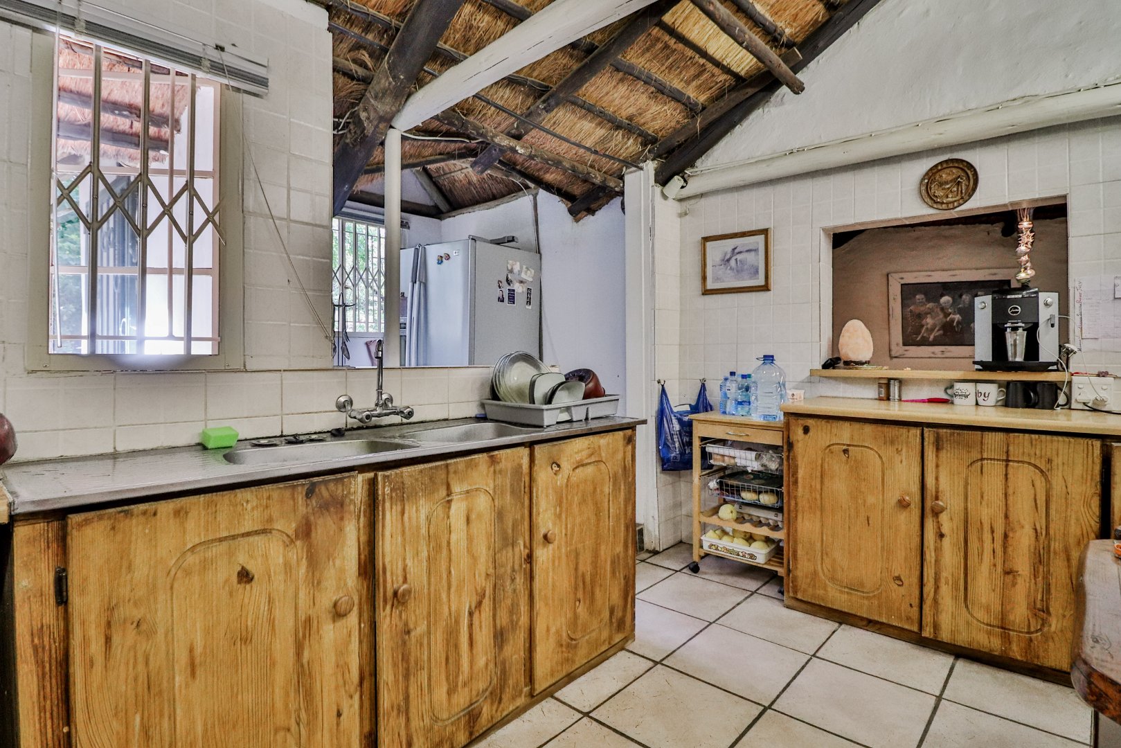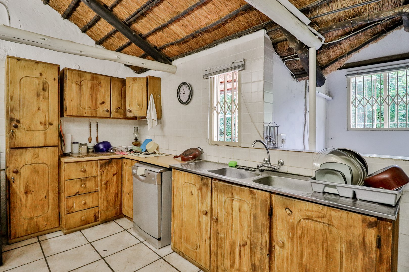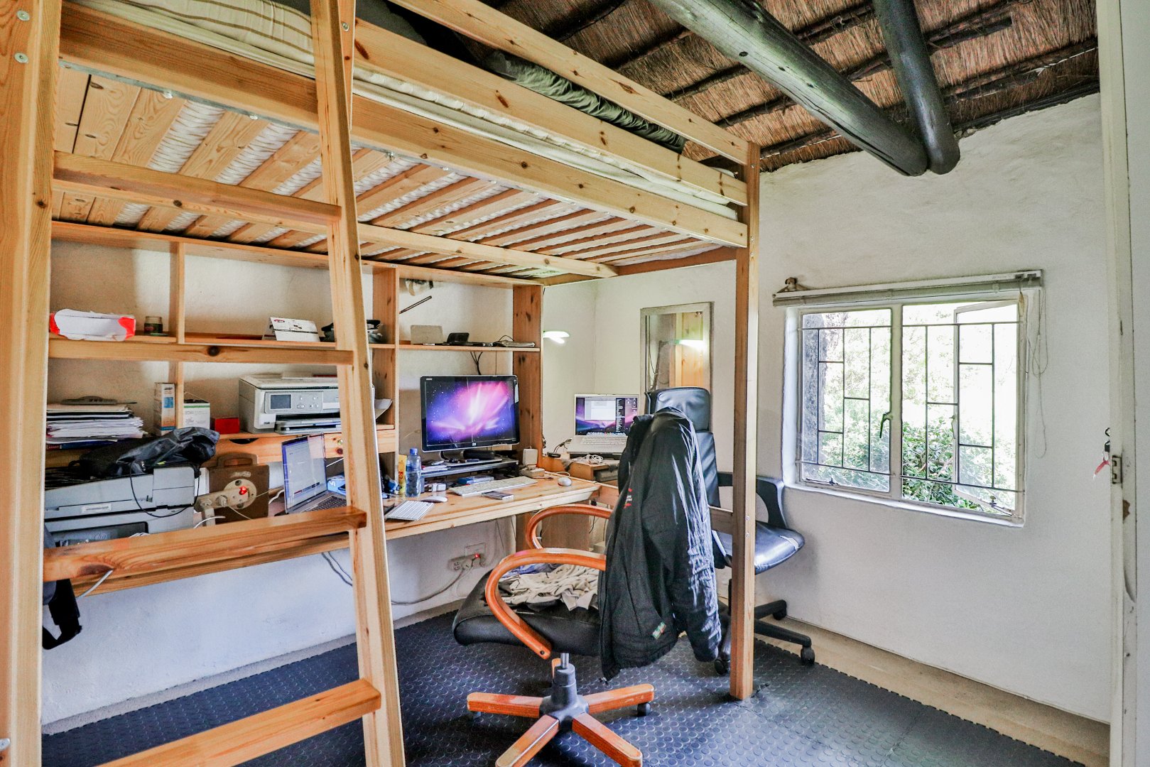 The main house features three bedrooms, two bathrooms, a spacious double-length garage, a heated swimming pool with a cover, a generous entertainment area with a pool table, a custom-built study, a dining room, and a kitchen with bespoke cabinets. Notably, all exterior wooden sliding doors and windows are crafted from Nlulu wood (iron-embedded frames), and the kitchen boasts marble countertops, under-counter space for appliances, a pantry, and a gas stove. The house is predominantly floored with tile and laminate, and its custom-made cabinets and bookcases are a testament to exceptional craftsmanship. The study features a stunning large built-in bookcase with glass, and the oversized desk with four roomy drawers was also custom-built. A charming rustic atmosphere is created in the TV room with unique wallpaper, and the hand-painted dining room cabinets add character. The house utilizes a septic tank and French drain system.