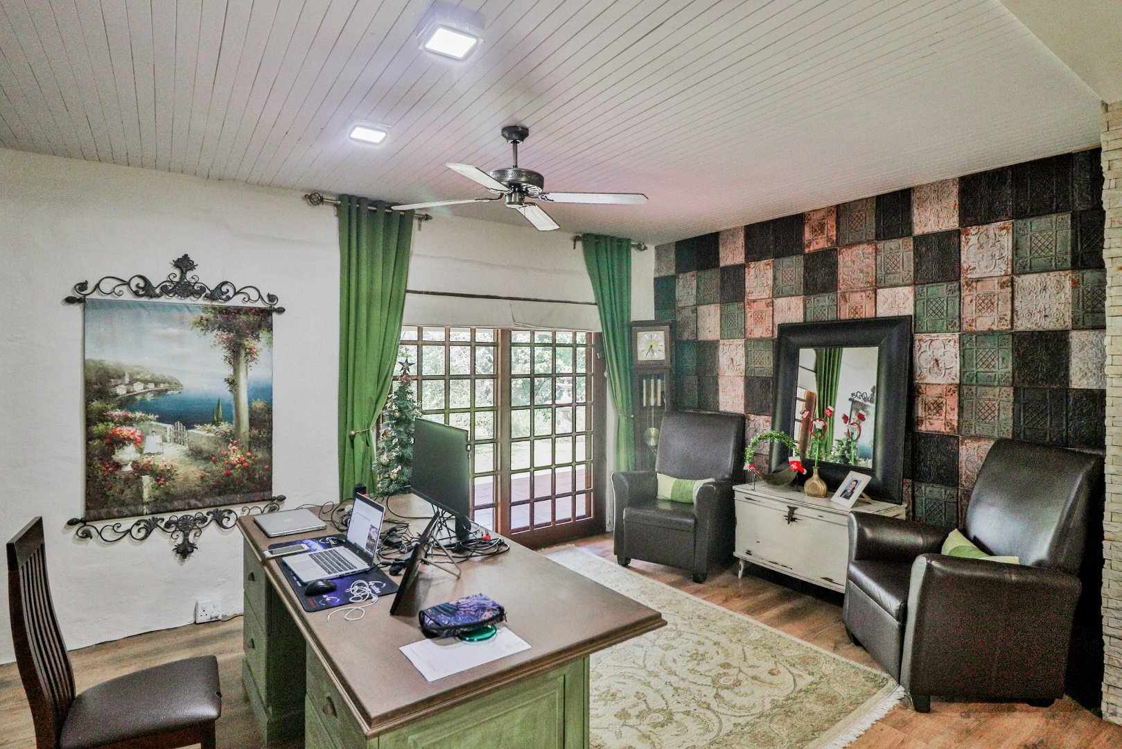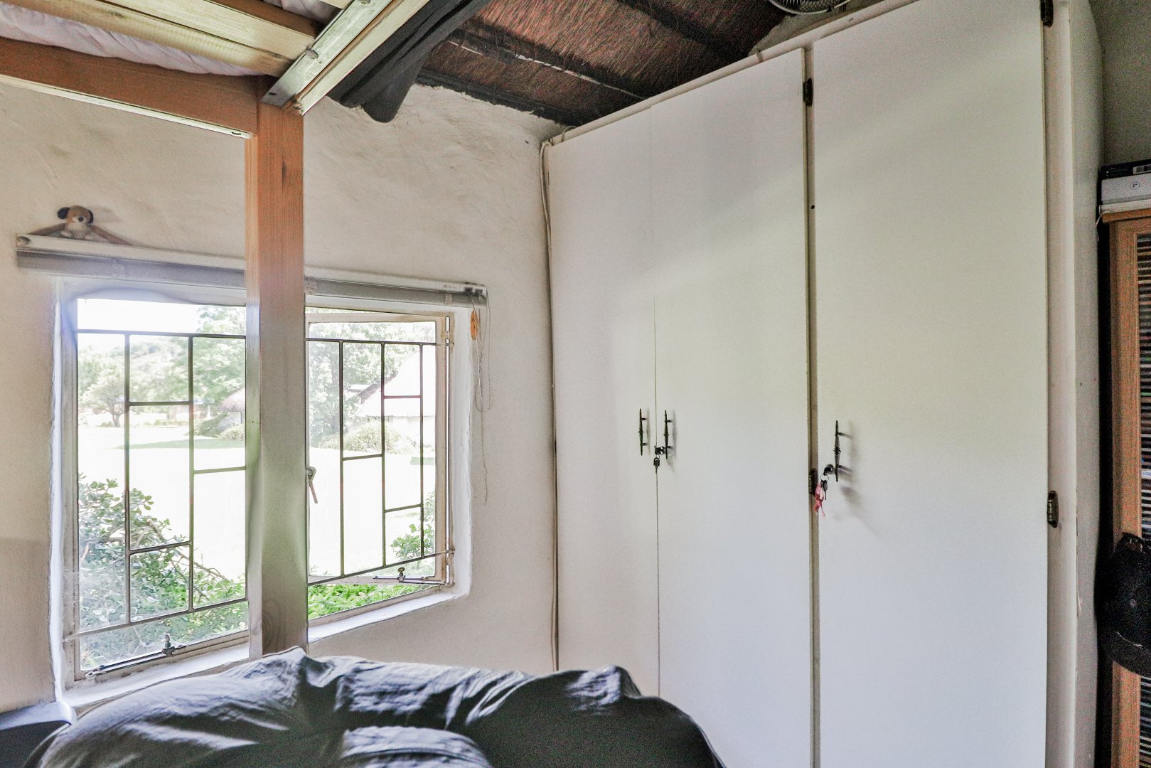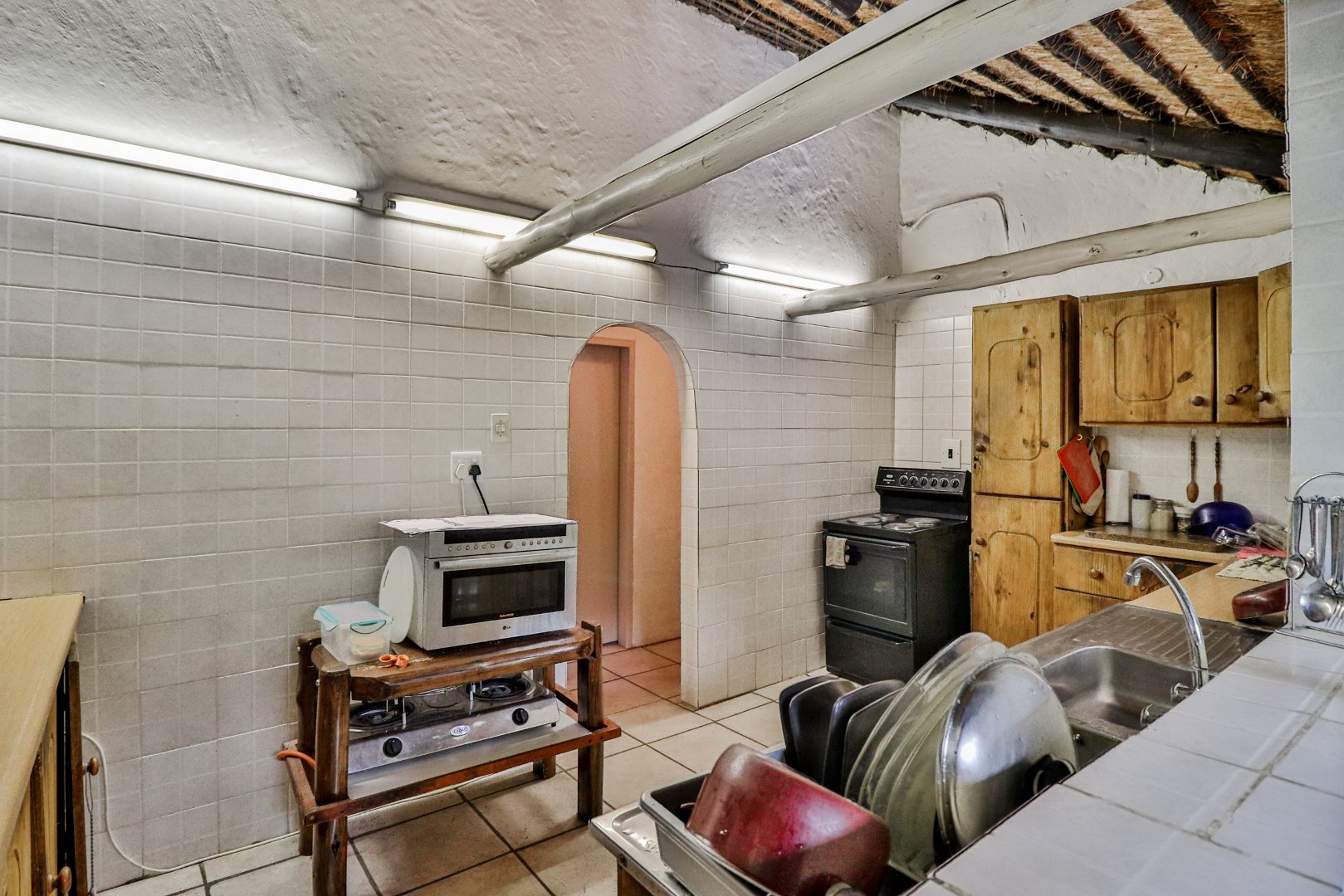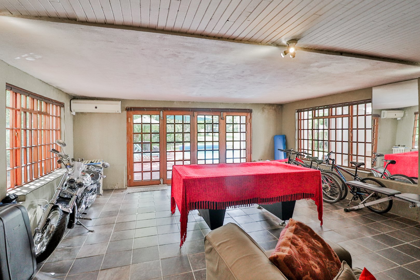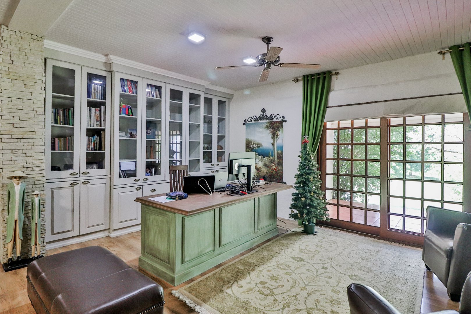 The main house features three bedrooms, two bathrooms, a spacious double-length garage, a heated swimming pool with a cover, a generous entertainment area with a pool table, a custom-built study, a dining room, and a kitchen with bespoke cabinets. Notably, all exterior wooden sliding doors and windows are crafted from Nlulu wood (iron-embedded frames), and the kitchen boasts marble countertops, under-counter space for appliances, a pantry, and a gas stove. The house is predominantly floored with tile and laminate, and its custom-made cabinets and bookcases are a testament to exceptional craftsmanship. The study features a stunning large built-in bookcase with glass, and the oversized desk with four roomy drawers was also custom-built. A charming rustic atmosphere is created in the TV room with unique wallpaper, and the hand-painted dining room cabinets add character. The house utilizes a septic tank and French drain system.
