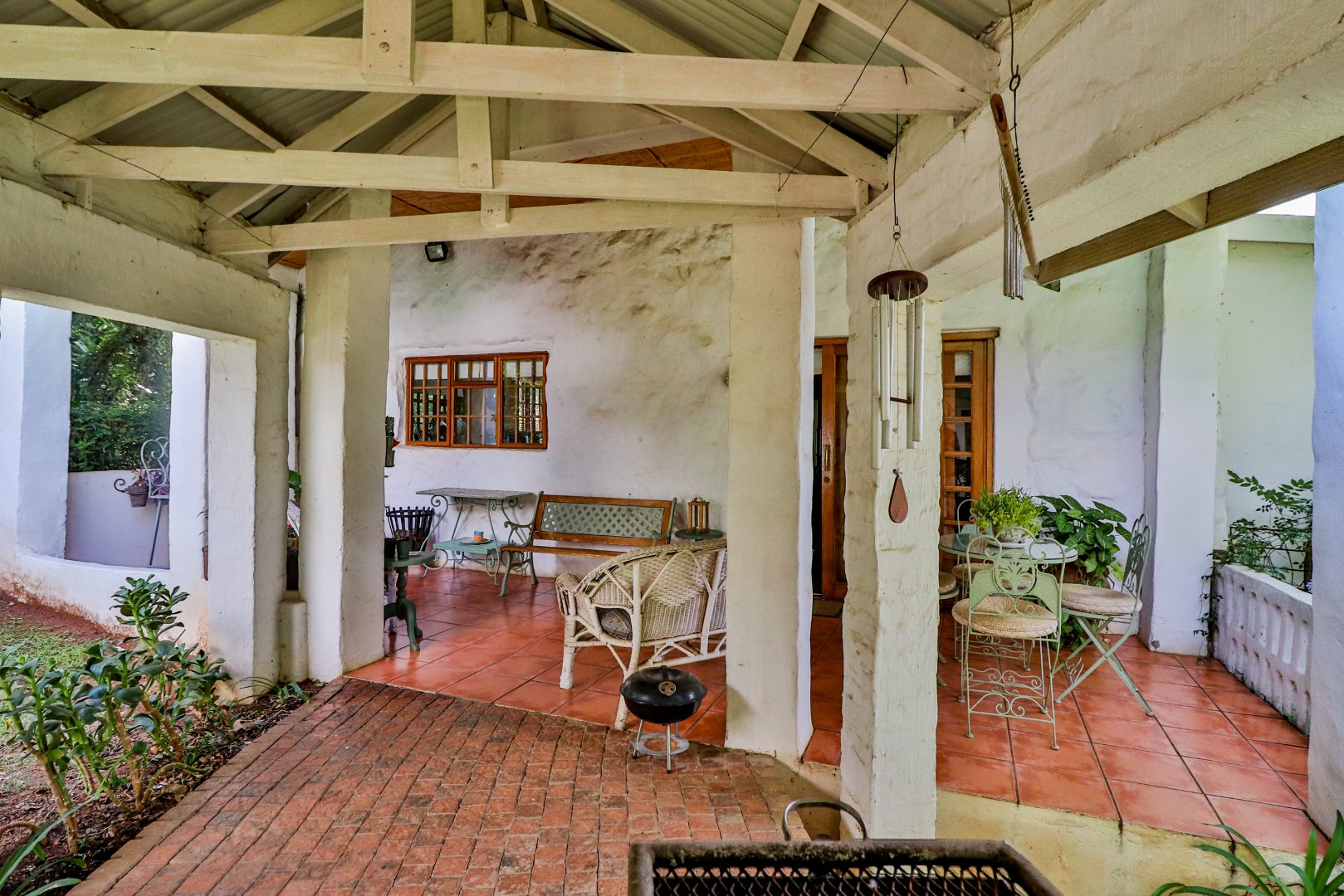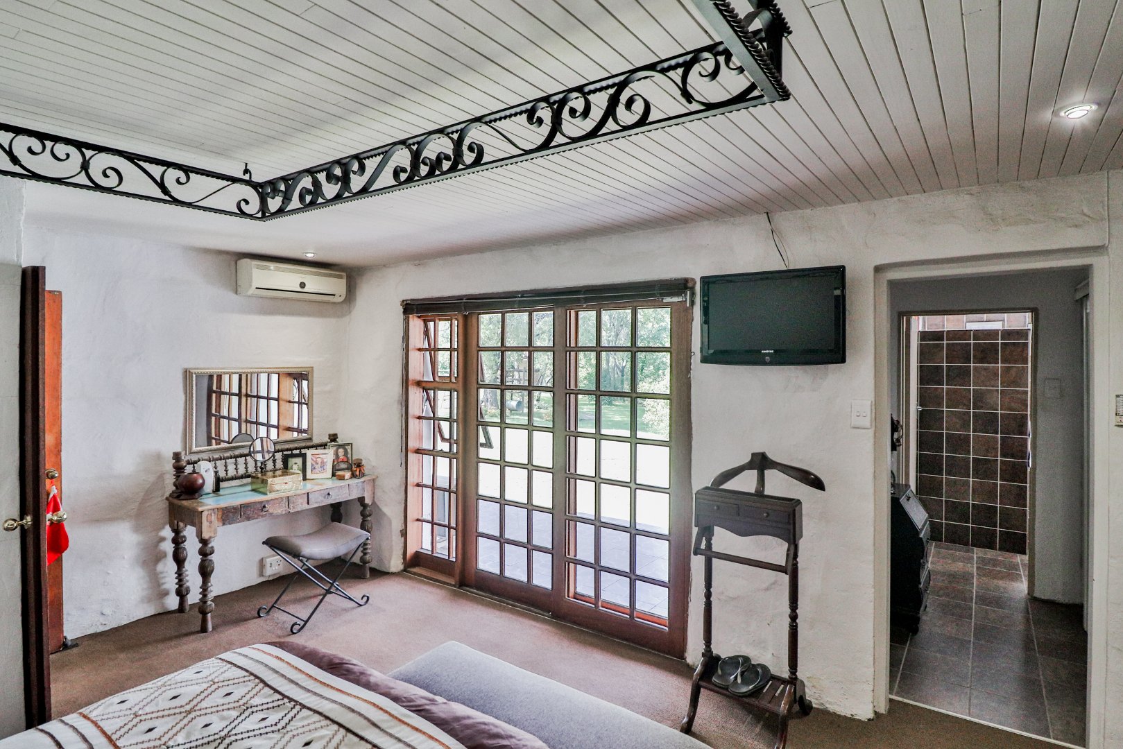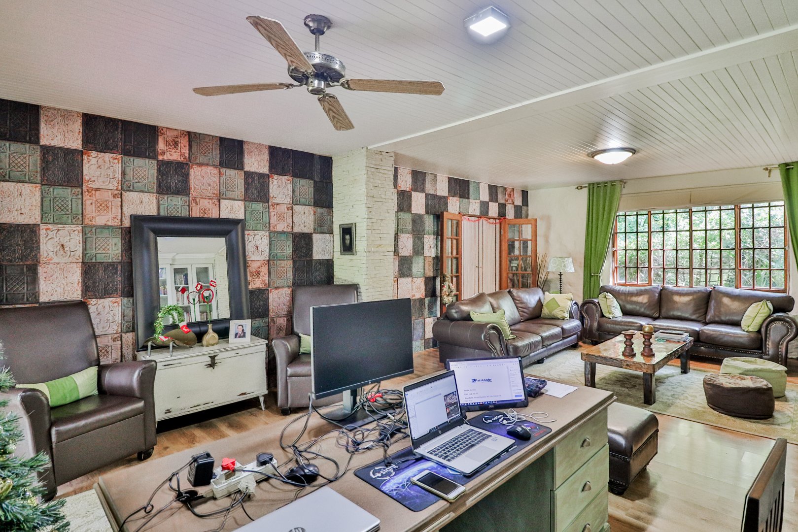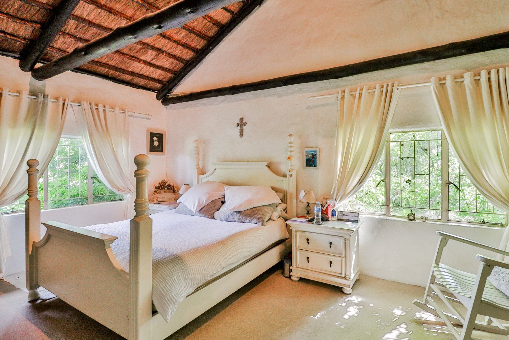 The main house features three bedrooms, two bathrooms, a spacious double-length garage, a heated swimming pool with a cover, a generous entertainment area with a pool table, a custom-built study, a dining room, and a kitchen with bespoke cabinets. Notably, all exterior wooden sliding doors and windows are crafted from Nlulu wood (iron-embedded frames), and the kitchen boasts marble countertops, under-counter space for appliances, a pantry, and a gas stove. The house is predominantly floored with tile and laminate, and its custom-made cabinets and bookcases are a testament to exceptional craftsmanship. The study features a stunning large built-in bookcase with glass, and the oversized desk with four roomy drawers was also custom-built. A charming rustic atmosphere is created in the TV room with unique wallpaper, and the hand-painted dining room cabinets add character. The house utilizes a septic tank and French drain system.