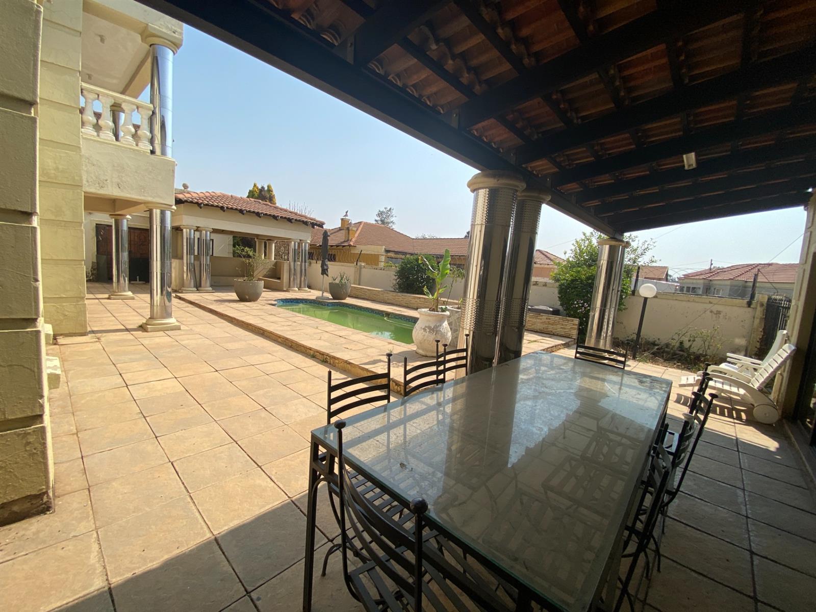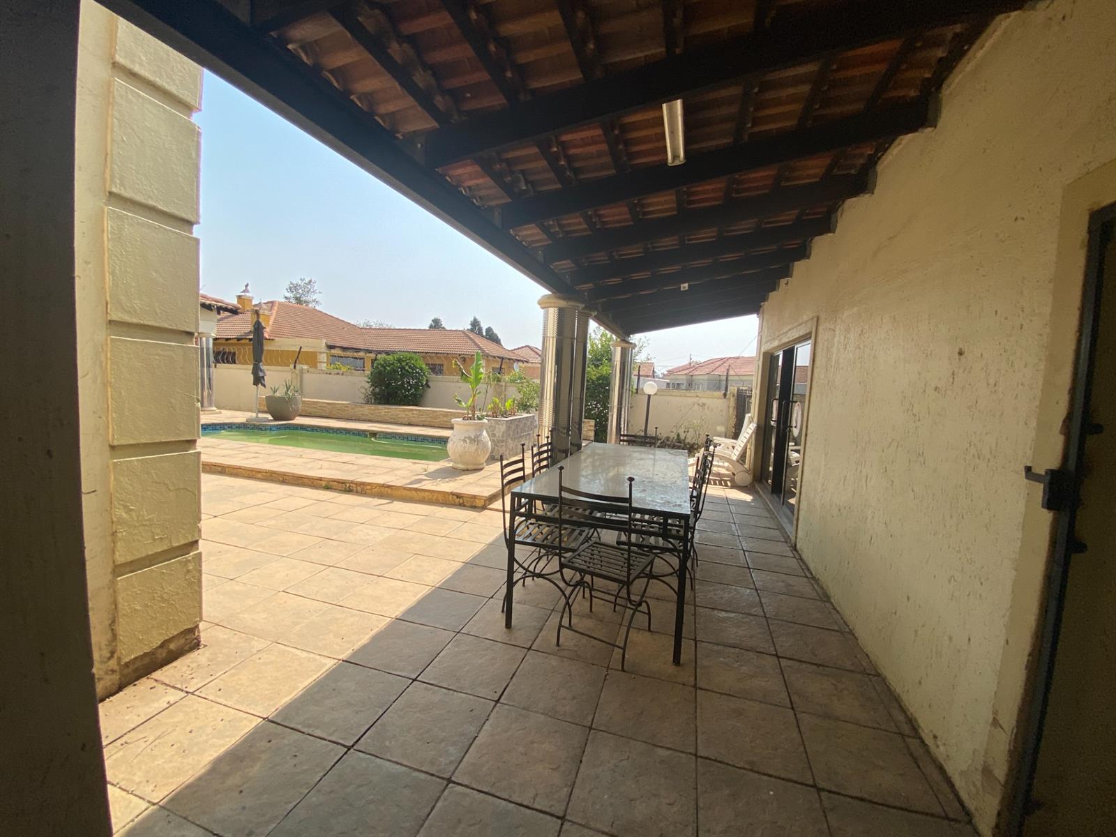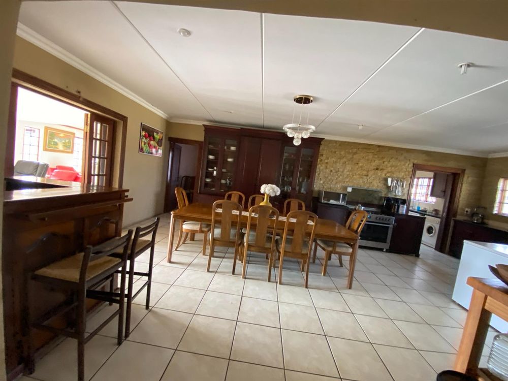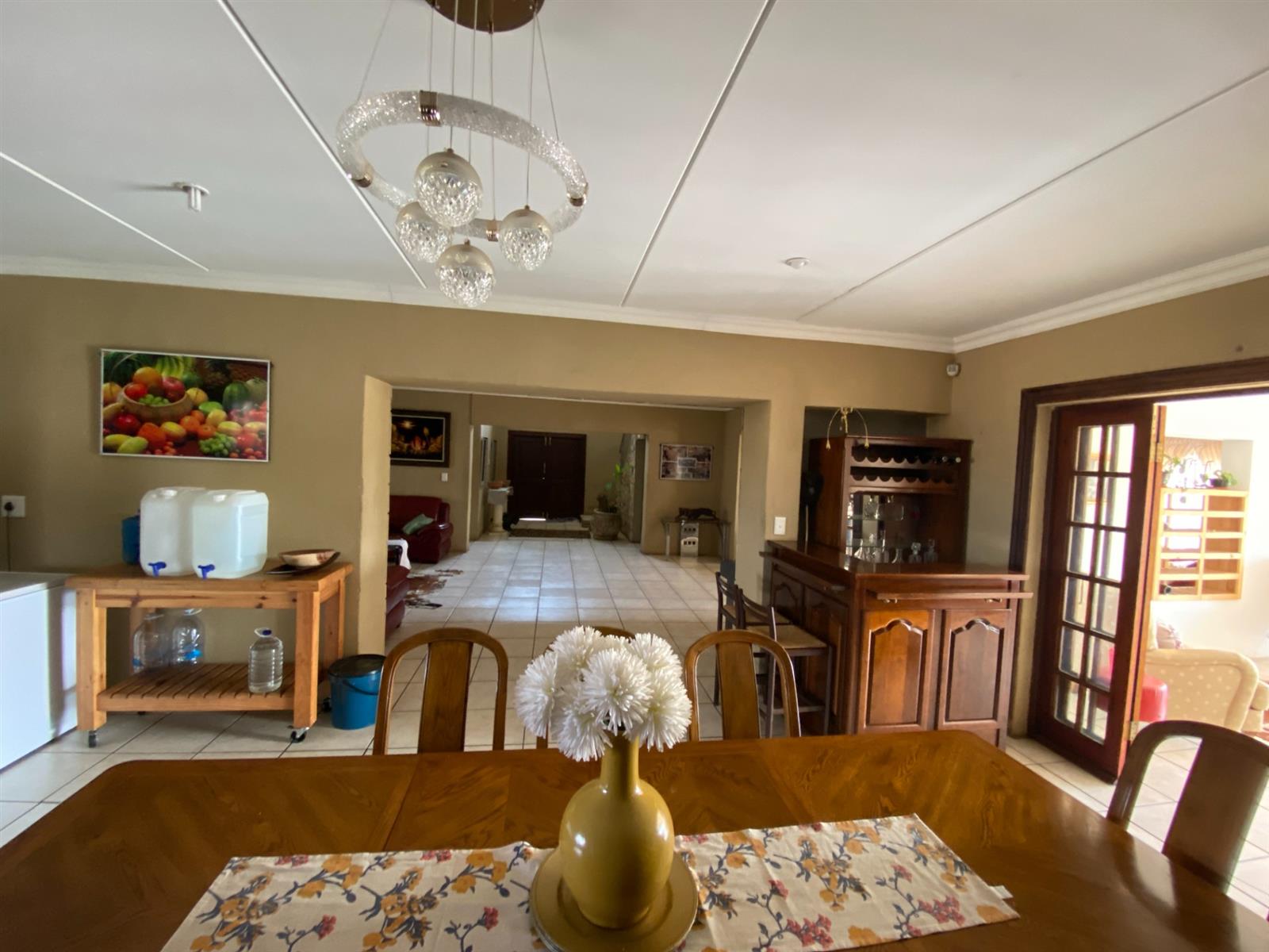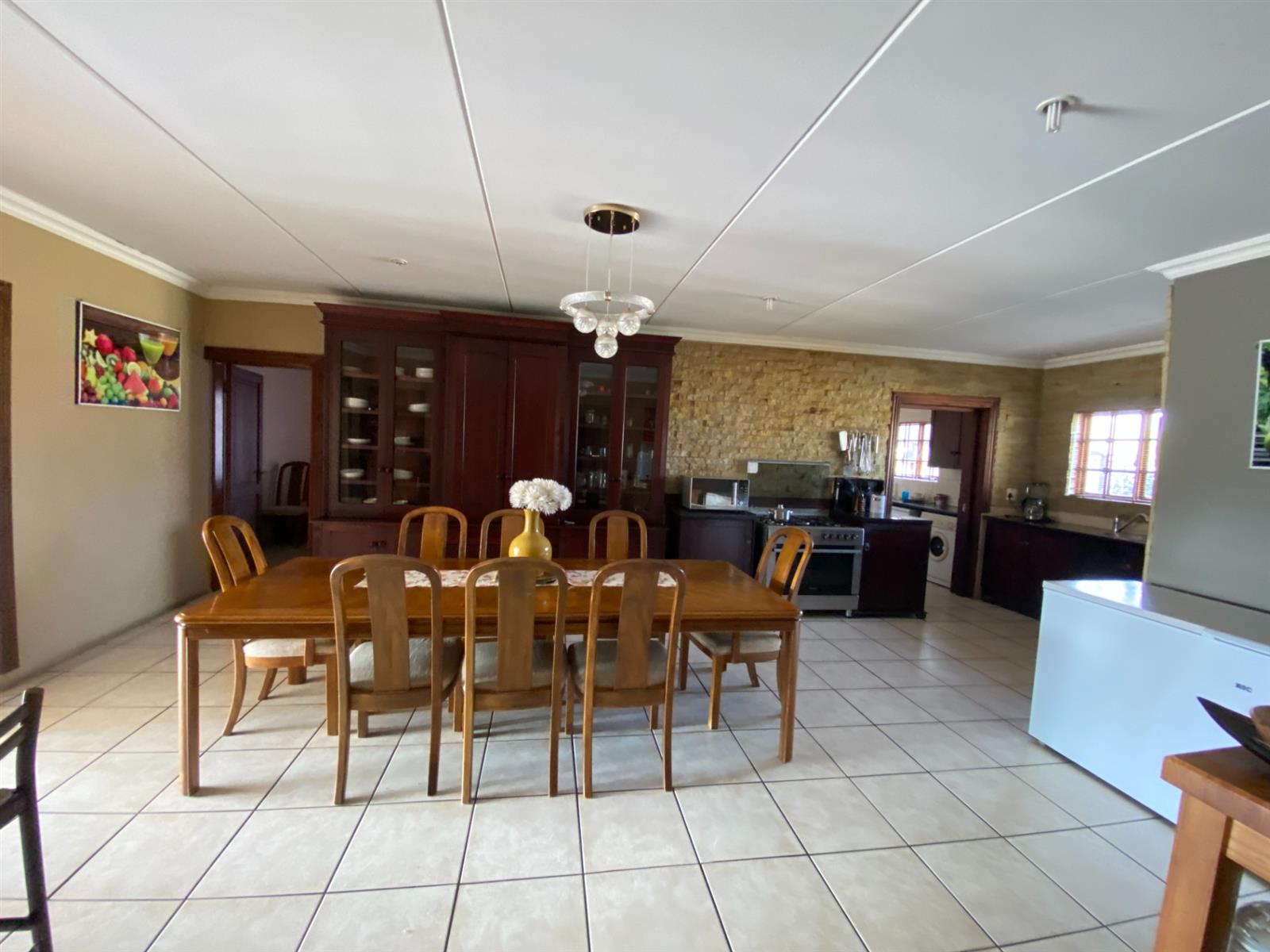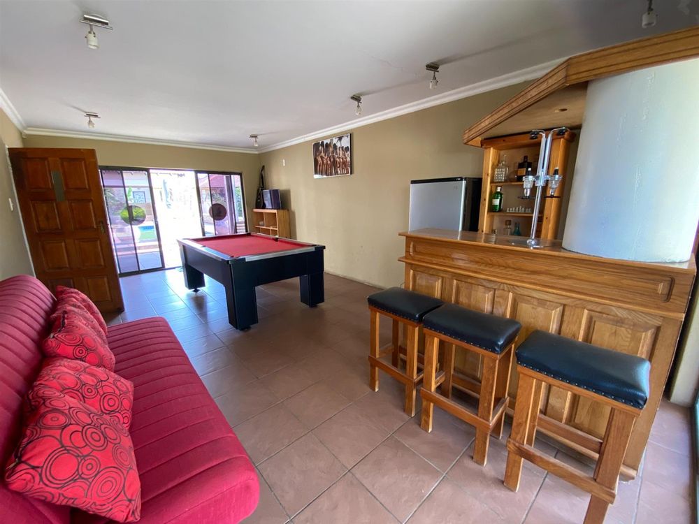 As you enter, you are welcomed by a double volume entrance hall which draws you to an entertainers dream of 2 well furnished living areas. The hall flows into the dining room area with a bar tucked neatly in a corner just outside of another 2 living areas with sliding doors that open out into the patio with the swimming pool and a lapa.