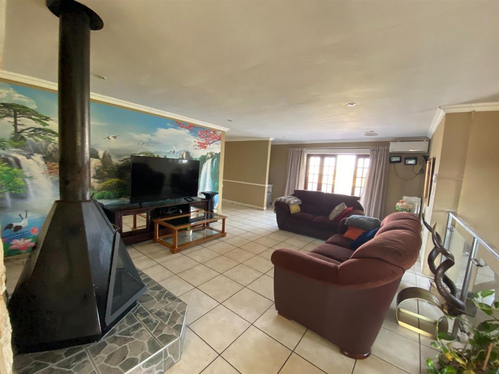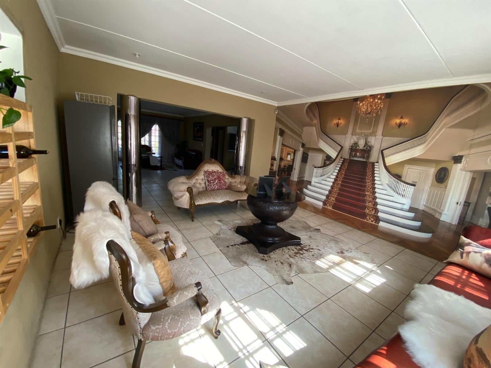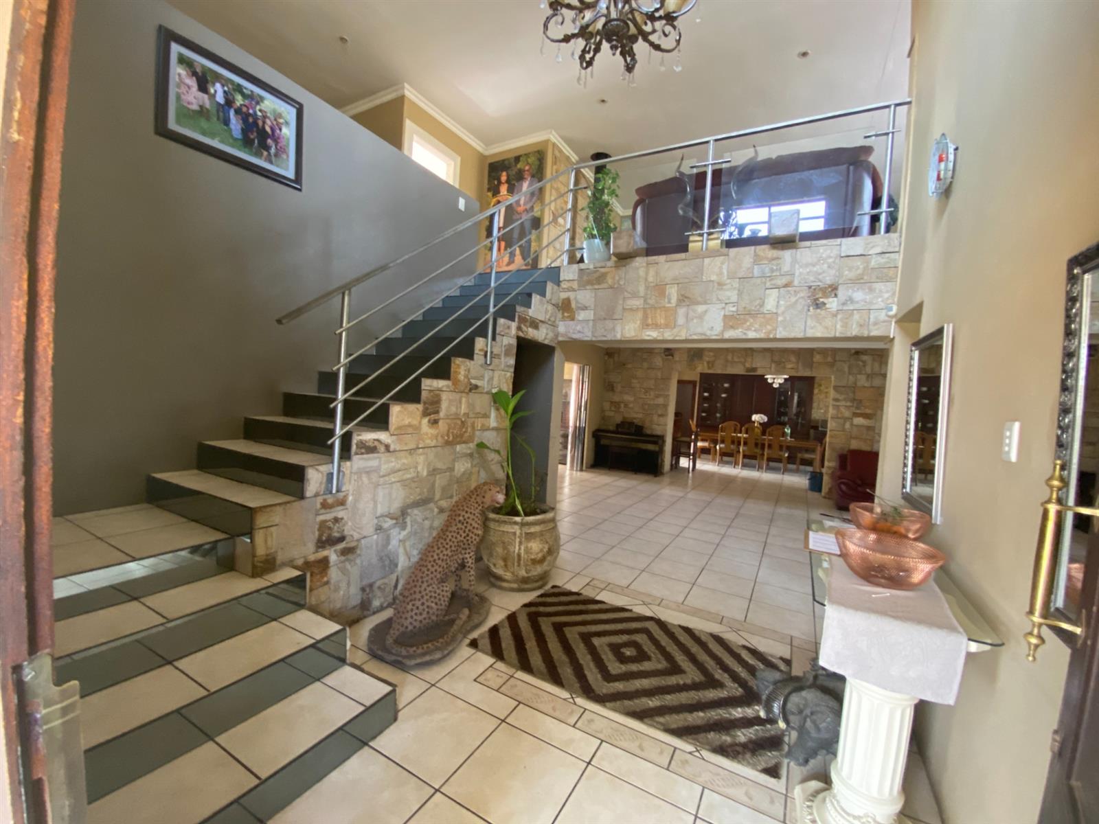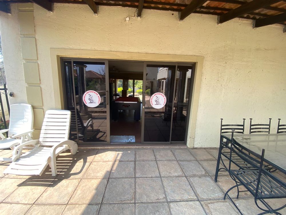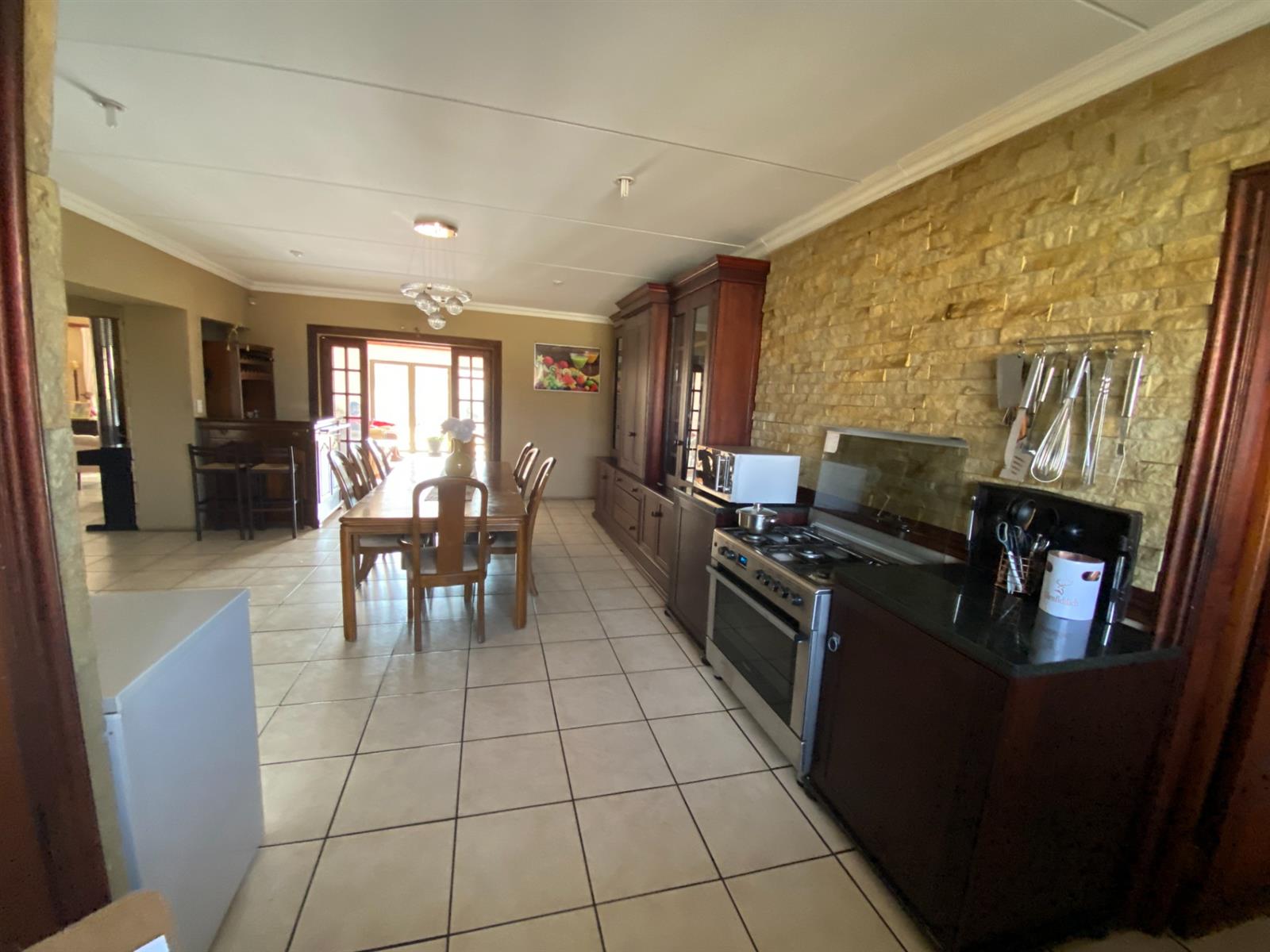 As you enter, you are welcomed by a double volume entrance hall which draws you to an entertainers dream of 2 well furnished living areas. The hall flows into the dining room area with a bar tucked neatly in a corner just outside of another 2 living areas with sliding doors that open out into the patio with the swimming pool and a lapa.