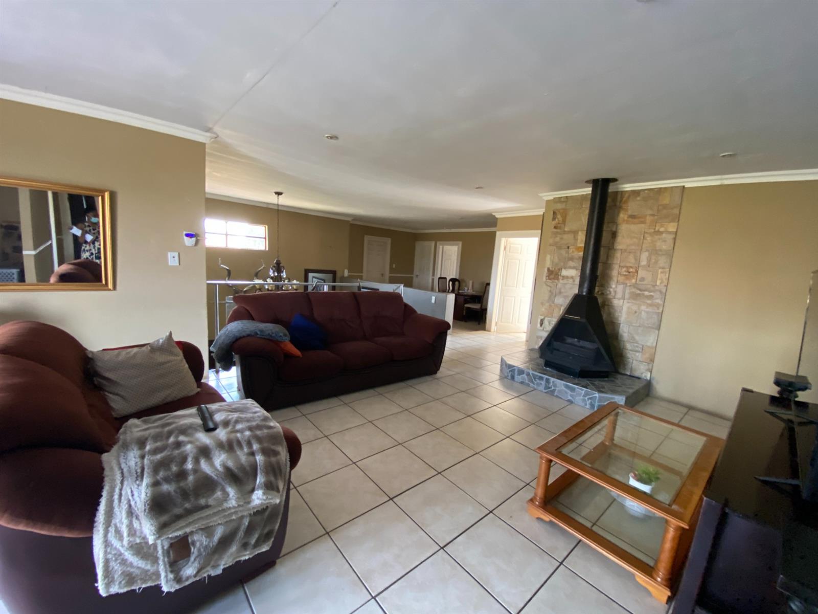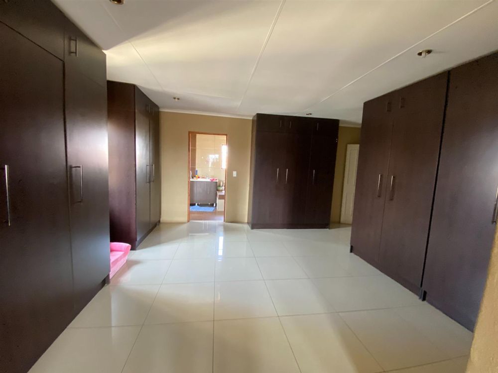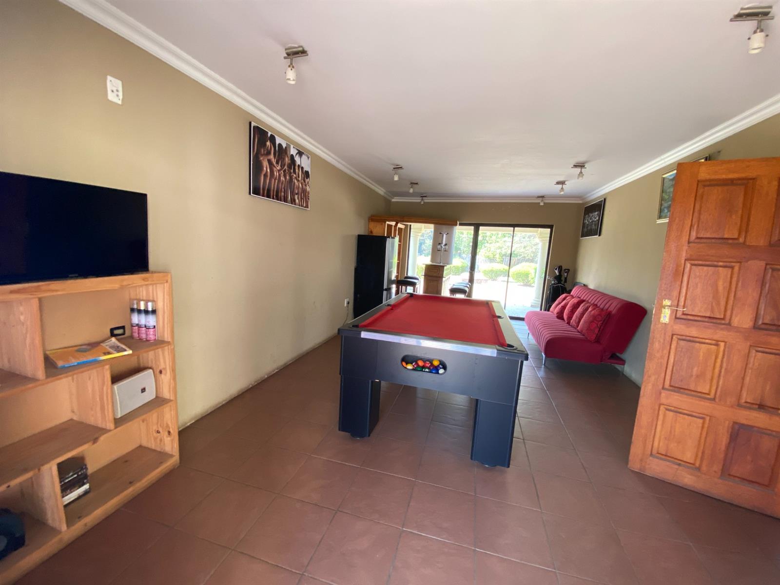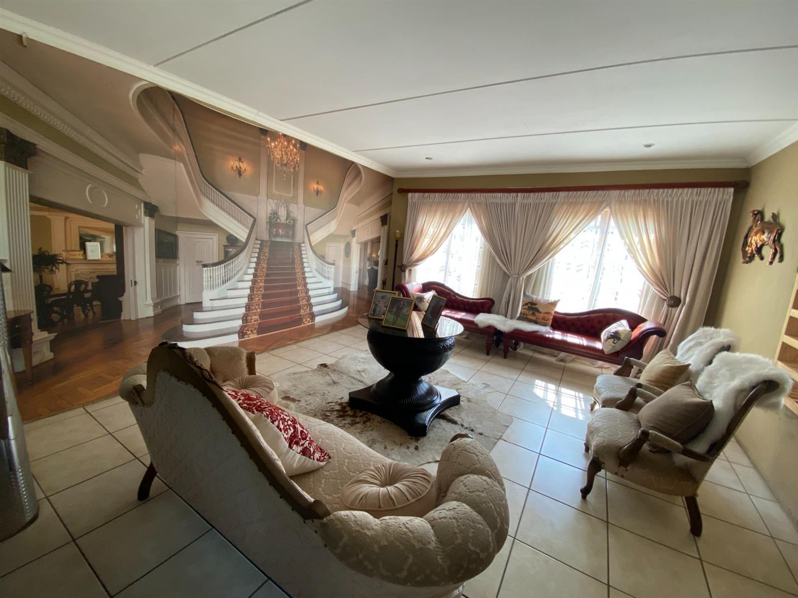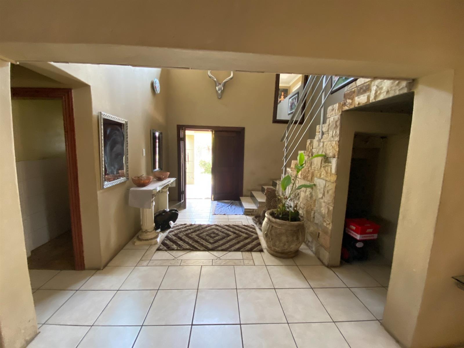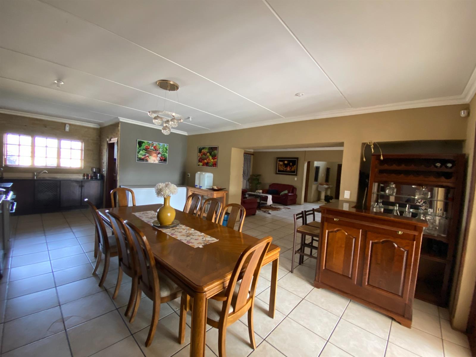 As you enter, you are welcomed by a double volume entrance hall which draws you to an entertainers dream of 2 well furnished living areas. The hall flows into the dining room area with a bar tucked neatly in a corner just outside of another 2 living areas with sliding doors that open out into the patio with the swimming pool and a lapa.