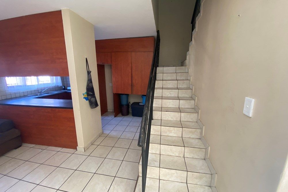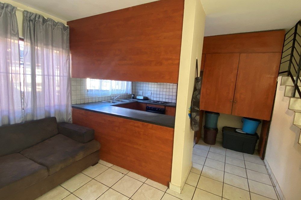 The duplex is designed with tiled floors throughout. The open plan kitchen with modern hob and under counter oven flows into the dining room. The spacious living room is around the corner with sliding doors that open out to a garden.
