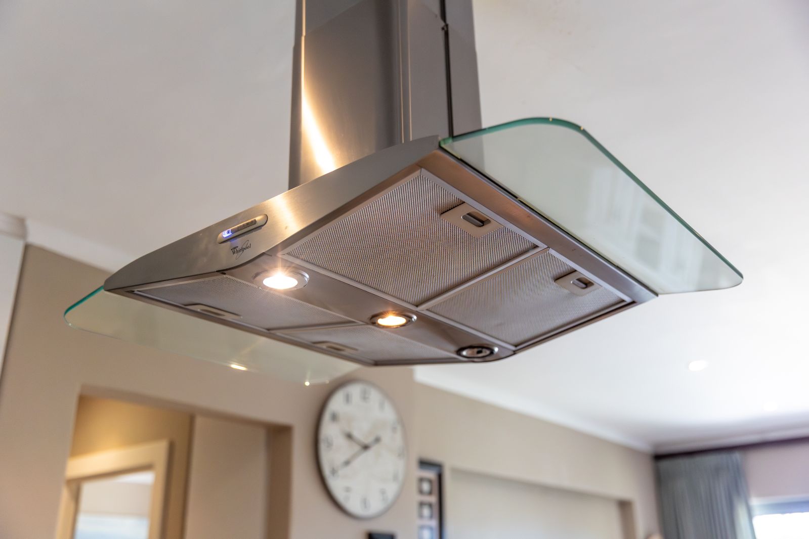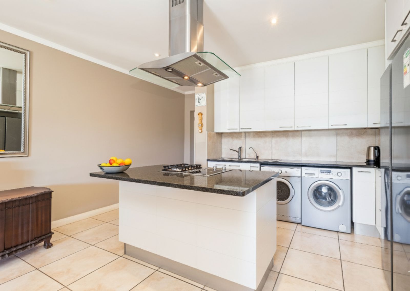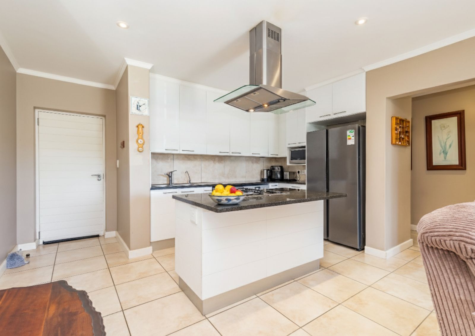 The open-plan kitchen is fitted with ample cupboard space, space for a double door fridge, a hob that’s half gas and half electric, and an extraction fan — perfect for those who love to cook. The living and dining area flows out onto an enclosed patio with elegant glass stacking doors, creating a versatile space ideal for year-round entertaining or relaxing while enjoying the garden views.