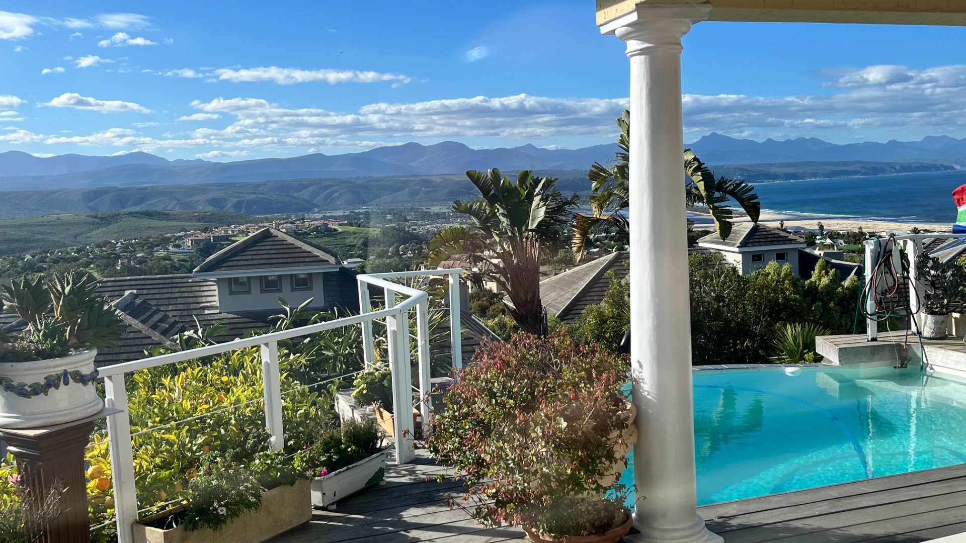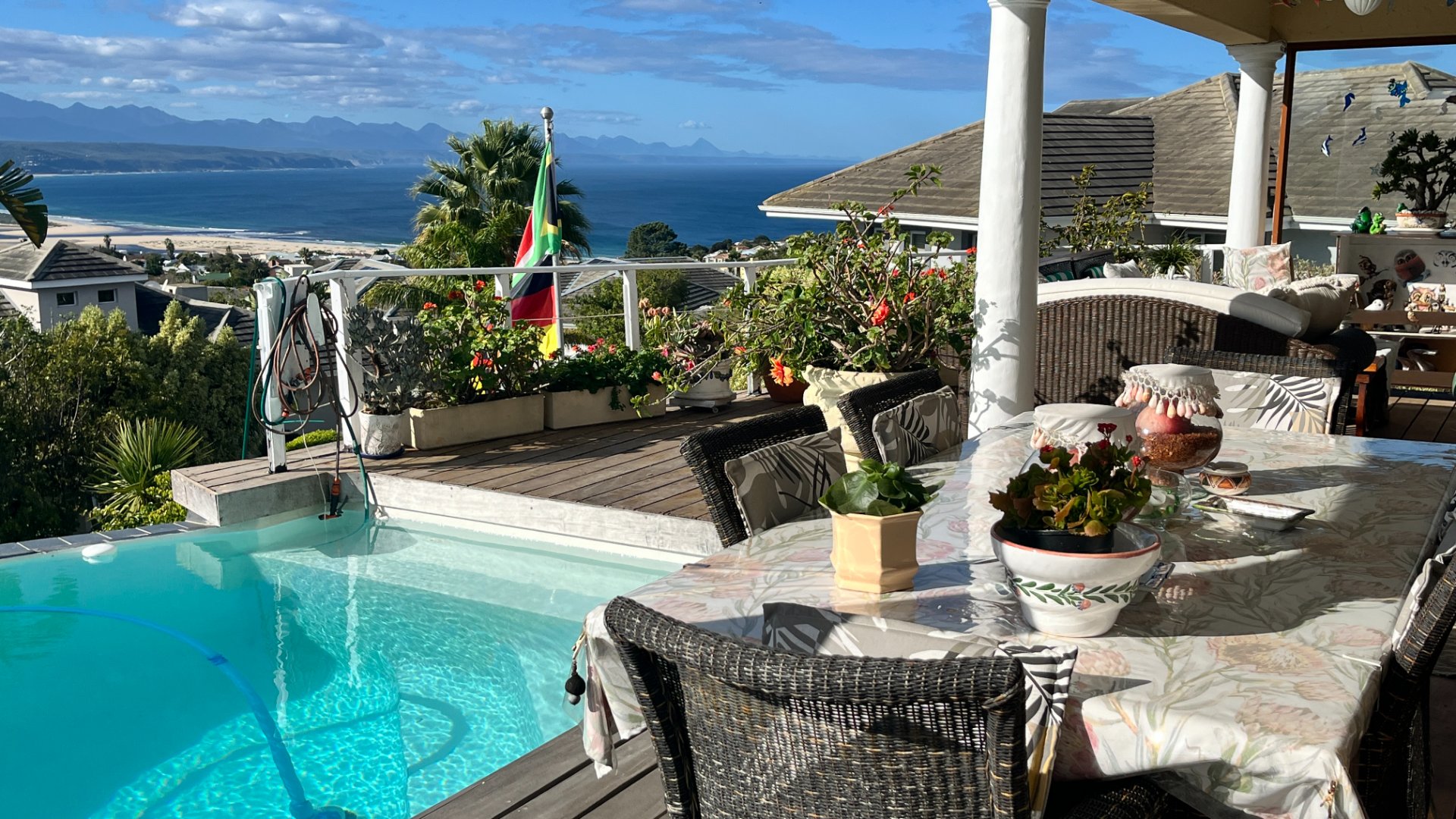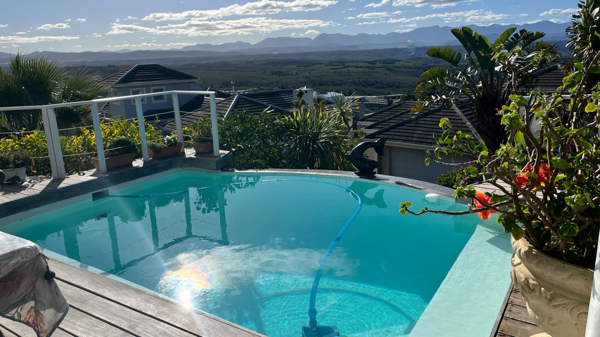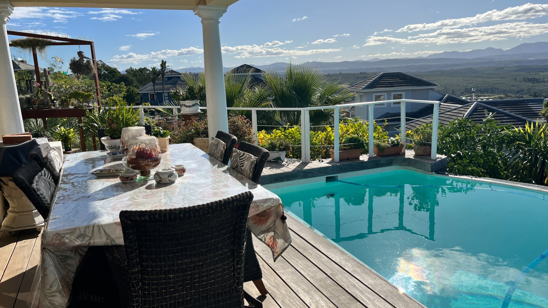 This home has so much on offer. There are 2 lounges, dining room, 4 bedrooms – all en-suite and patio with space for lounging and eating, sparkling splash pool and views for Africa. The main living areas of this home are upstairs, to enable you to enjoy the best of the views. Downstairs is the entrance leading to the one lounge and dining area, 3 spacious bedrooms all en suite. The one has a pyjama lounge area and a private patio. The other 2 bedrooms share a patio that overlooks the pretty but manageable garden. Upstairs is the main bedroom, the large lounge and dining room with open plan kitchen with granite tops, and a separate scullery and laundry. These living rooms lead to the spacious patio with the splash pool. There is a double garage, and all of this is set in an exclusive estate.