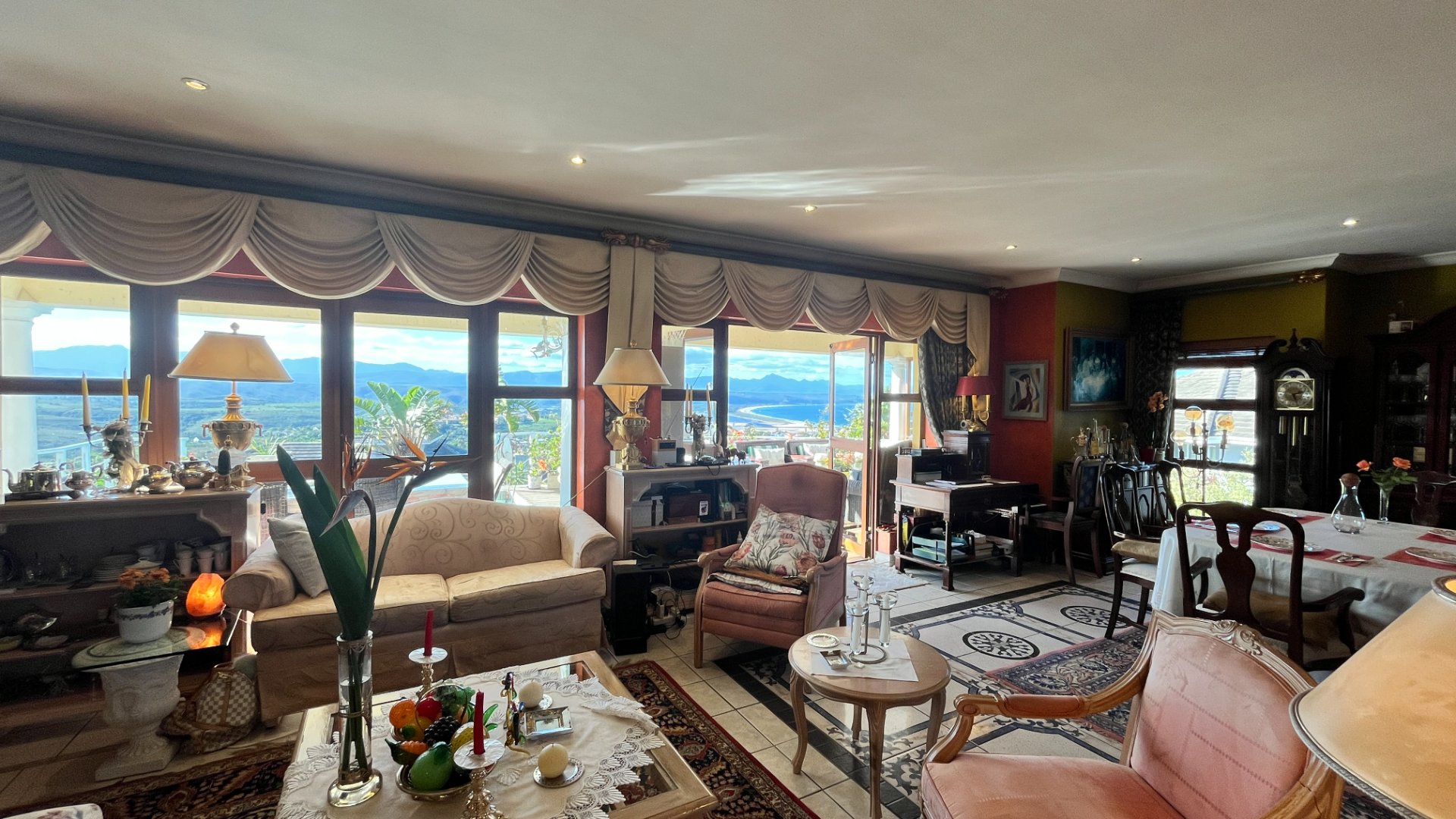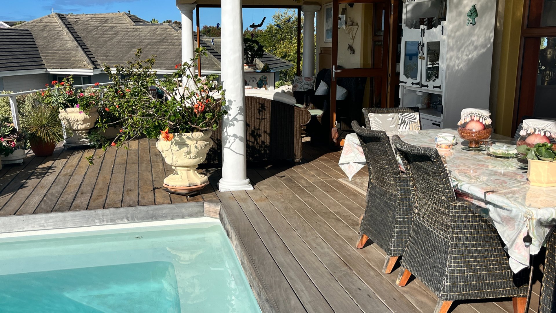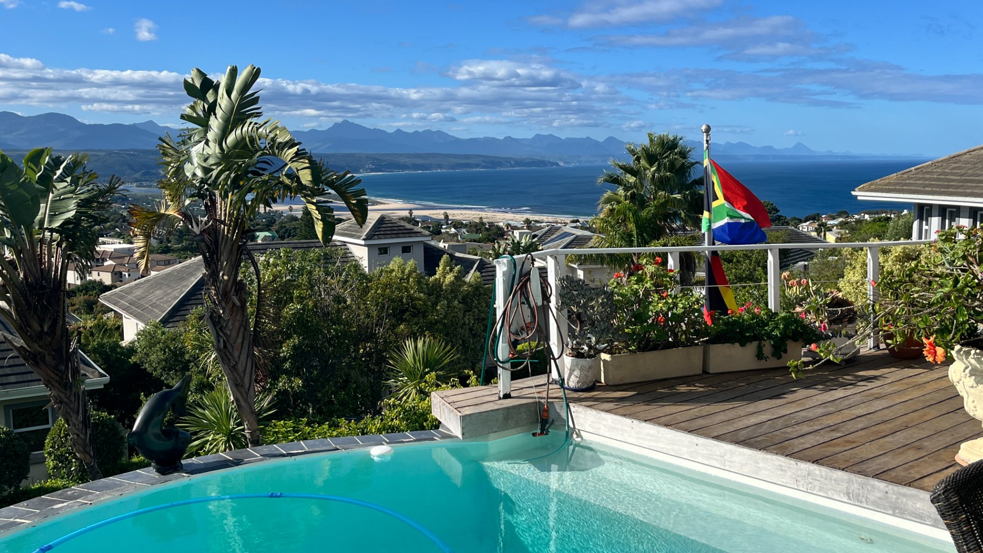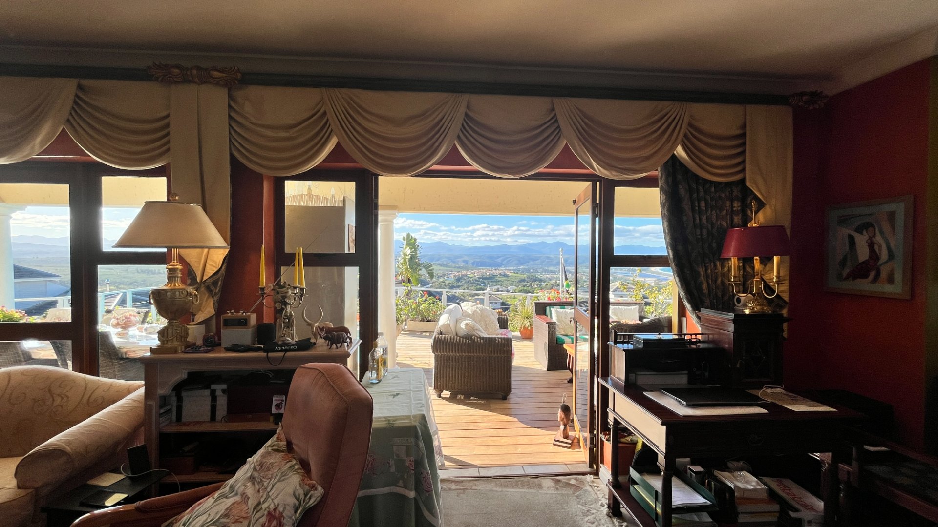 This home has so much on offer. There are 2 lounges, dining room, 4 bedrooms – all en-suite and patio with space for lounging and eating, sparkling splash pool and views for Africa. The main living areas of this home are upstairs, to enable you to enjoy the best of the views. Downstairs is the entrance leading to the one lounge and dining area, 3 spacious bedrooms all en suite. The one has a pyjama lounge area and a private patio. The other 2 bedrooms share a patio that overlooks the pretty but manageable garden. Upstairs is the main bedroom, the large lounge and dining room with open plan kitchen with granite tops, and a separate scullery and laundry. These living rooms lead to the spacious patio with the splash pool. There is a double garage, and all of this is set in an exclusive estate.