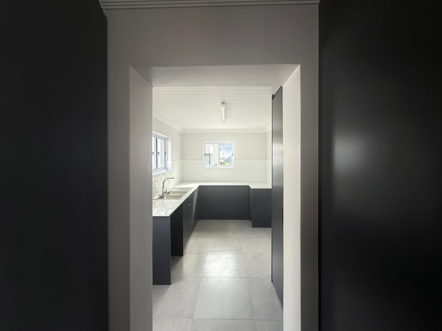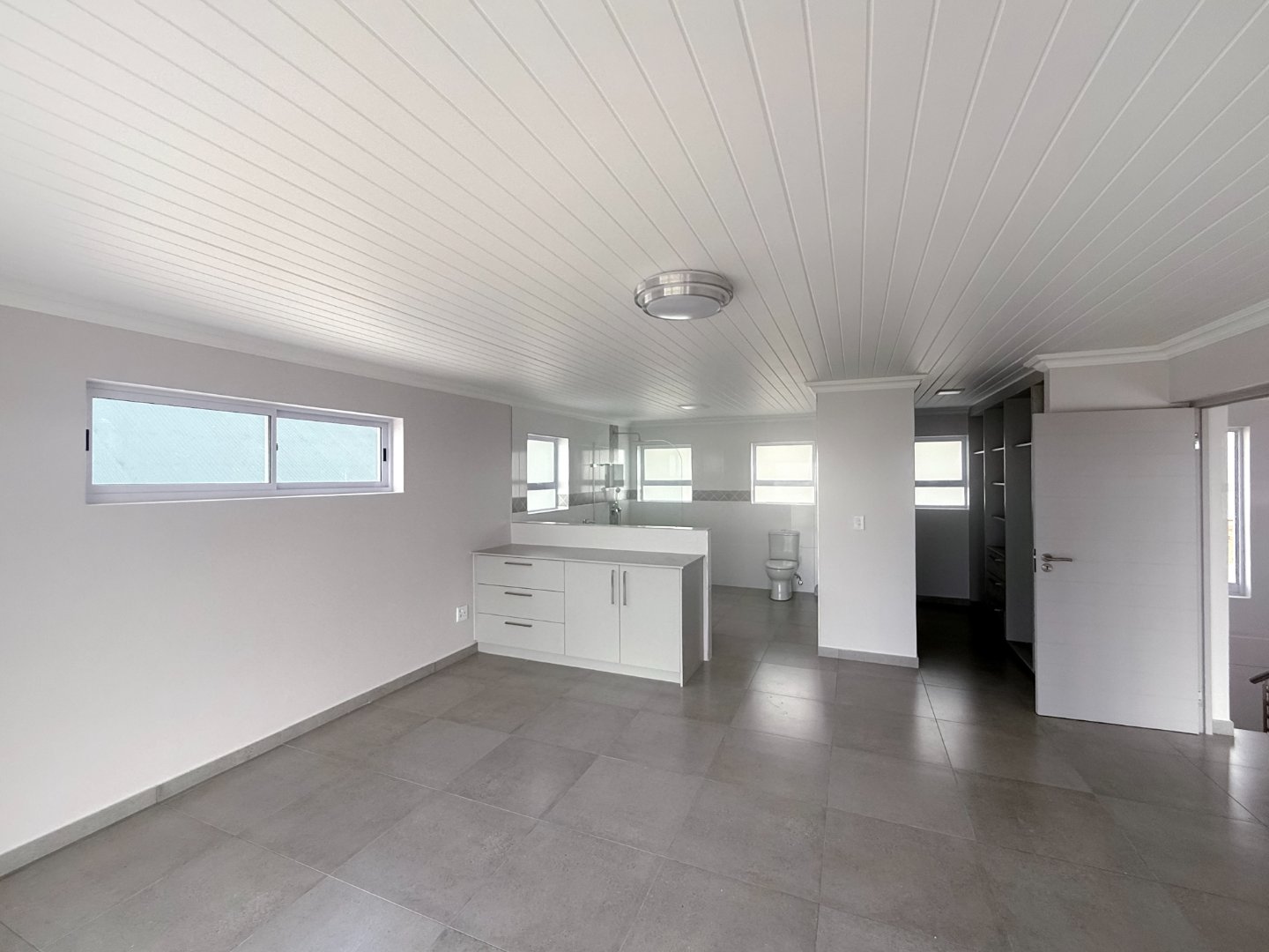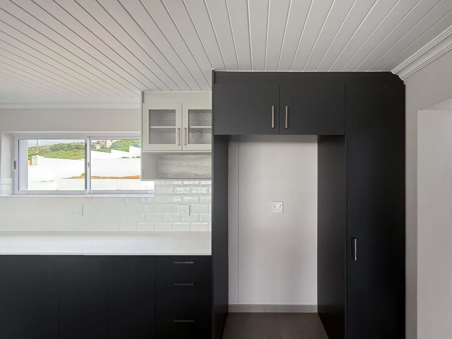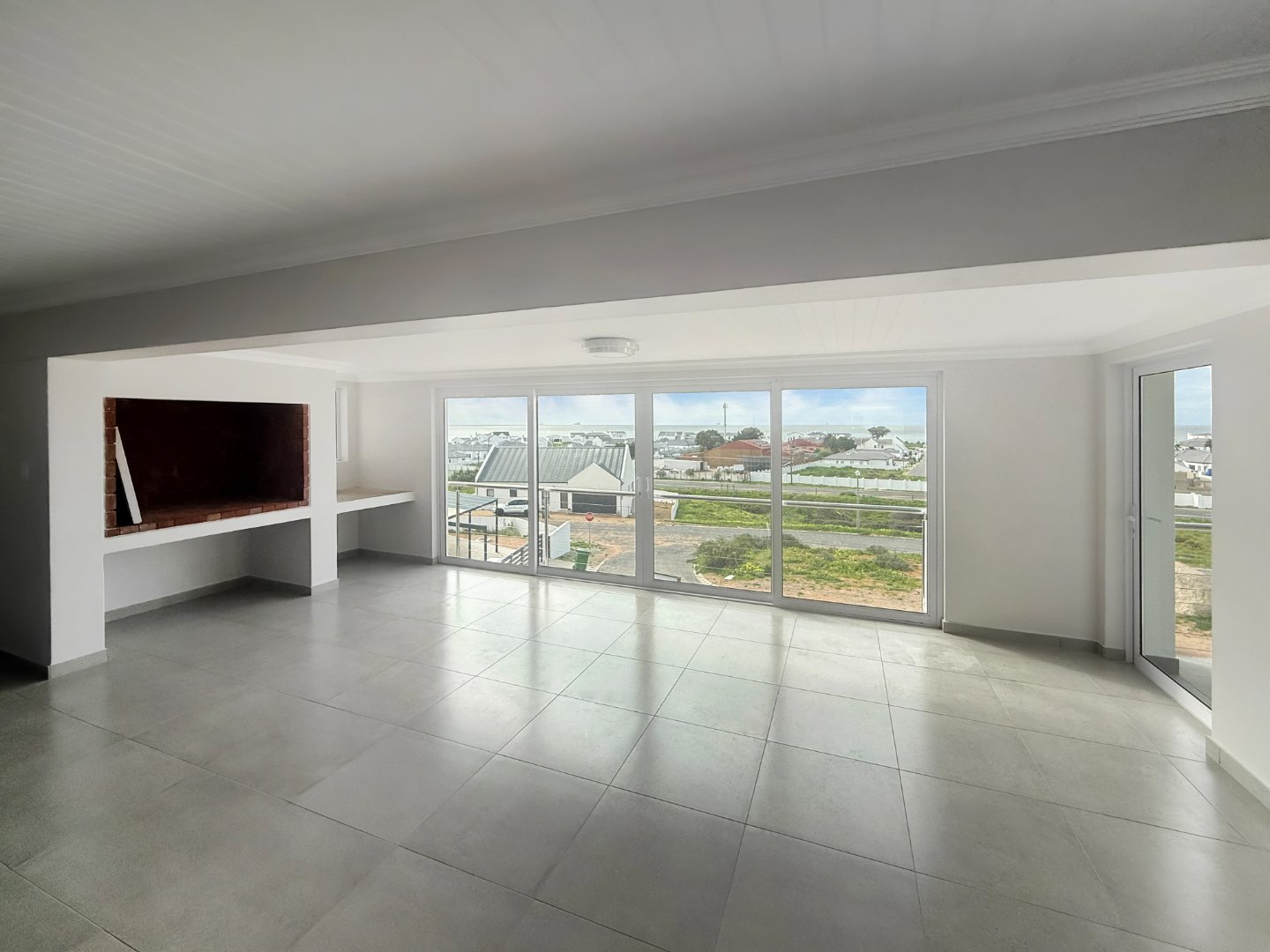 Upstairs, the home opens to a light-filled, open-plan kitchen and living area with an indoor braai, perfect for relaxed entertaining. The kitchen features ample counter space, a separate scullery, and practical flow for everyday use.