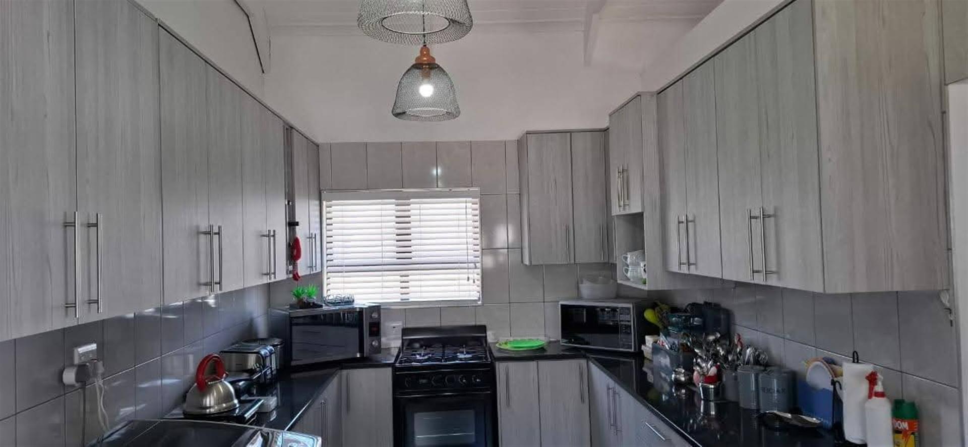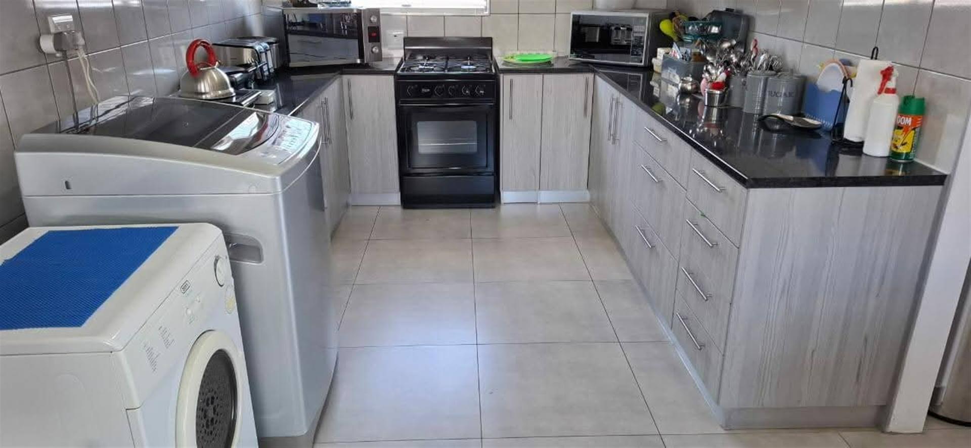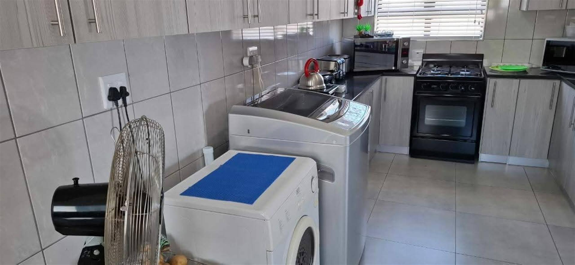The heart of the home is the well-appointed kitchen, featuring a gas oven and a scullery that adds convenience to daily living. This property also boasts a domestic room, providing additional space for guests or potential staff. The presence of laminated and tiled floors throughout enhances both aesthetics and functionality.