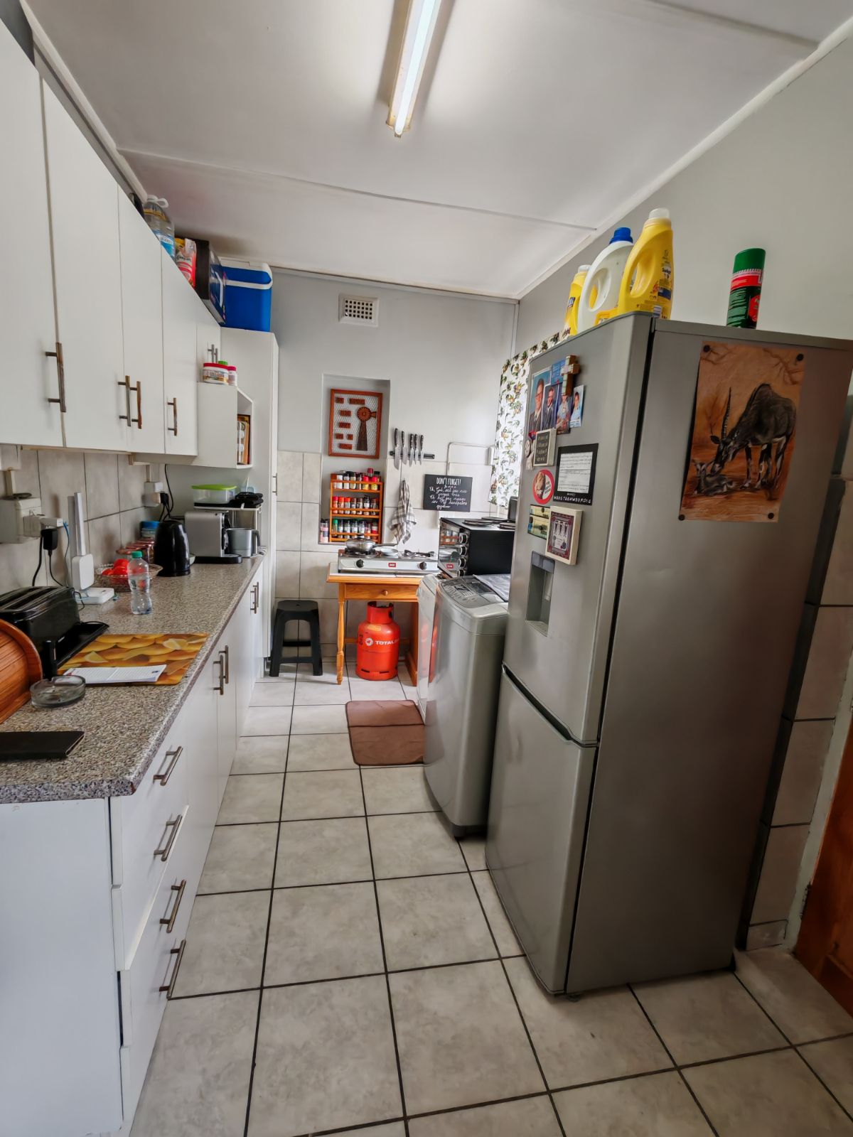 Lounge and kitchen, with a backdoor leading to an enclosed backyard