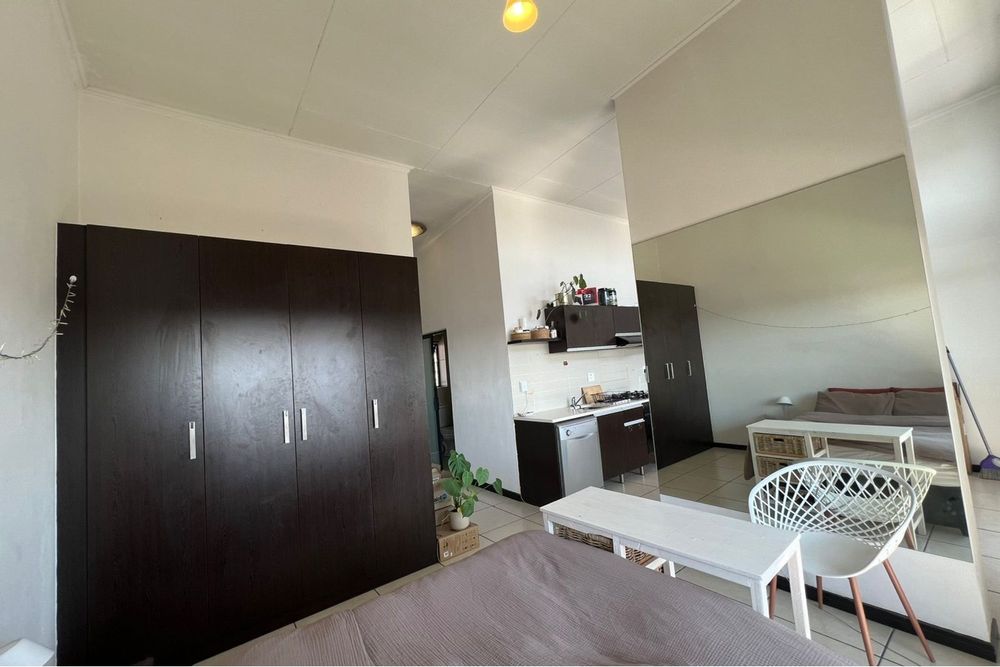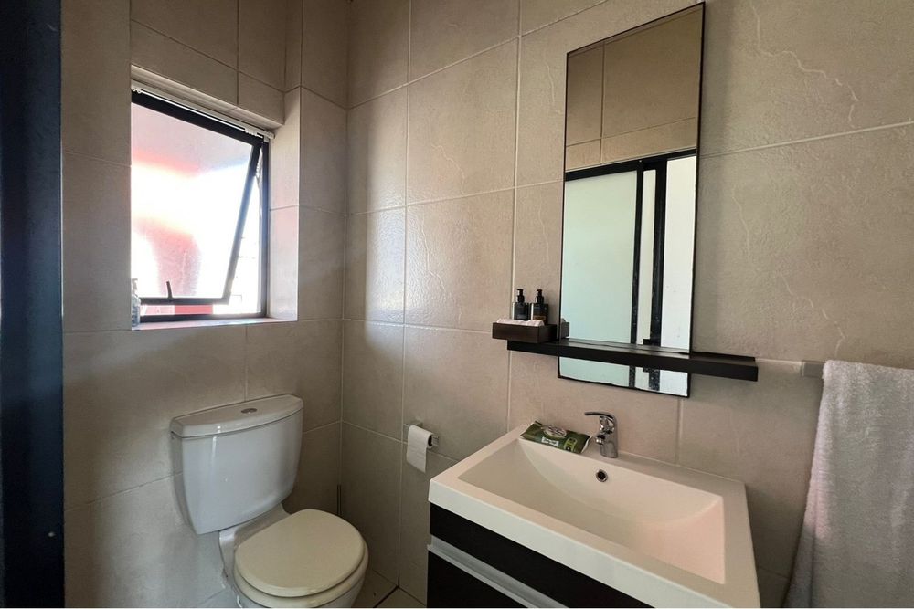 This stylish bachelor apartment offers a modern and functional living space, ideal for professionals seeking comfort and convenience. The open-plan kitchen is fitted with sleek white countertops that contrast beautifully with the dark cabinetry, creating a clean and sophisticated look. It includes essential appliances such as washing machine, tumble dryer, and a gas stove—making everyday living both easy and energy-efficient. The kitchen flows seamlessly into the well-sized living area, which opens up to a balcony through large sliding doors. From here, you can enjoy sweeping views of the surrounding landscape, offering a sense of space and tranquility. The apartment is filled with natural light, thanks to generous windows, while the floor-to-ceiling dark wood cabinets provide ample storage. Modern finishes extend into the bathroom, completing the apartment’s polished aesthetic. The lifestyle on offer is enhanced by access to a wide range of amenities including a restaurant, gym, two swimming pools, braai area, lifestyle centre, boardroom, wine cellar, herb garden, and a cross-country running path. With 24/7 security, residents can enjoy peace of mind in a safe and secure environment.
