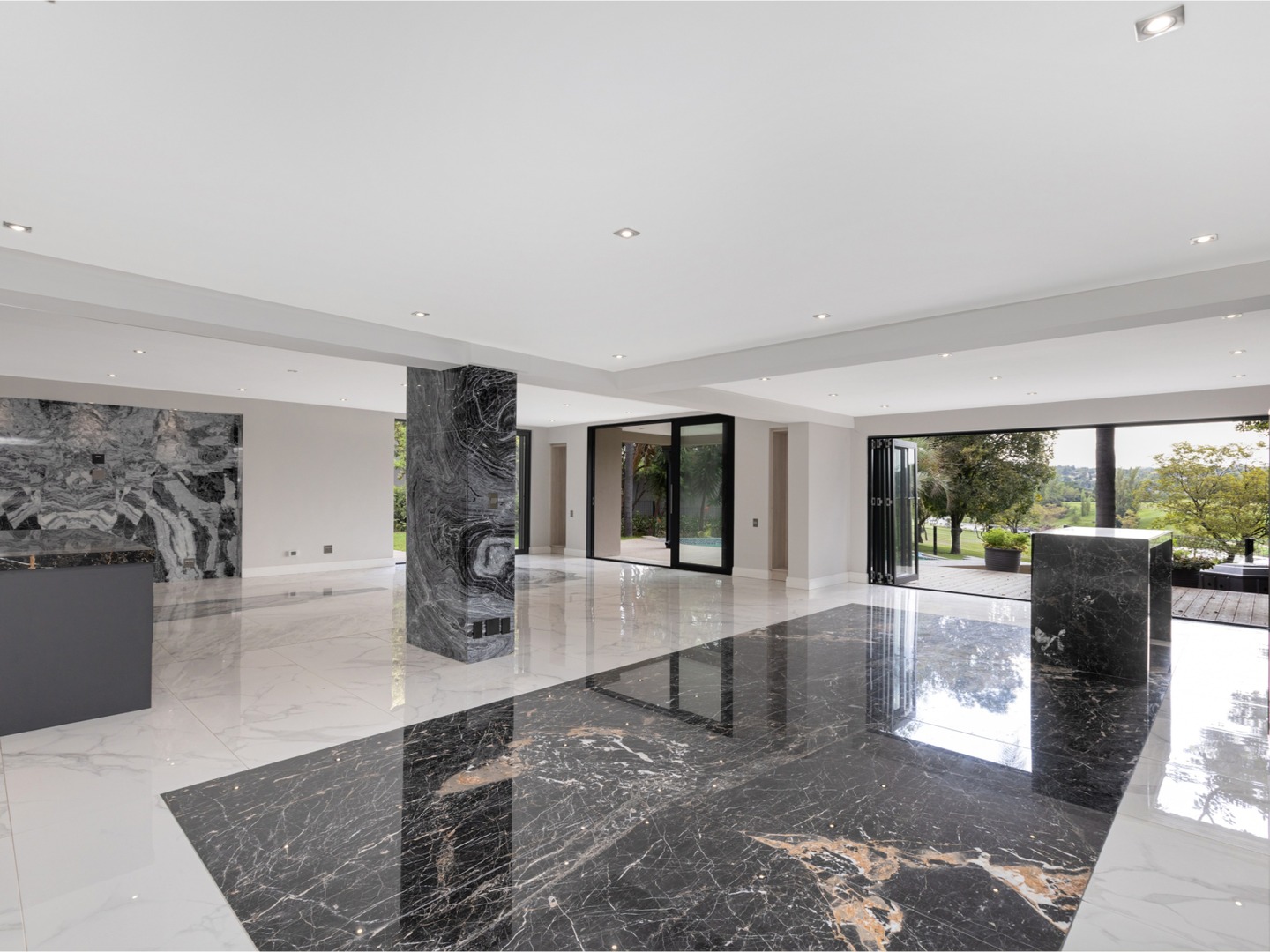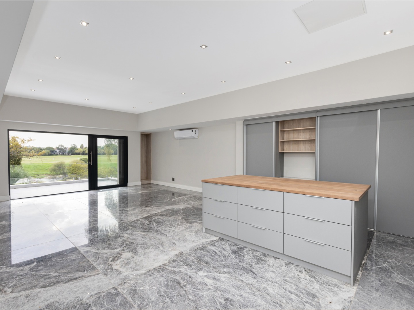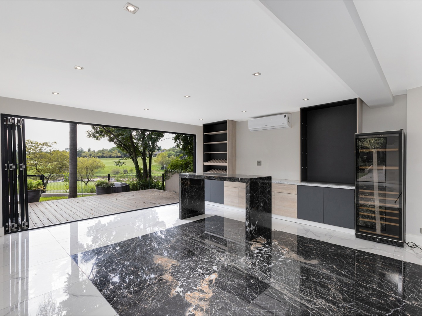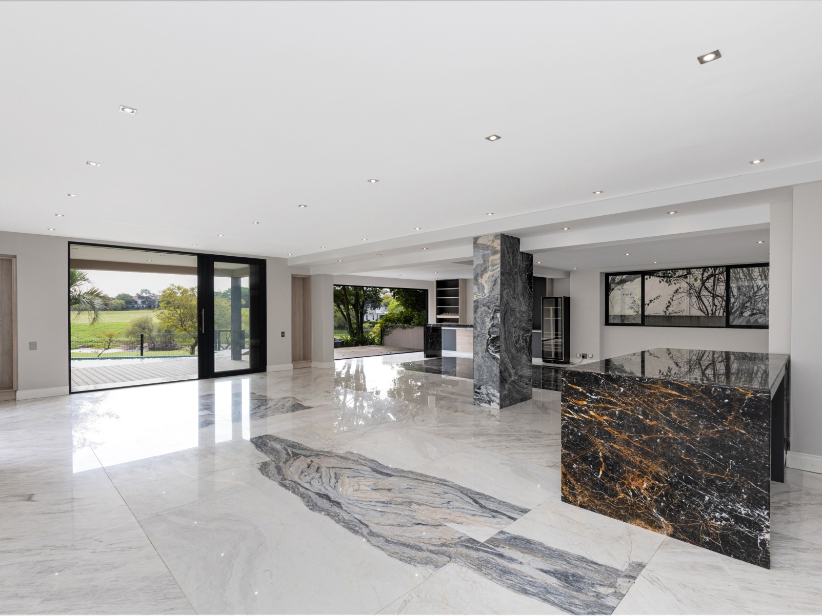 The entrance sets the tone of this home with a magnificent chandelier, inviting you into open plan spaces emphasising indoor outdoor living at its best, overlooking the river and golf course. Bespoke designed state of the art kitchen and bar with marble counter tops one touch smeg hob integrated microwave , recessed coffee station and a separate scullery.