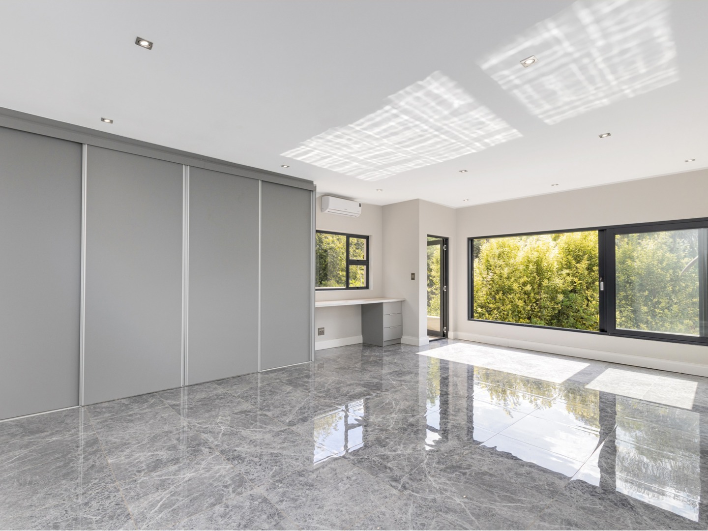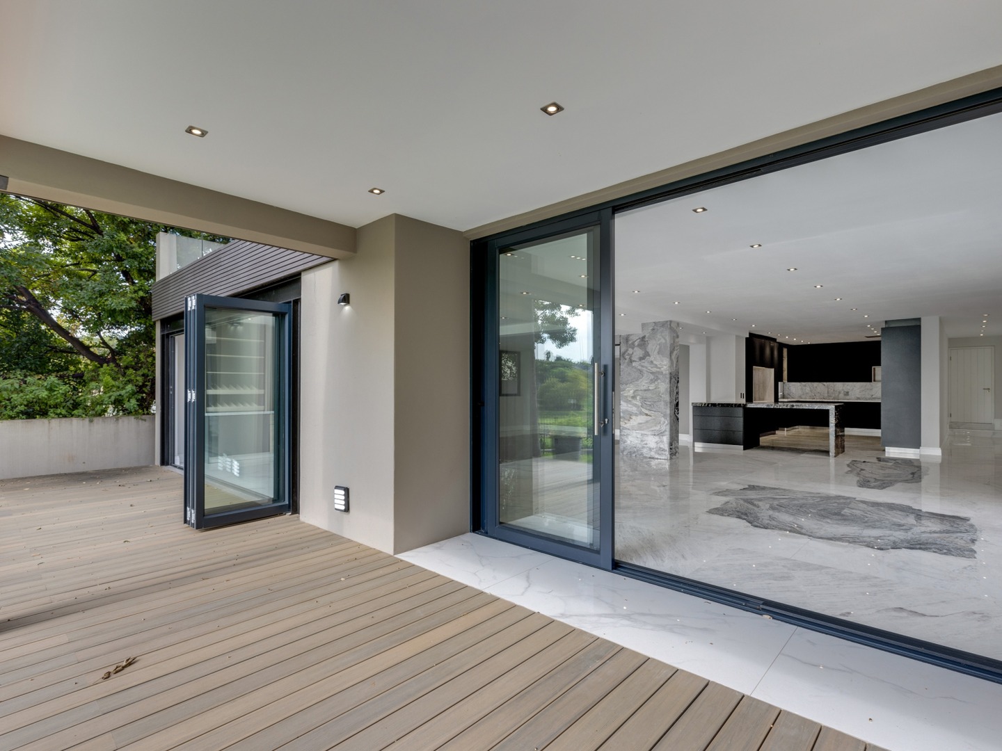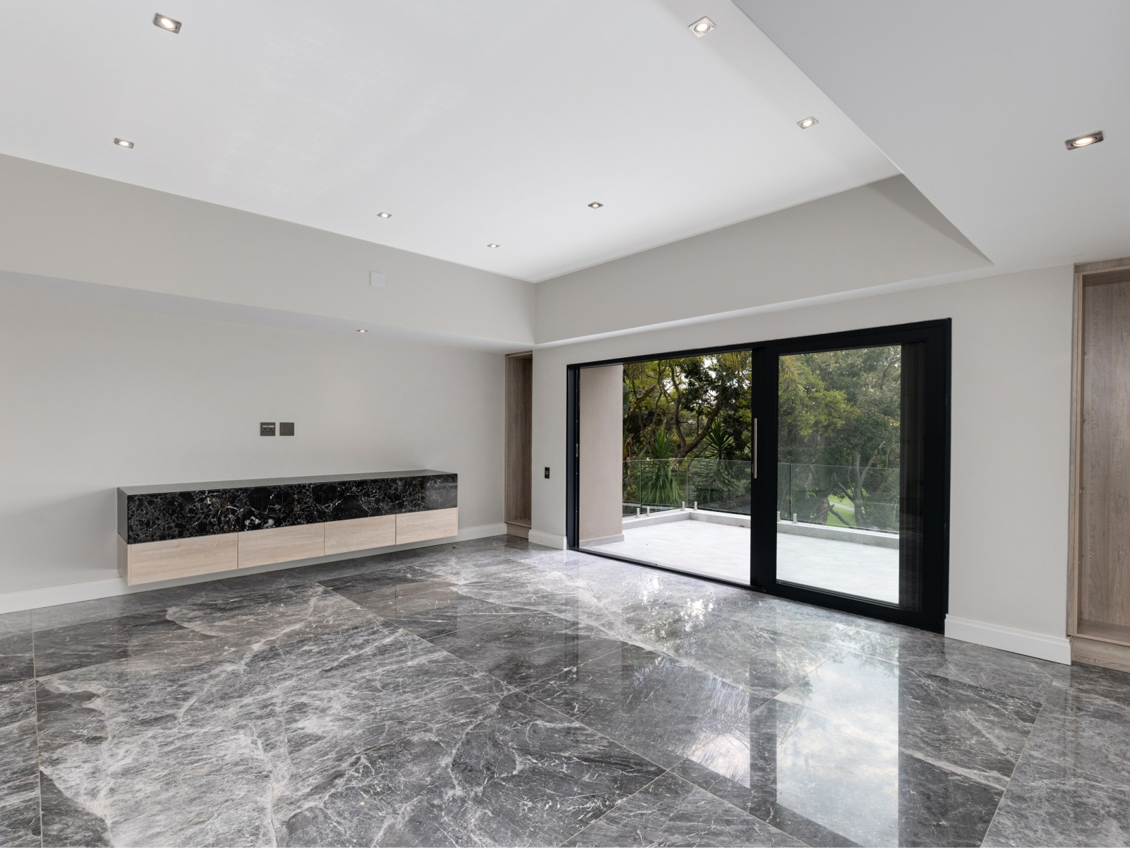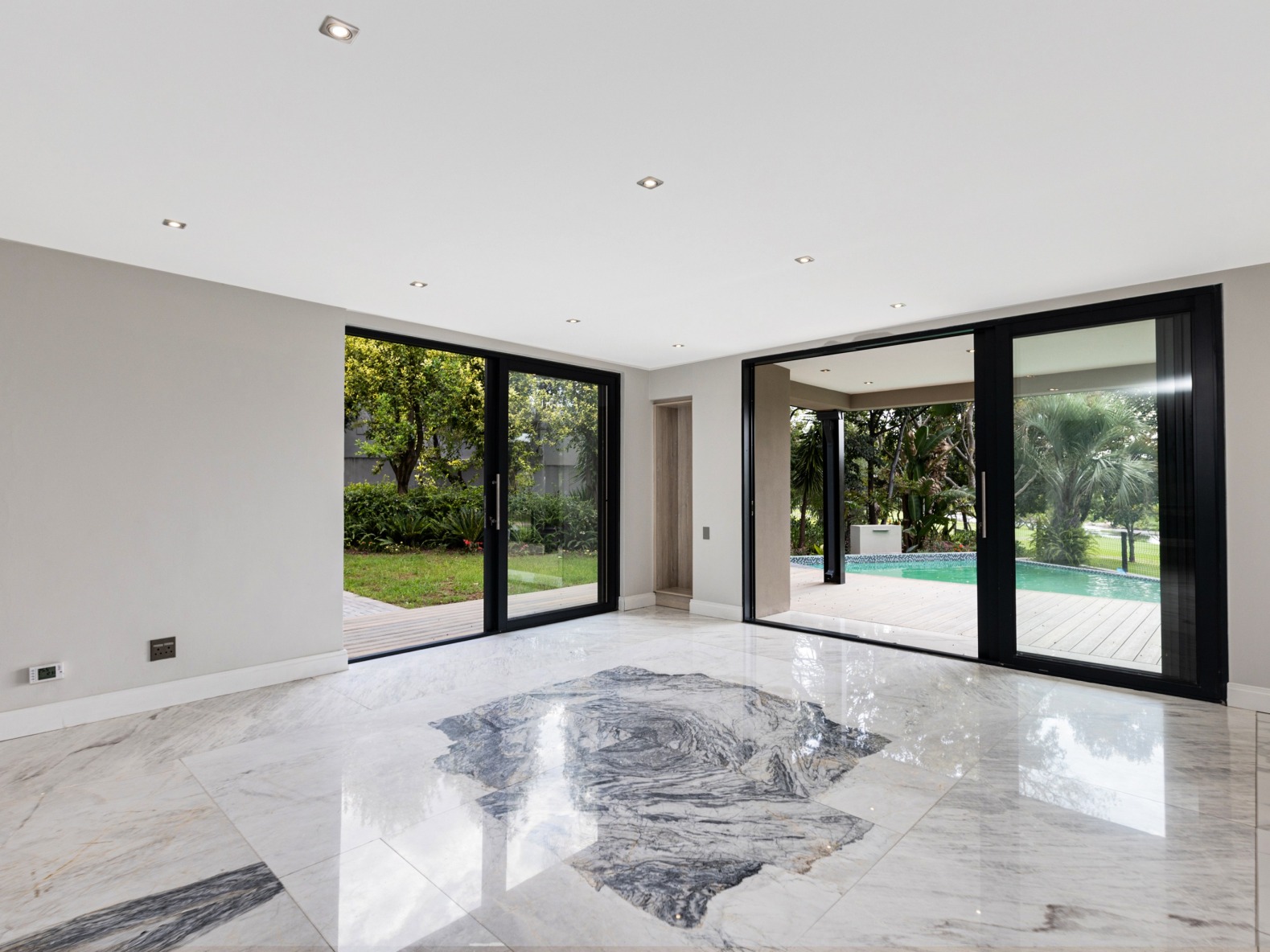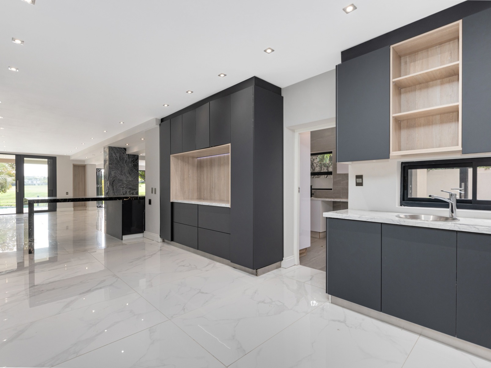 The entrance sets the tone of this home with a magnificent chandelier, inviting you into open plan spaces emphasising indoor outdoor living at its best, overlooking the river and golf course. Bespoke designed state of the art kitchen and bar with marble counter tops one touch smeg hob integrated microwave , recessed coffee station and a separate scullery.