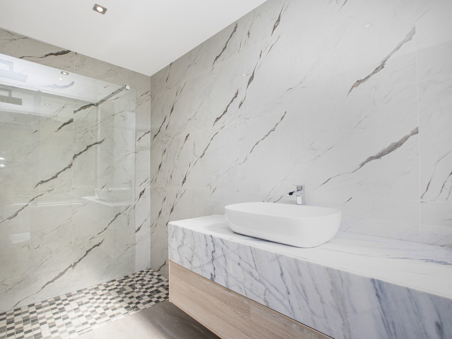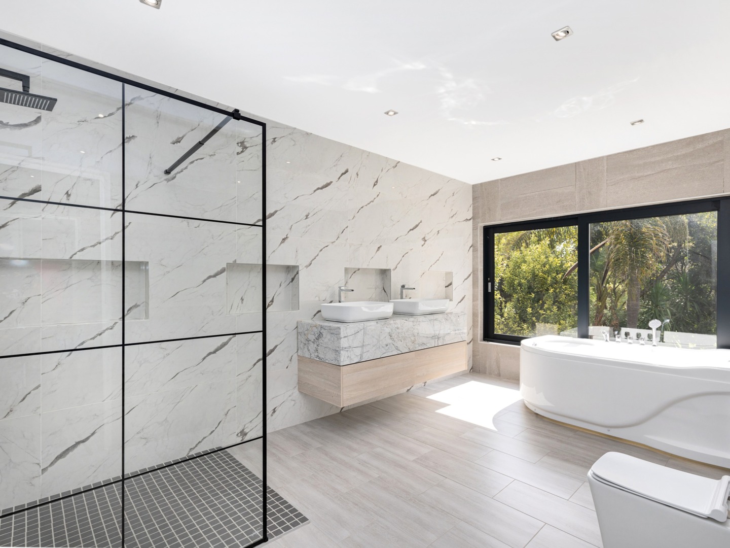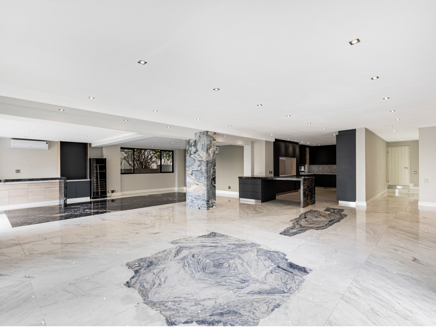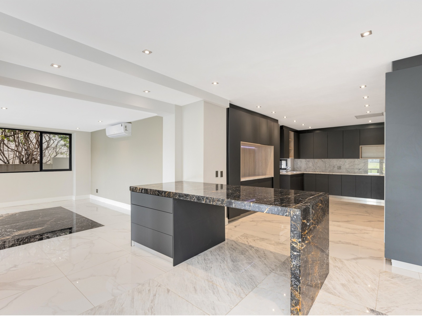 The entrance sets the tone of this home with a magnificent chandelier, inviting you into open plan spaces emphasising indoor outdoor living at its best, overlooking the river and golf course. Bespoke designed state of the art kitchen and bar with marble counter tops one touch smeg hob integrated microwave , recessed coffee station and a separate scullery.