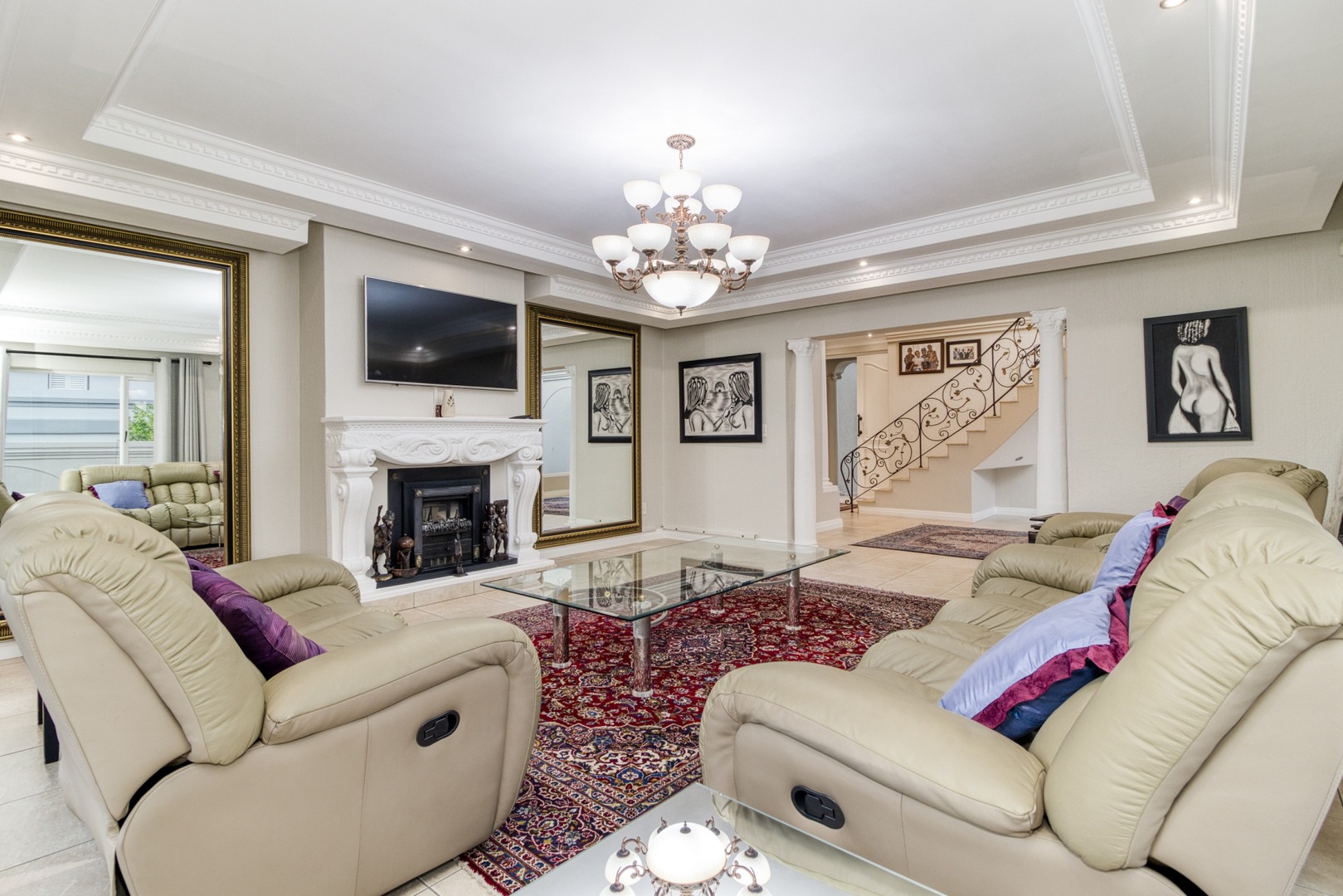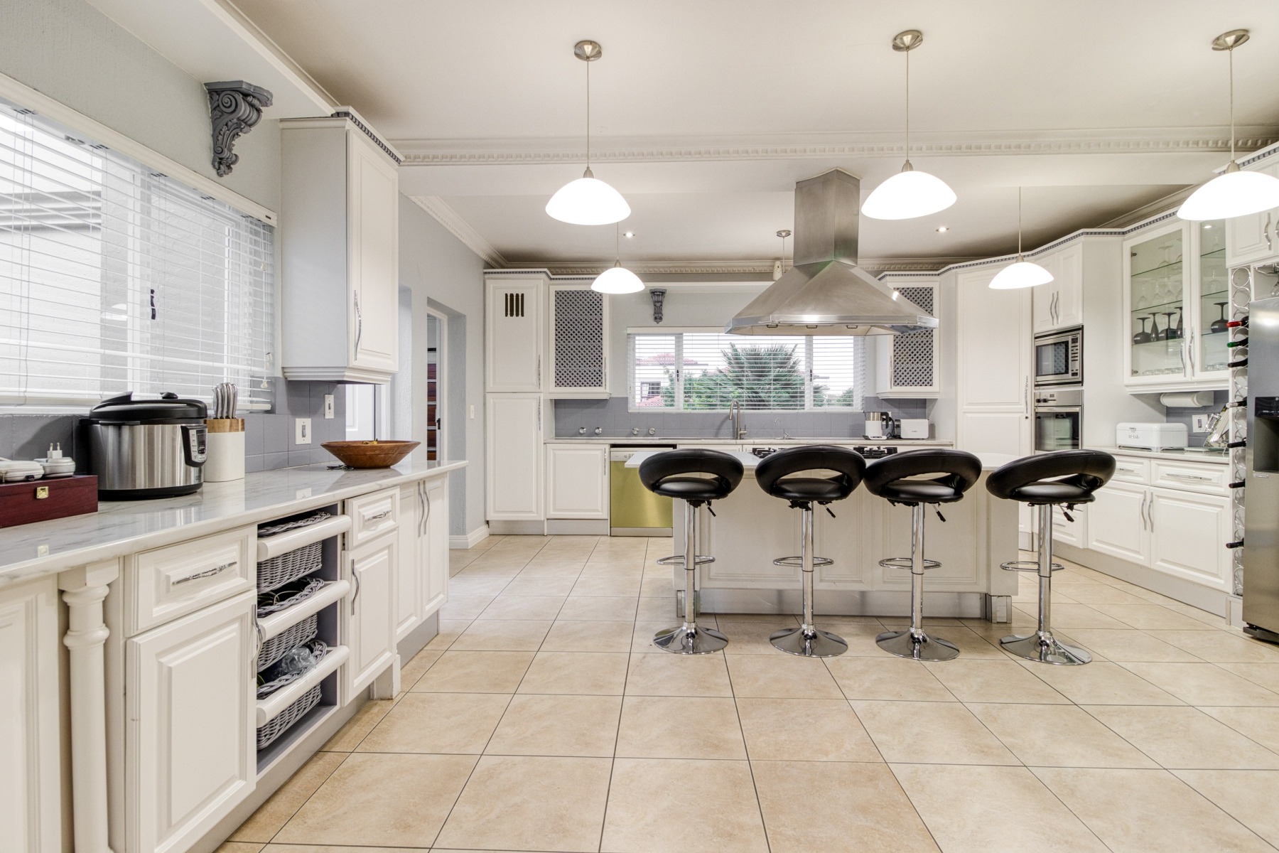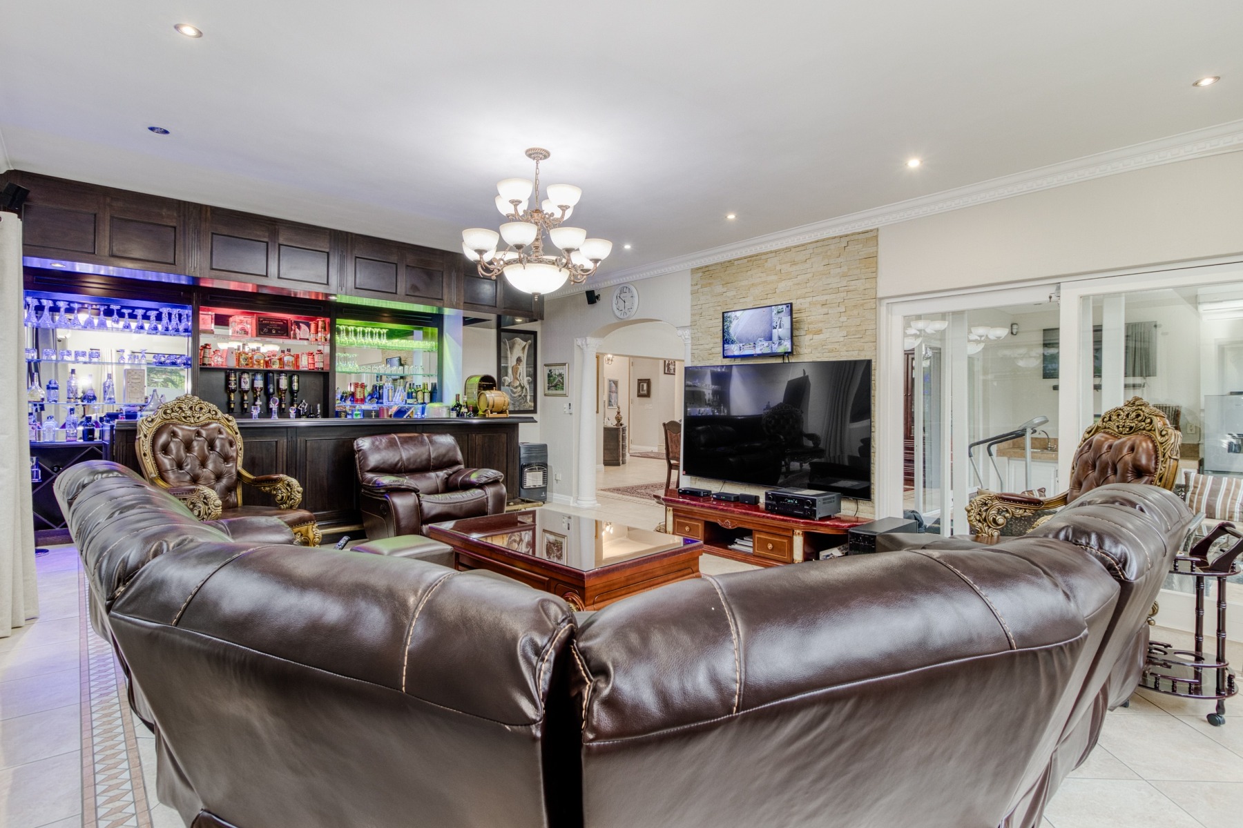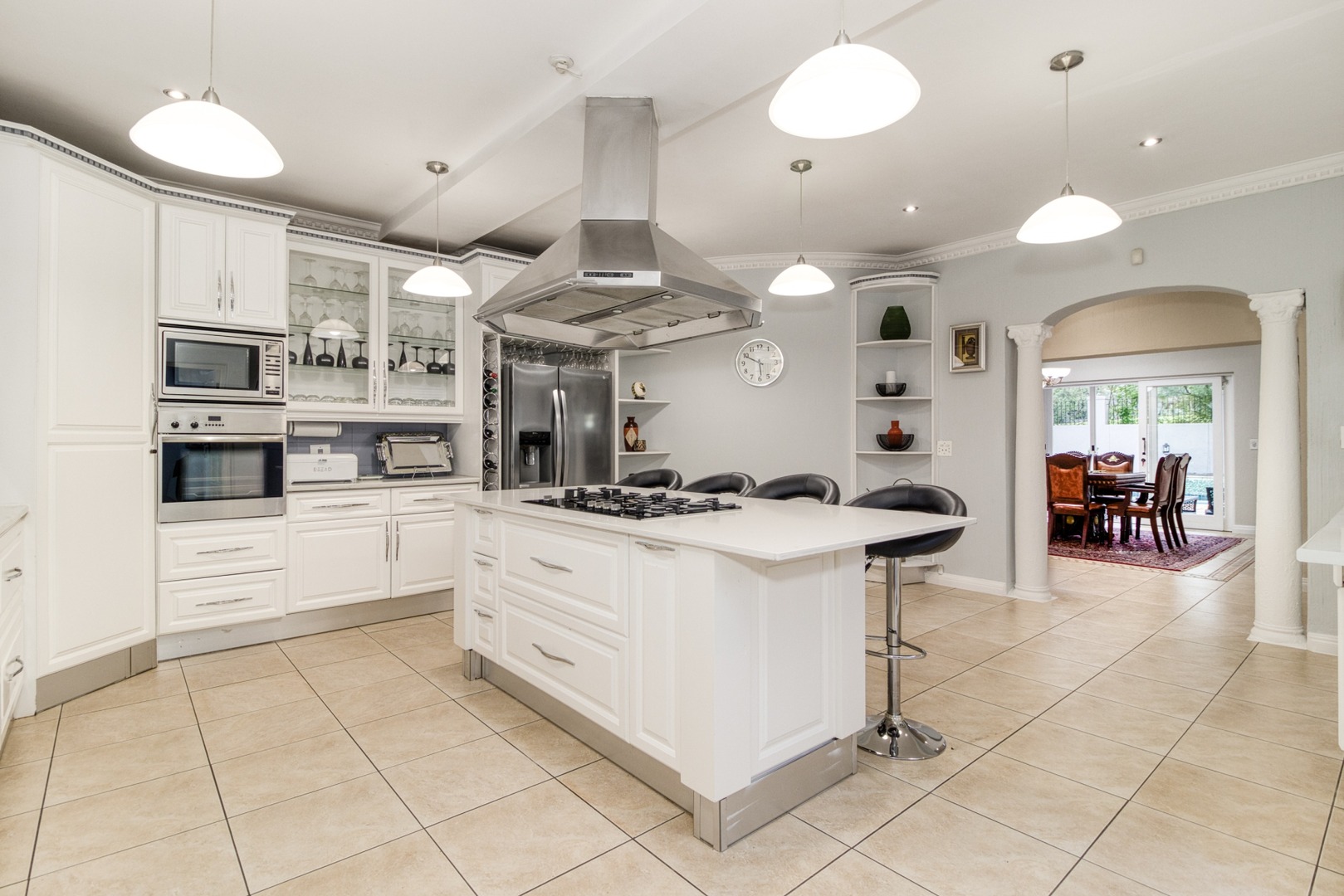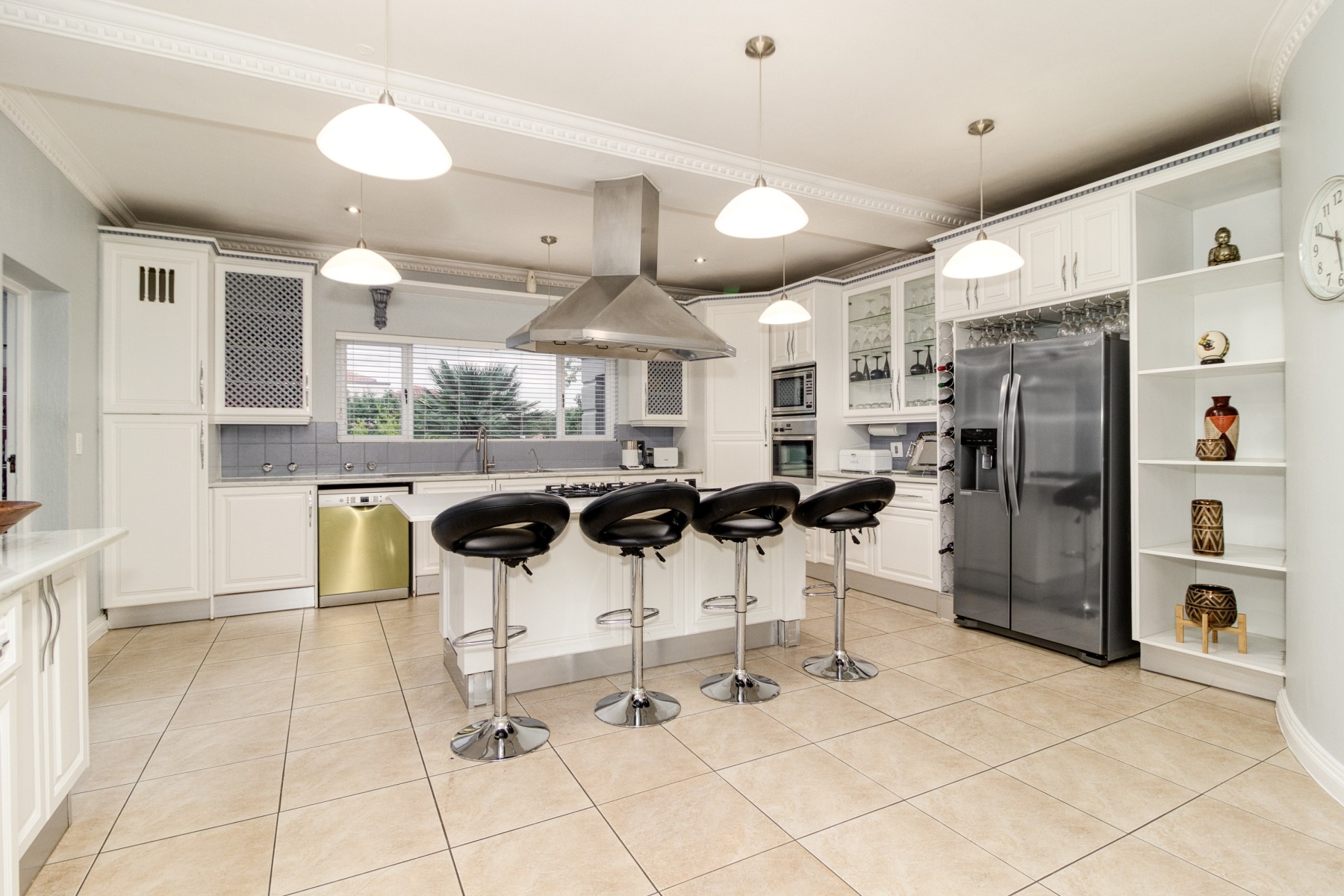 Step into the double-volume, sun-drenched entrance with a sweeping staircase that sets the stage for the spacious living areas. The main living space boasts a large family/TV room and a well-appointed bar, while the dining room comfortably accommodates a 12-seater table. The adjacent well-designed kitchen features a central island with seating, a gas hob, and a convenient walk-in pantry.