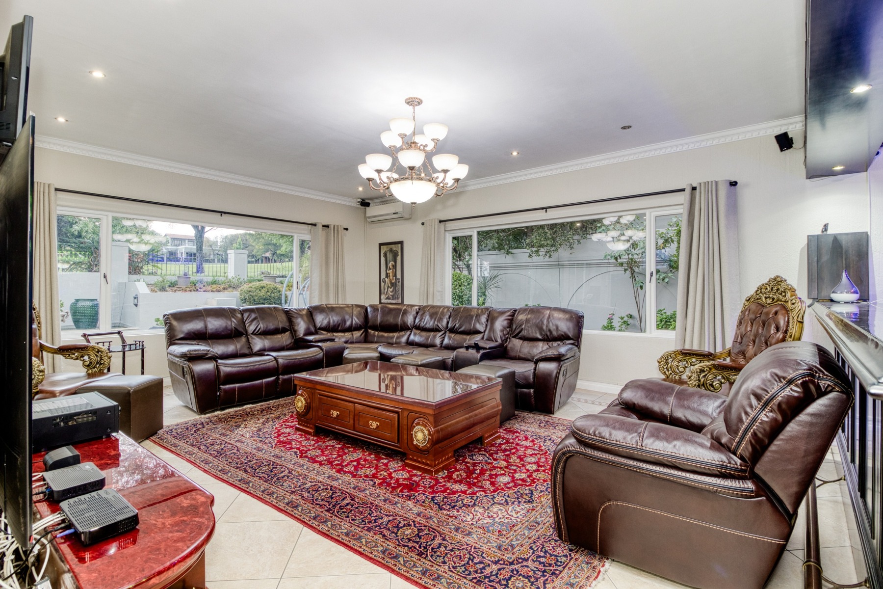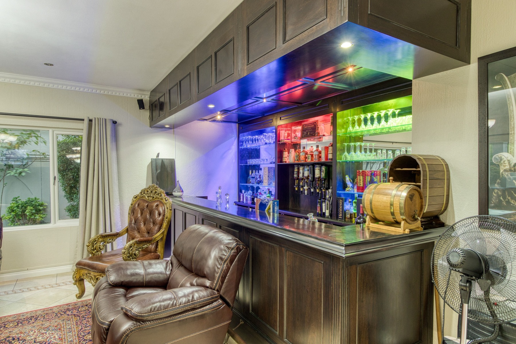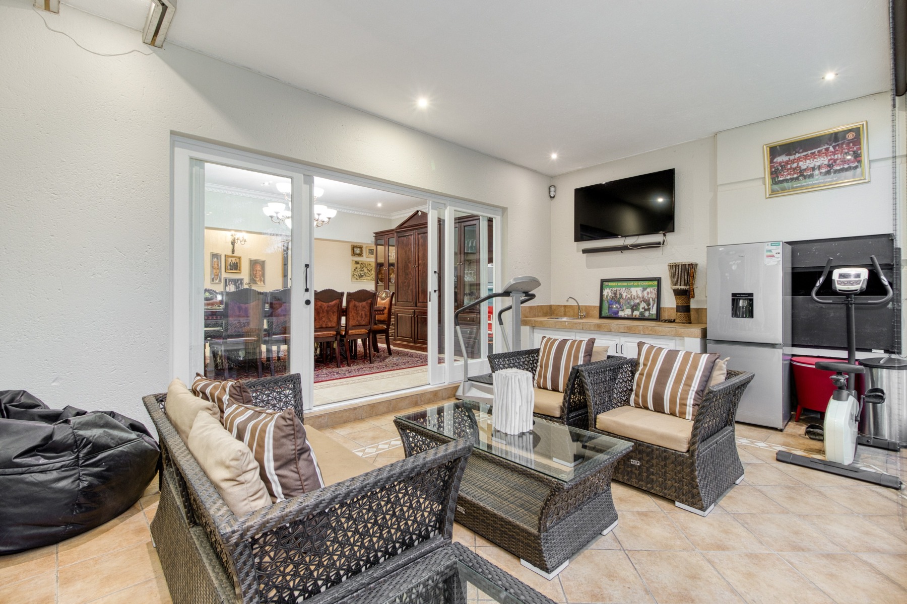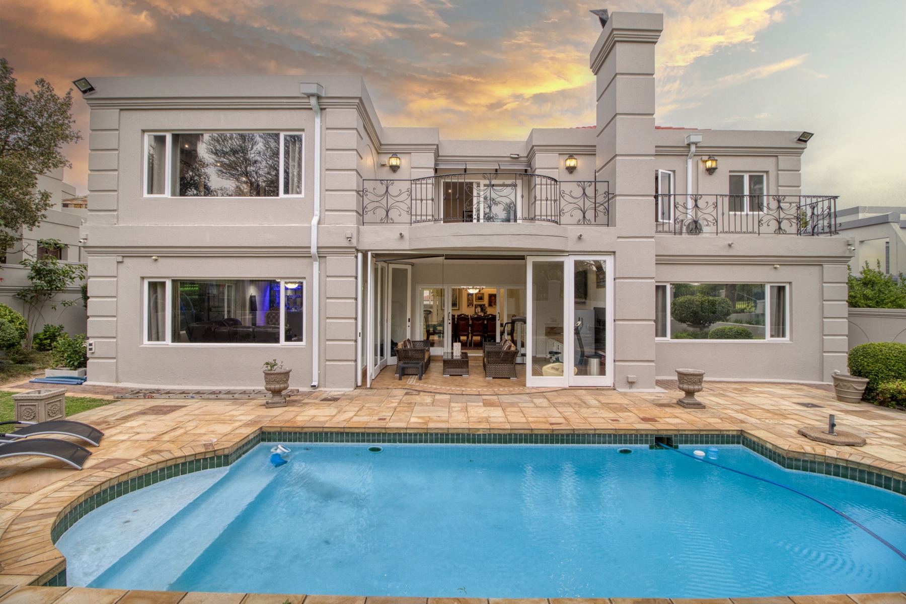 Step into the double-volume, sun-drenched entrance with a sweeping staircase that sets the stage for the spacious living areas. The main living space boasts a large family/TV room and a well-appointed bar, while the dining room comfortably accommodates a 12-seater table. The adjacent well-designed kitchen features a central island with seating, a gas hob, and a convenient walk-in pantry.