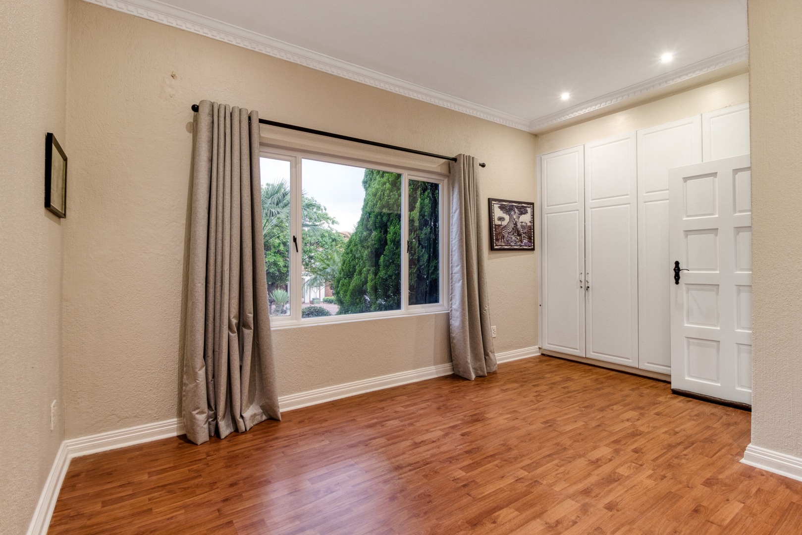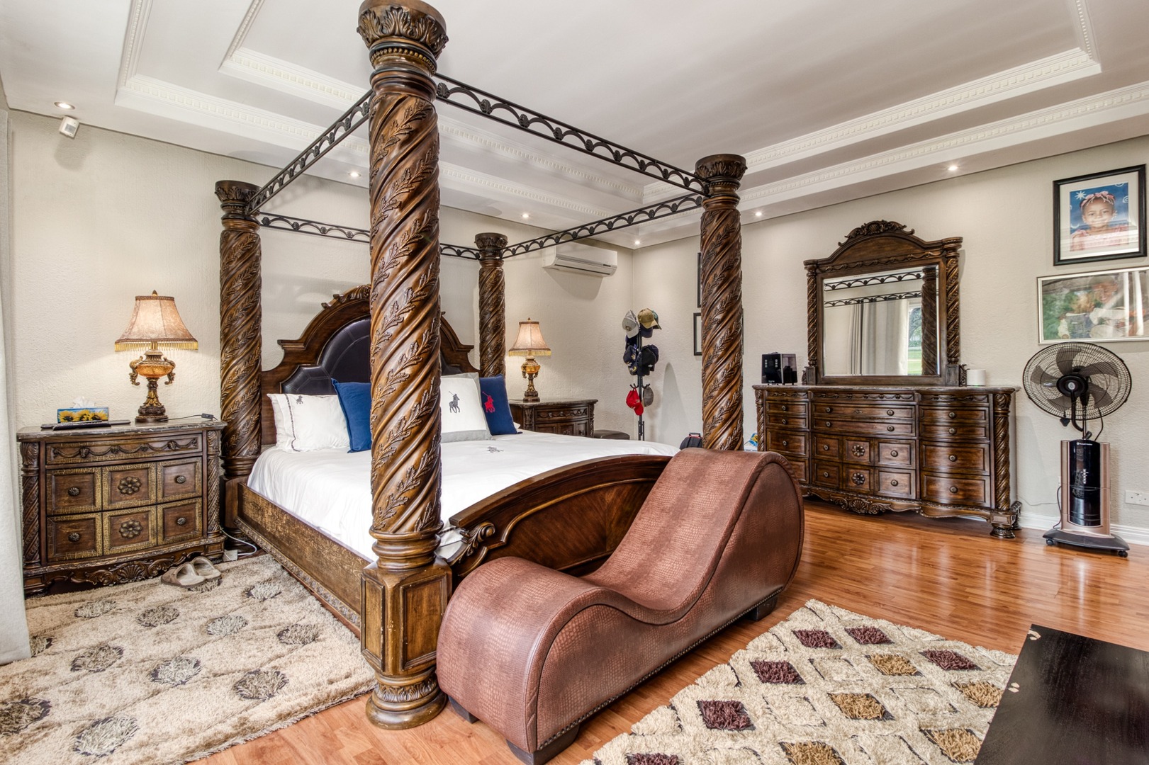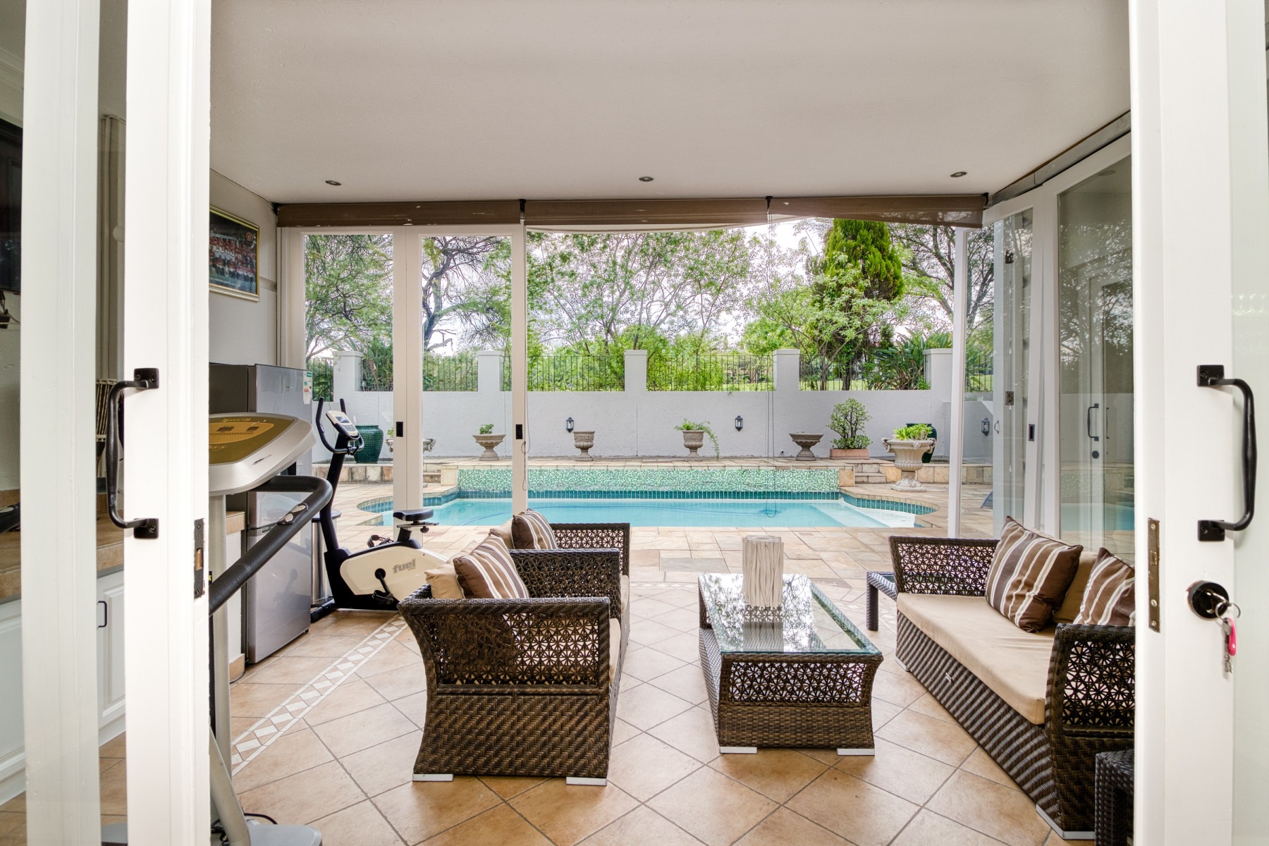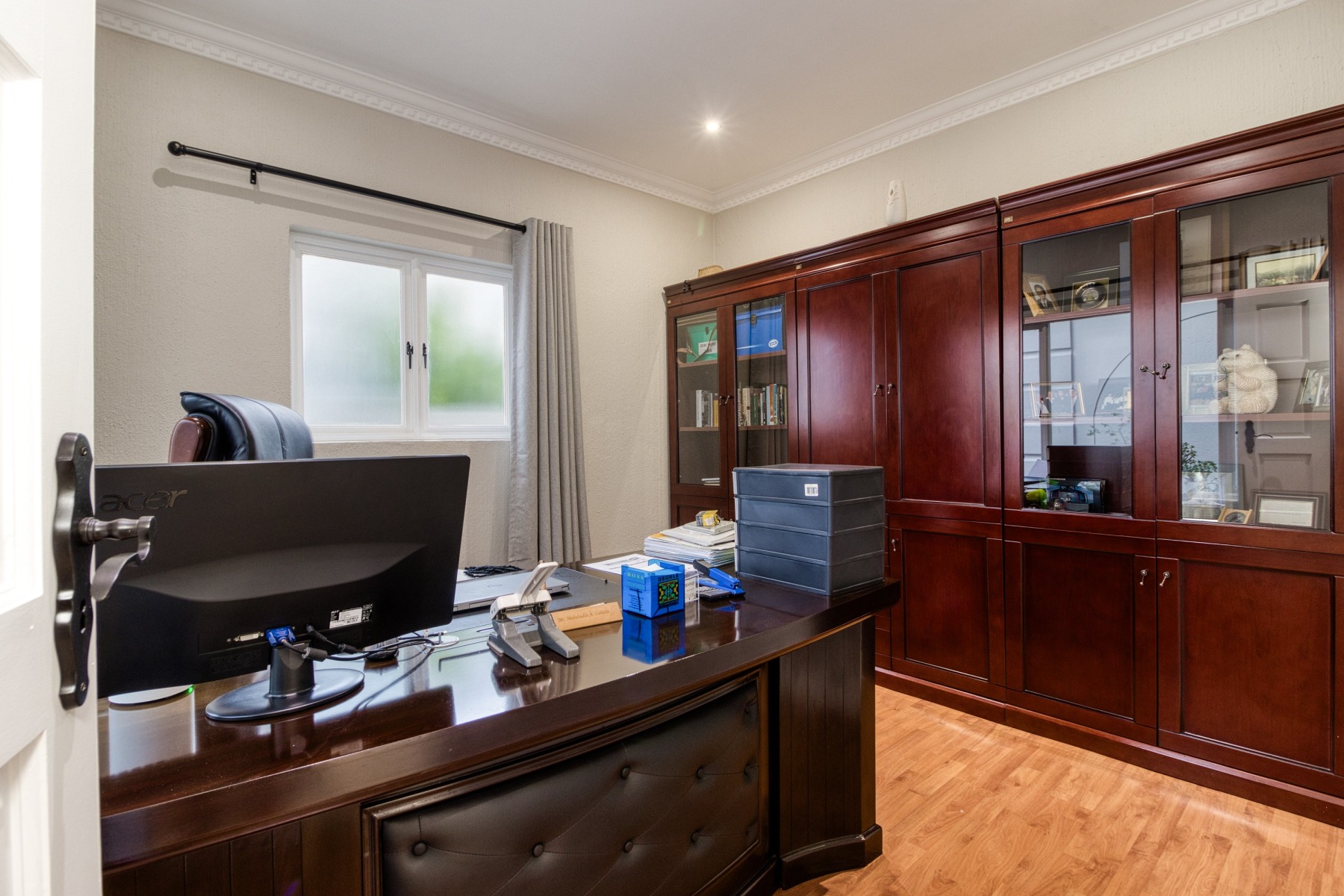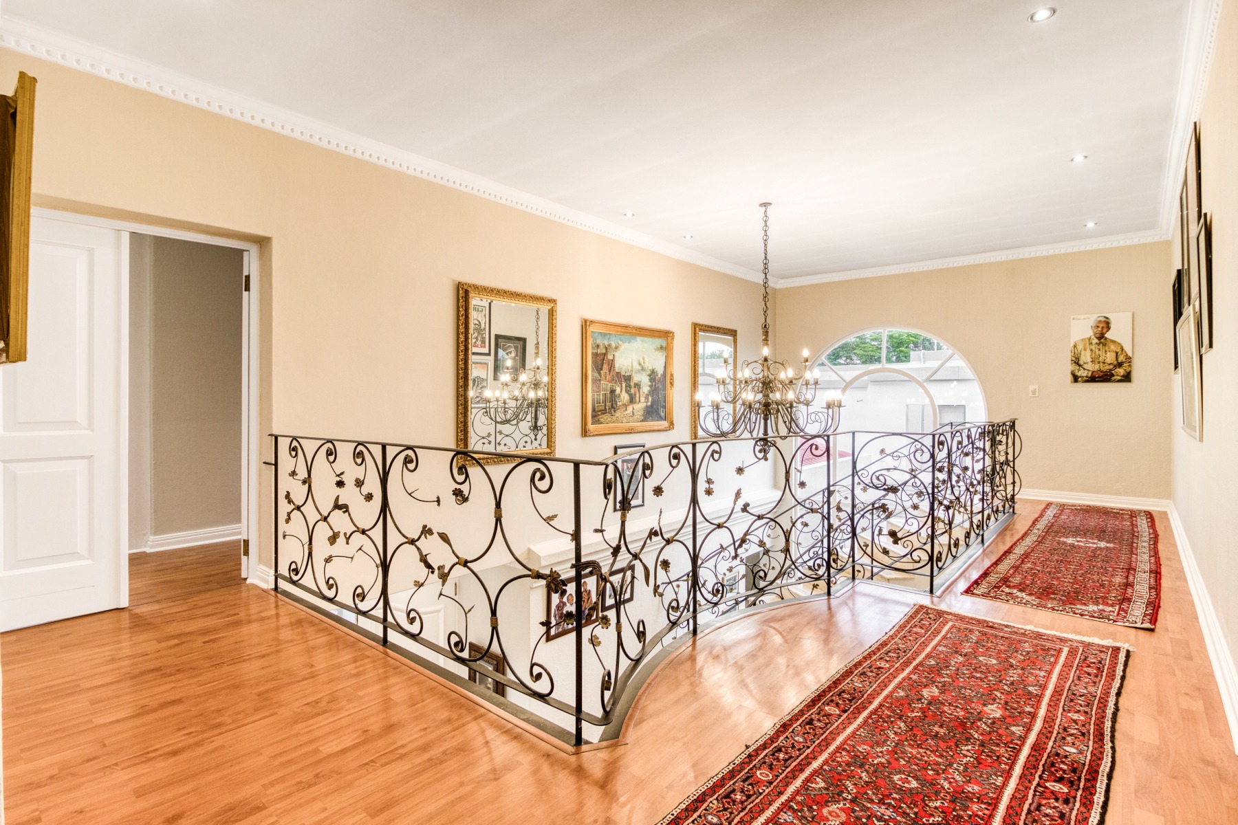Step into the double-volume, sun-drenched entrance with a sweeping staircase that sets the stage for the spacious living areas. The main living space boasts a large family/TV room and a well-appointed bar, while the dining room comfortably accommodates a 12-seater table. The adjacent well-designed kitchen features a central island with seating, a gas hob, and a convenient walk-in pantry.