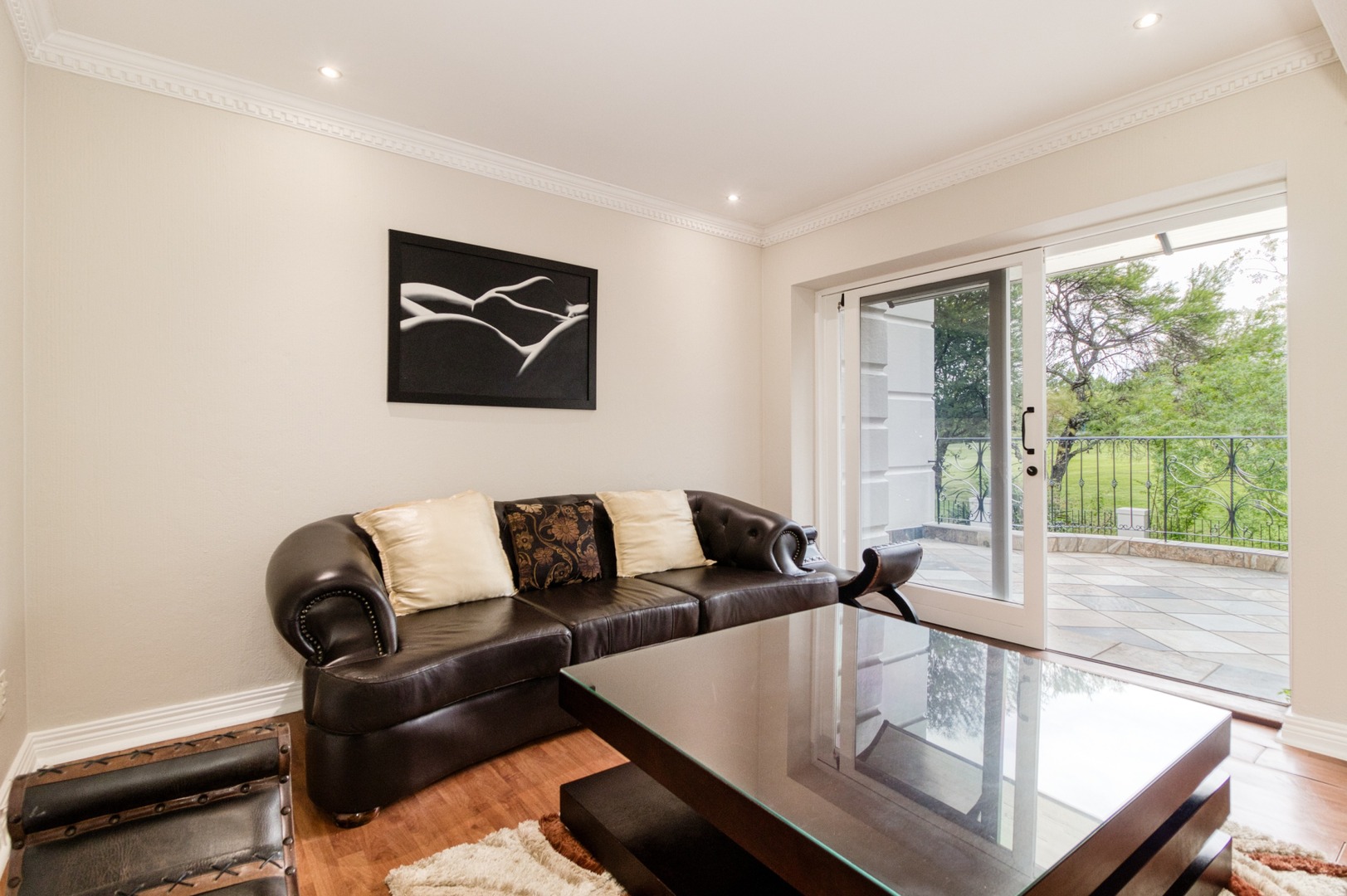 Upstairs, three well-appointed en-suite bedrooms with air-conditioning offer comfort and privacy. The main bedroom includes a lounge area and a balcony overlooking the picturesque golf course. An enclosed central patio seamlessly connects indoor and outdoor spaces, creating an ideal setting for entertaining, complemented by a sparkling pool.