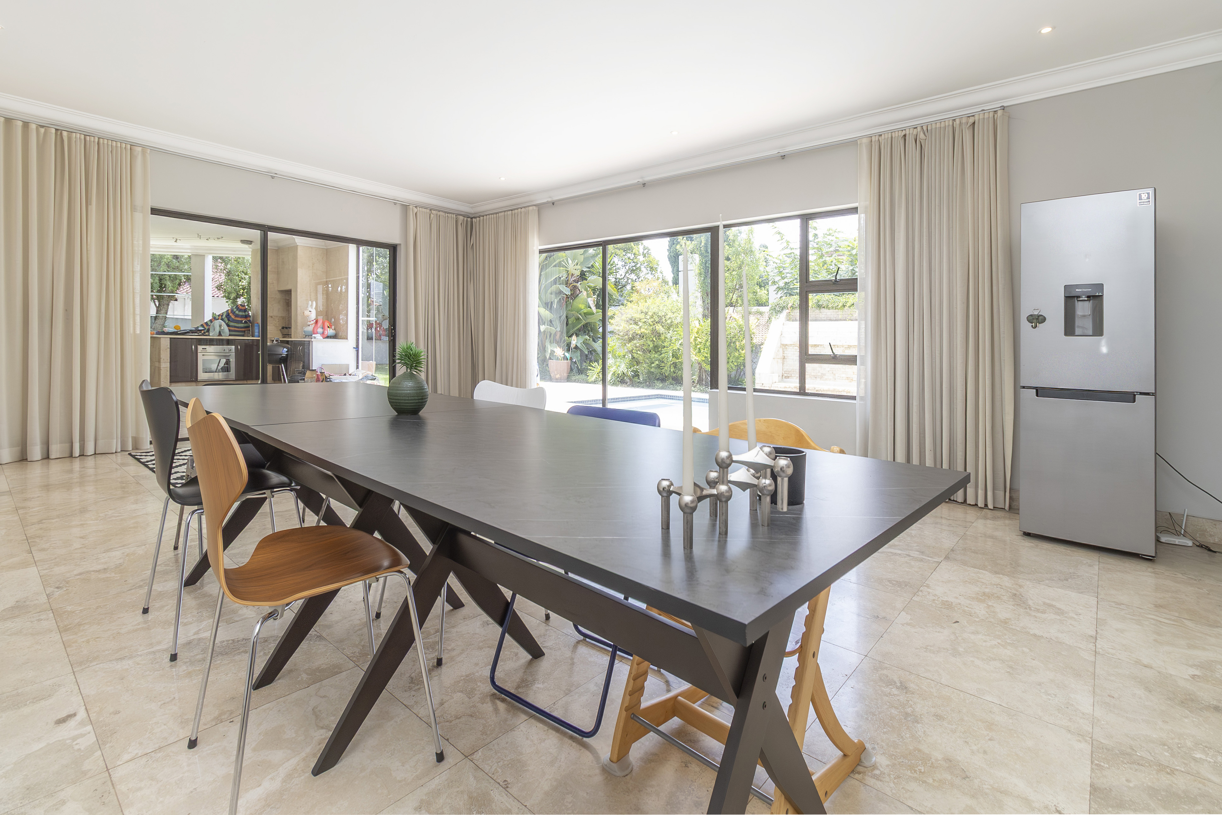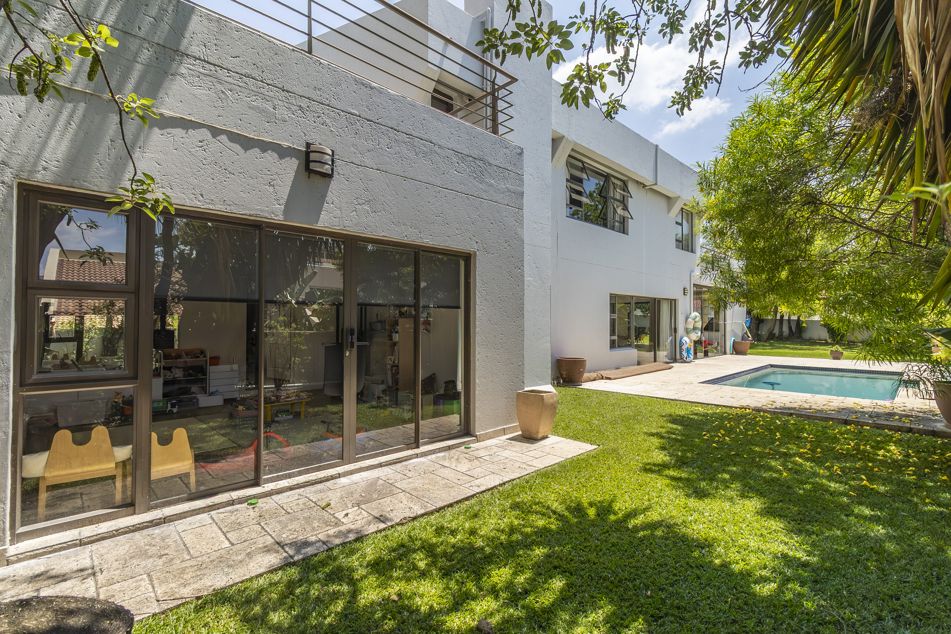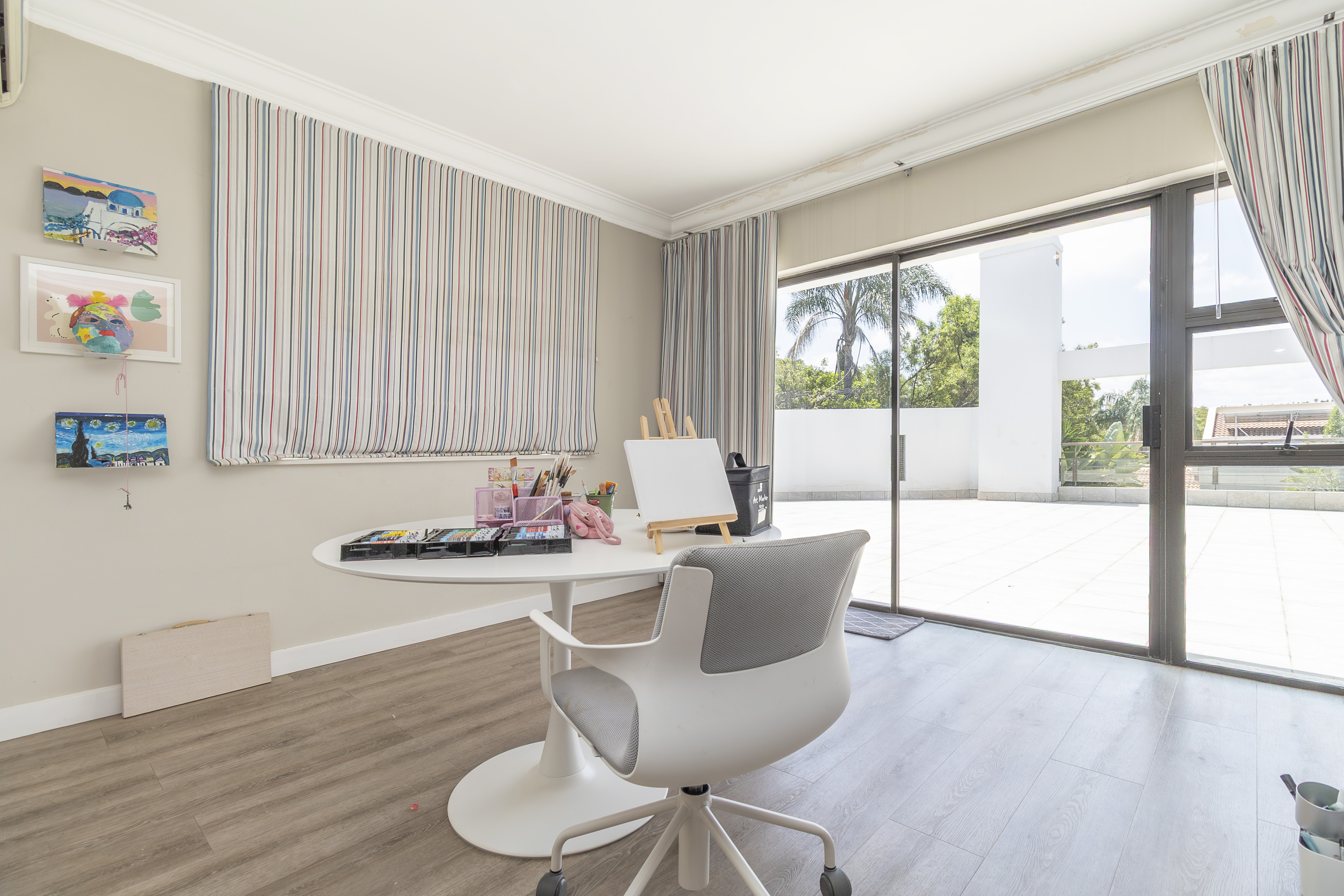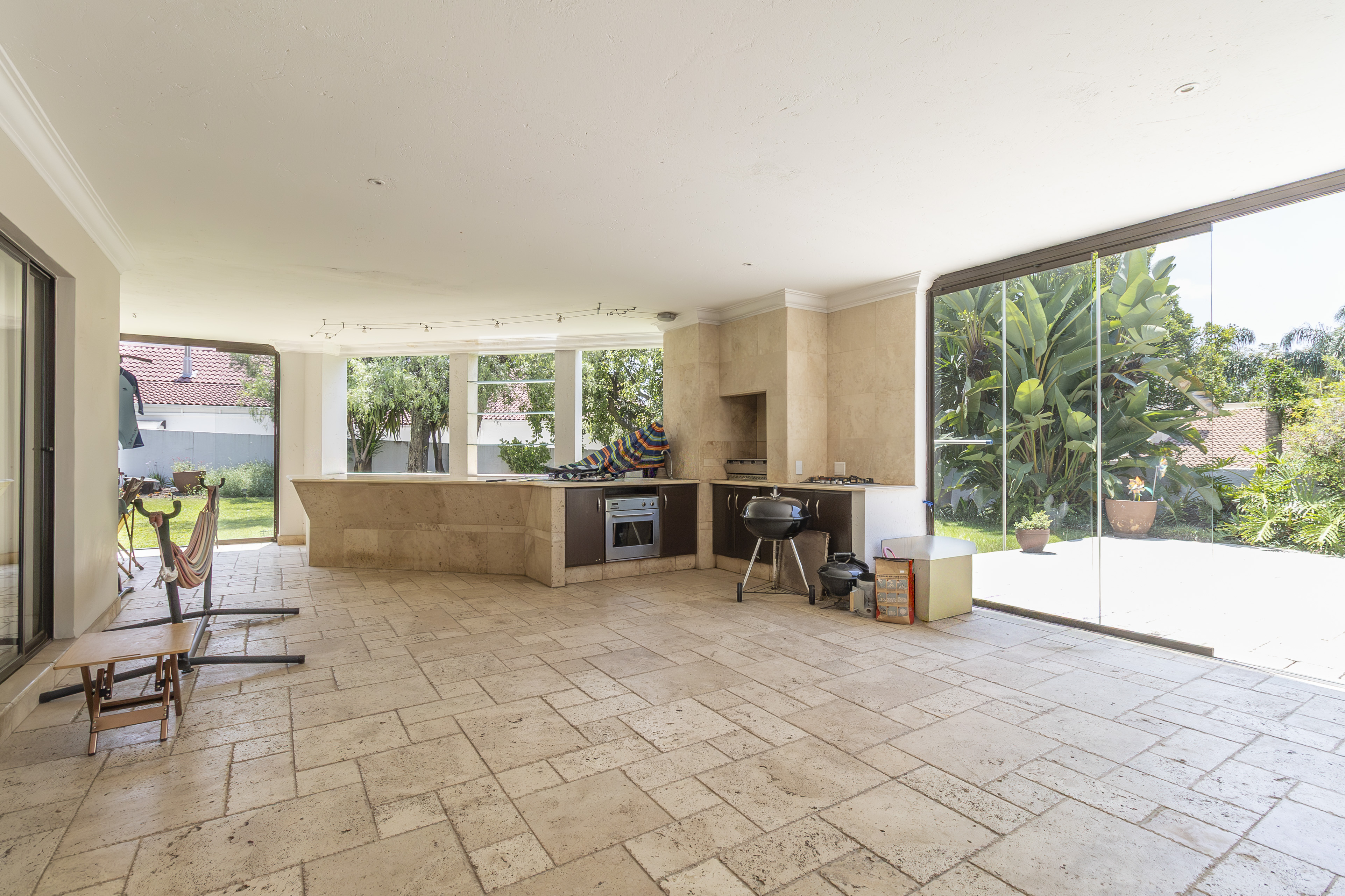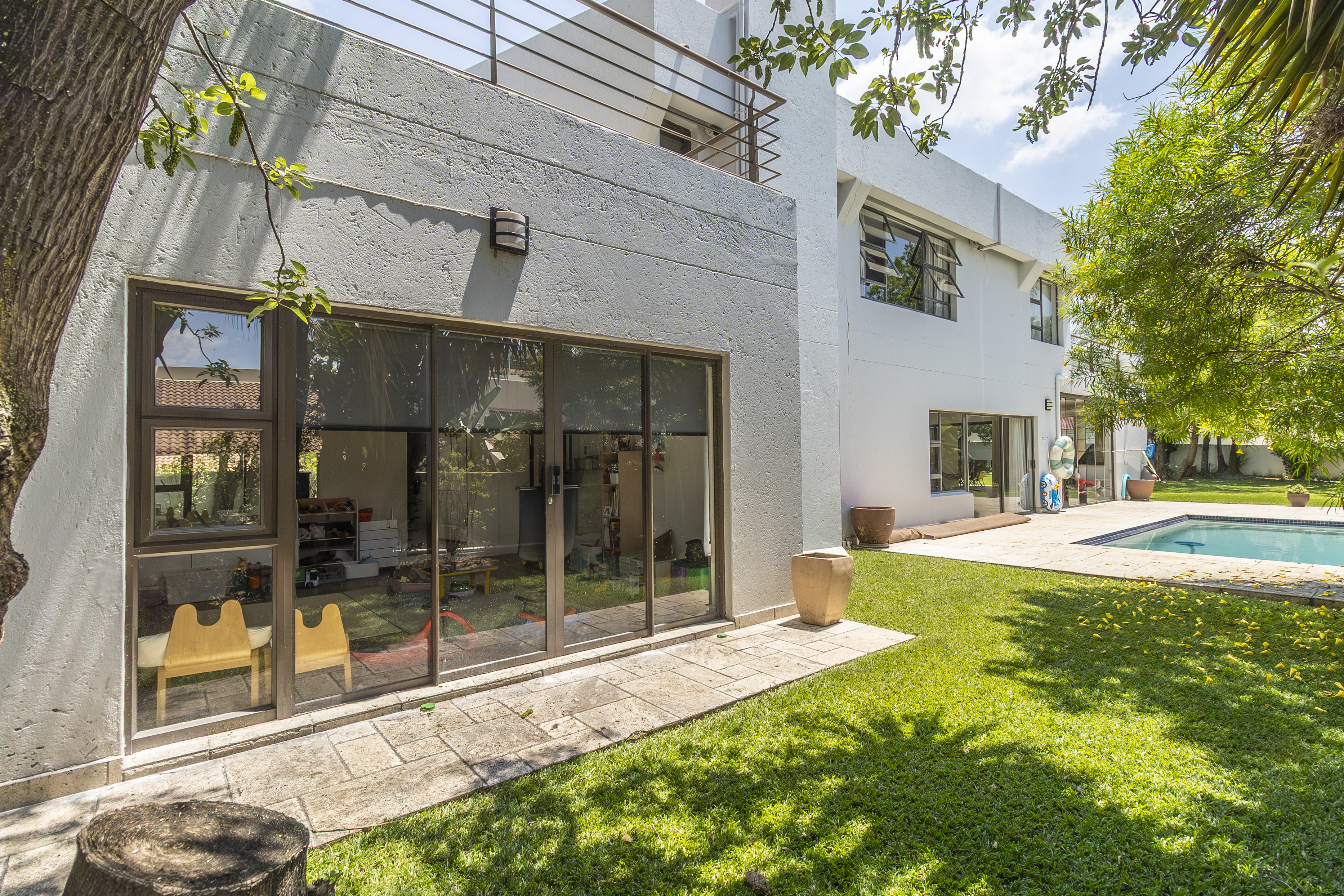 This magnificent residence offers refined estate living with generous proportions, seamless indoor-outdoor flow, and exceptional entertaining spaces, all set within the prestigious Dainfern Golf Estate. Upon arrival, three garages lead into a welcoming entrance hall that opens to a large, well-appointed kitchen with separate scullery. The dining room and formal lounge, both featuring sliding doors that open onto a covered entertainer’s patio, perfect for relaxed family living and entertaining. An expansive entertainment lounge with a built-in bar and fireplace creates a warm and inviting atmosphere, with sliding doors leading out to the entertainer’s patio. The home is designed for effortless entertaining, both inside and out. Downstairs also offers a private study with sliding doors to the garden, ideal for working from home. Two well-sized bedrooms, each with doors opening onto the garden, share a stylish Jack-and-Jill bathroom. A separate guest cloakroom completes the lower level. Upstairs, the luxurious main suite is a true retreat with fireplace. It opens onto a private balcony and features separate his-and-her walk-in closets, as well as separate full his-and-her bathrooms, both with doors leading to a private balcony and an outdoor shower, an indulgent sanctuary. Two additional en-suite bedrooms upstairs also open onto balconies, offering comfort, privacy, and beautiful outdoor access. The home boasts three balconies in total, with the main balcony being exceptionally spacious, large enough to create your own private escape or rooftop lounge. Additional features include staff accommodation with a bathroom, as well as an external space ideal for conversion into a home office or studio. The landscaped garden with swimming pool and water feature, complemented by a spacious covered entertainer’s patio with a separate serving area or bar and a gas braai, perfect for hosting in style. This exceptional home combines luxury, functionality, and outstanding entertainment spaces in one of Johannesburg’s most sought-after golf estates.