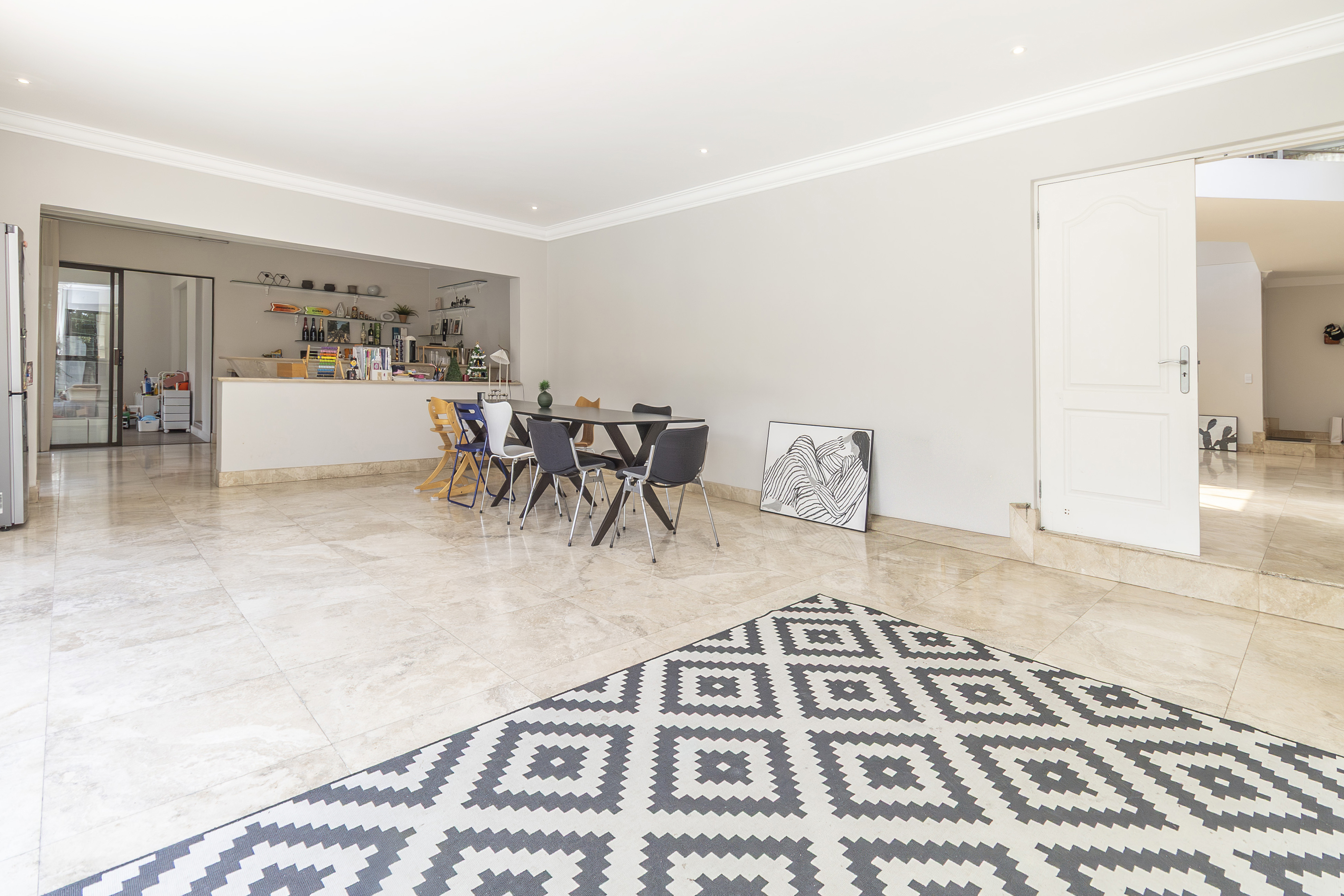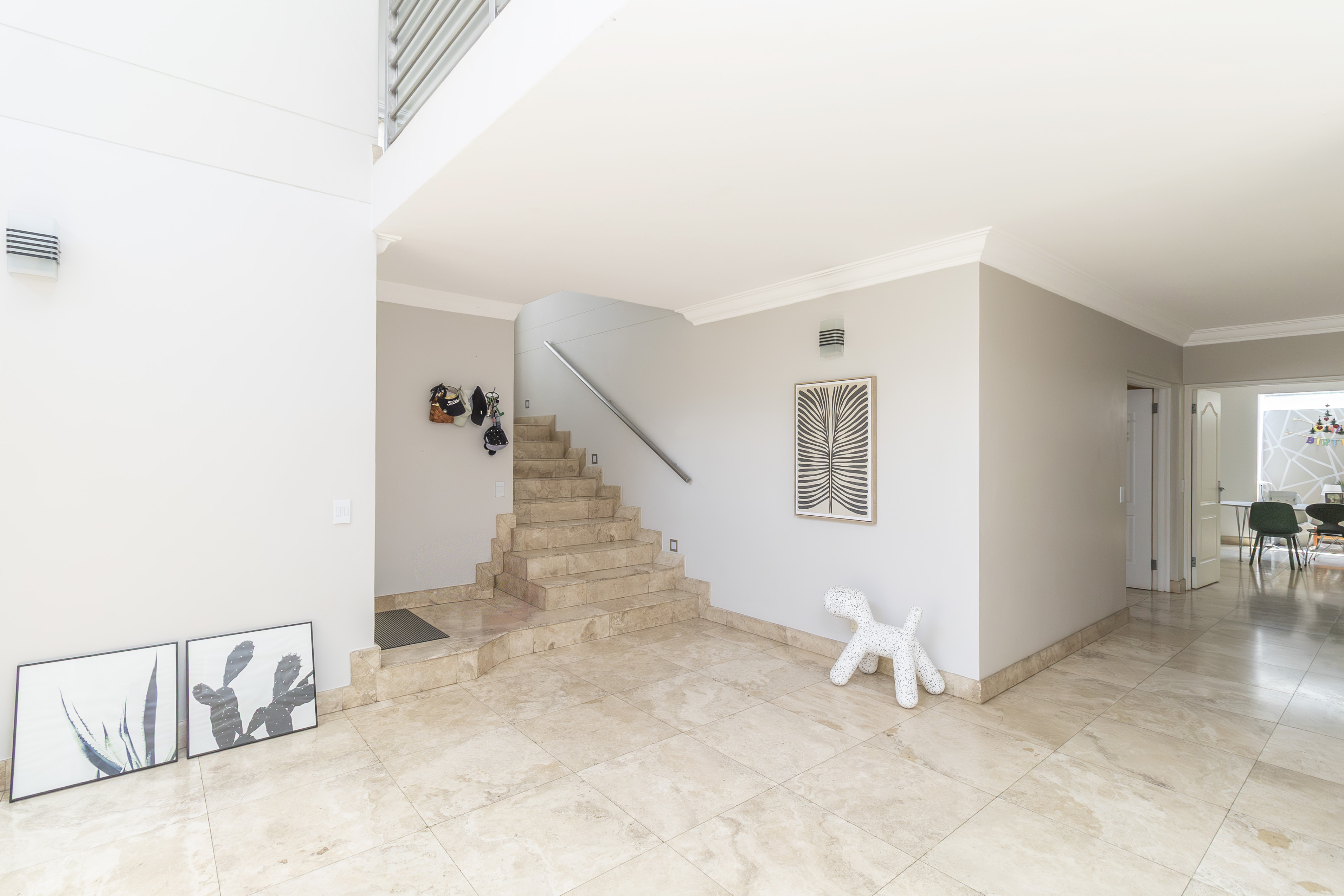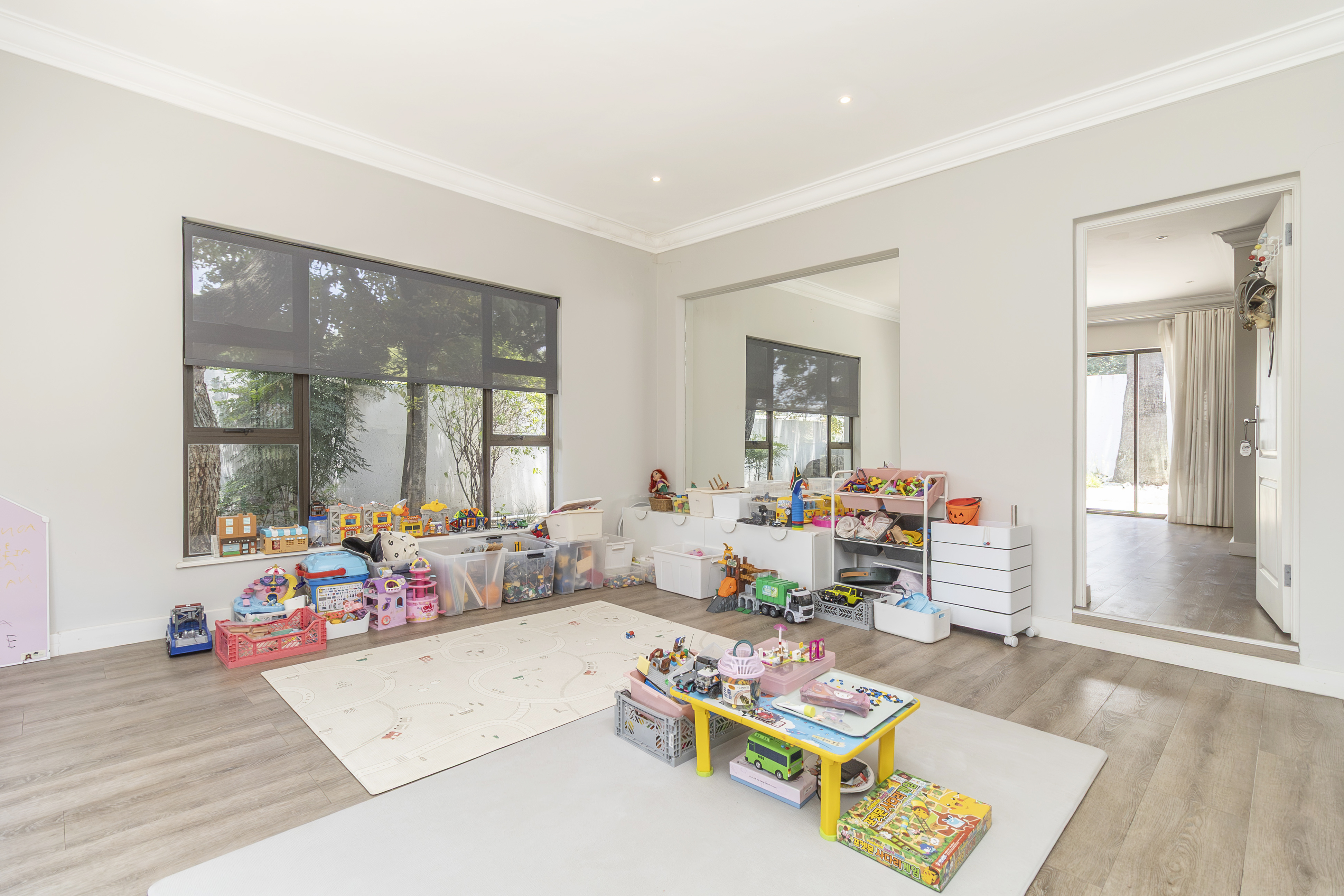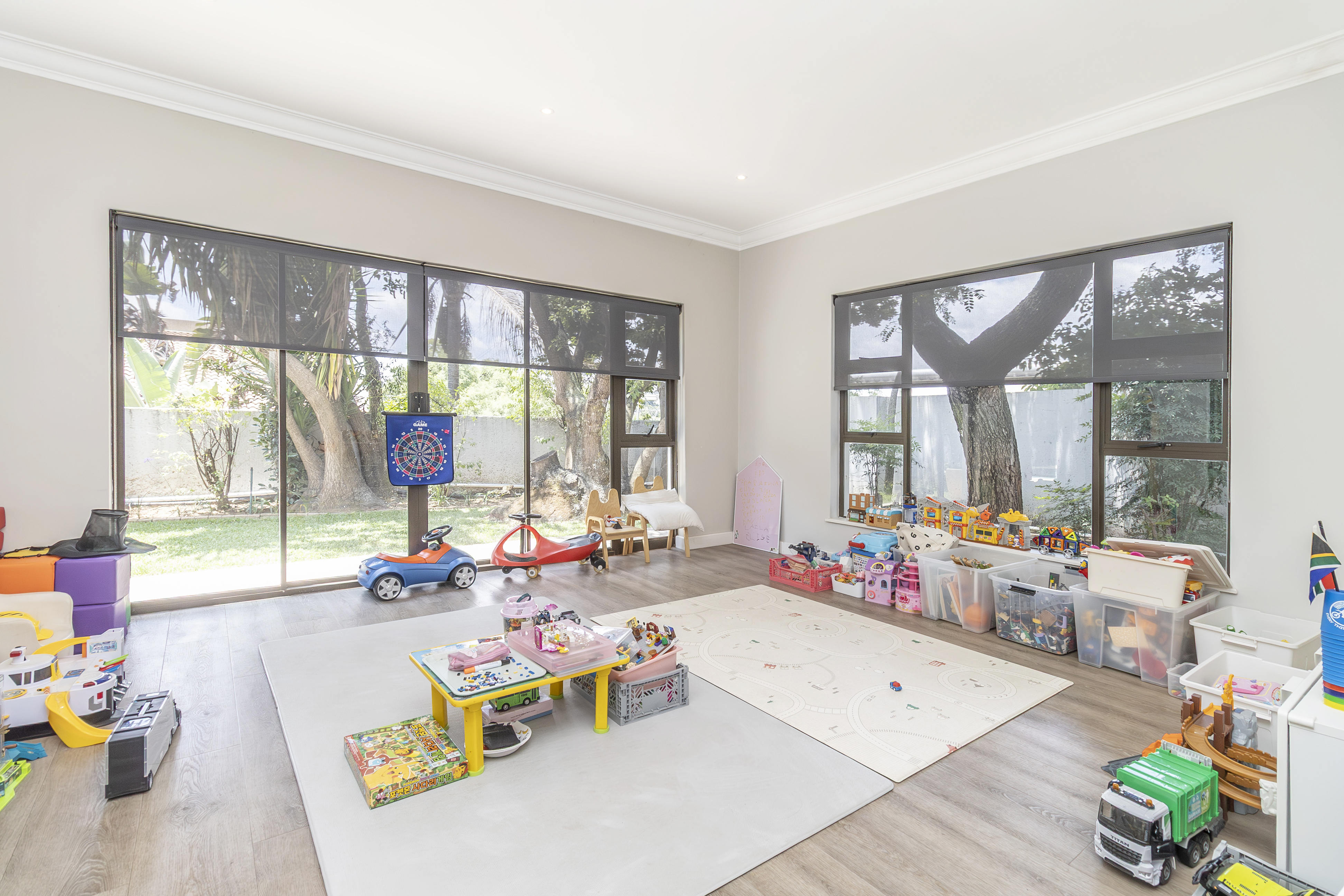 This magnificent residence offers refined estate living with generous proportions, seamless indoor-outdoor flow, and exceptional entertaining spaces, all set within the prestigious Dainfern Golf Estate. Upon arrival, three garages lead into a welcoming entrance hall that opens to a large, well-appointed kitchen with separate scullery. The dining room and formal lounge, both featuring sliding doors that open onto a covered entertainer’s patio, perfect for relaxed family living and entertaining. An expansive entertainment lounge with a built-in bar and fireplace creates a warm and inviting atmosphere, with sliding doors leading out to the entertainer’s patio. The home is designed for effortless entertaining, both inside and out. Downstairs also offers a private study with sliding doors to the garden, ideal for working from home. Two well-sized bedrooms, each with doors opening onto the garden, share a stylish Jack-and-Jill bathroom. A separate guest cloakroom completes the lower level. Upstairs, the luxurious main suite is a true retreat with fireplace. It opens onto a private balcony and features separate his-and-her walk-in closets, as well as separate full his-and-her bathrooms, both with doors leading to a private balcony and an outdoor shower, an indulgent sanctuary. Two additional en-suite bedrooms upstairs also open onto balconies, offering comfort, privacy, and beautiful outdoor access. The home boasts three balconies in total, with the main balcony being exceptionally spacious, large enough to create your own private escape or rooftop lounge. Additional features include staff accommodation with a bathroom, as well as an external space ideal for conversion into a home office or studio. The landscaped garden with swimming pool and water feature, complemented by a spacious covered entertainer’s patio with a separate serving area or bar and a gas braai, perfect for hosting in style. This exceptional home combines luxury, functionality, and outstanding entertainment spaces in one of Johannesburg’s most sought-after golf estates.