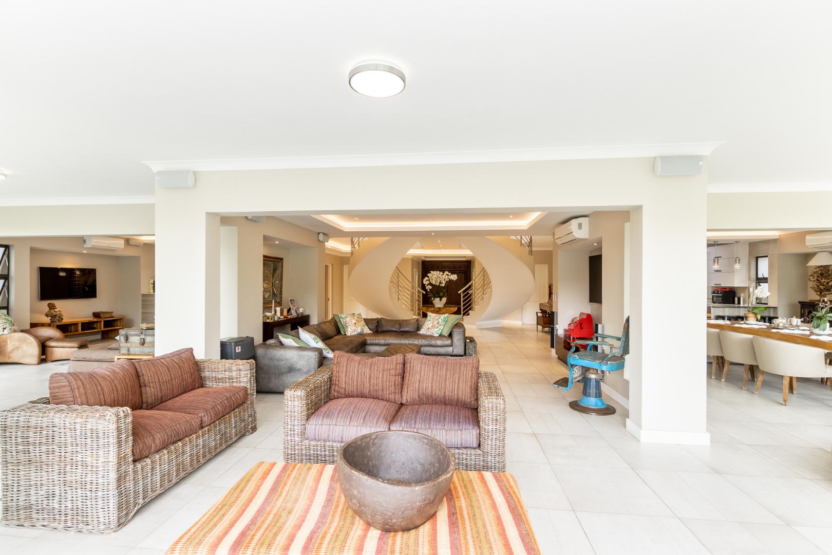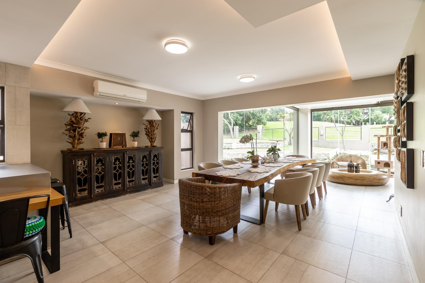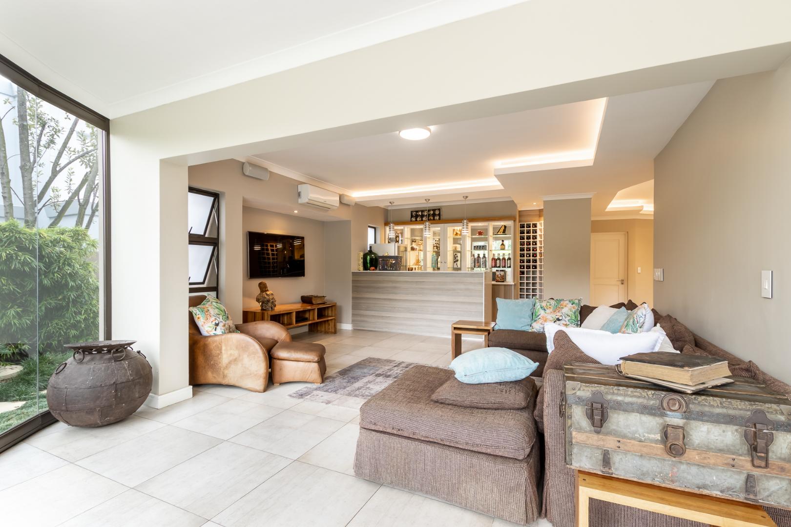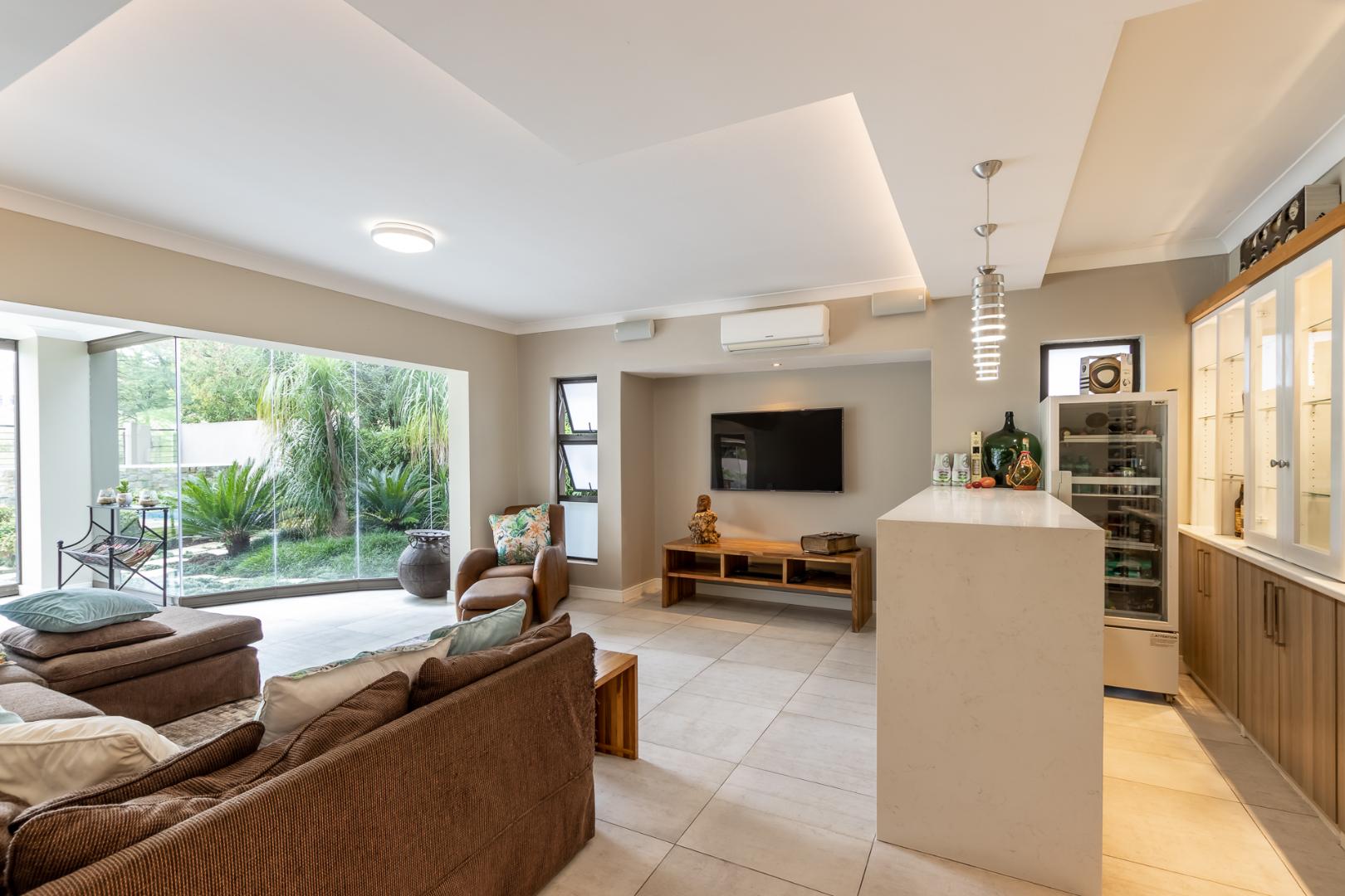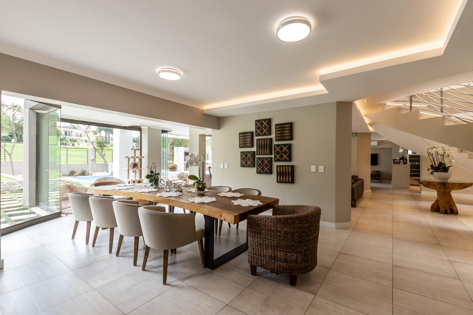 You enter this home through an unusual entrance area, with an impressive wood-carved Moroccan double door. To be met with a double volume entrance hall with sweeping double staircase. This home takes full advantage of the north-facing aspect with its floor to ceiling frameless stacking doors that lead out onto the well-manicured garden with sparkling swimming pool and boma area with fitted gas braai. An ideal outdoor setting for entertaining friends and family.
