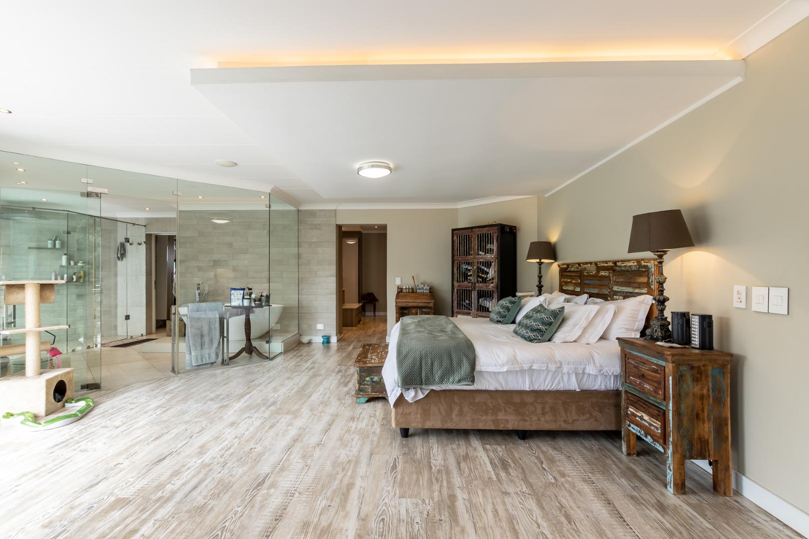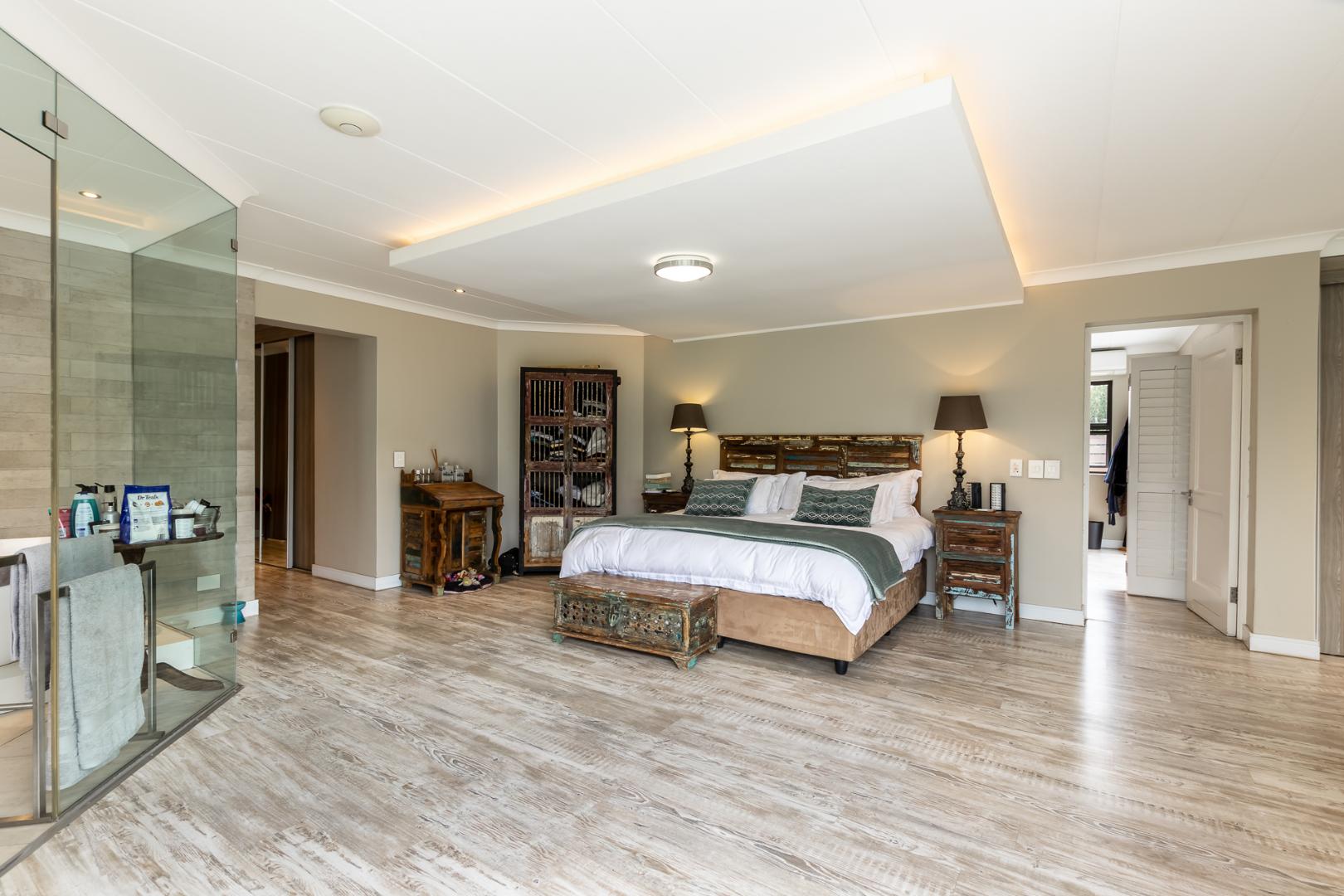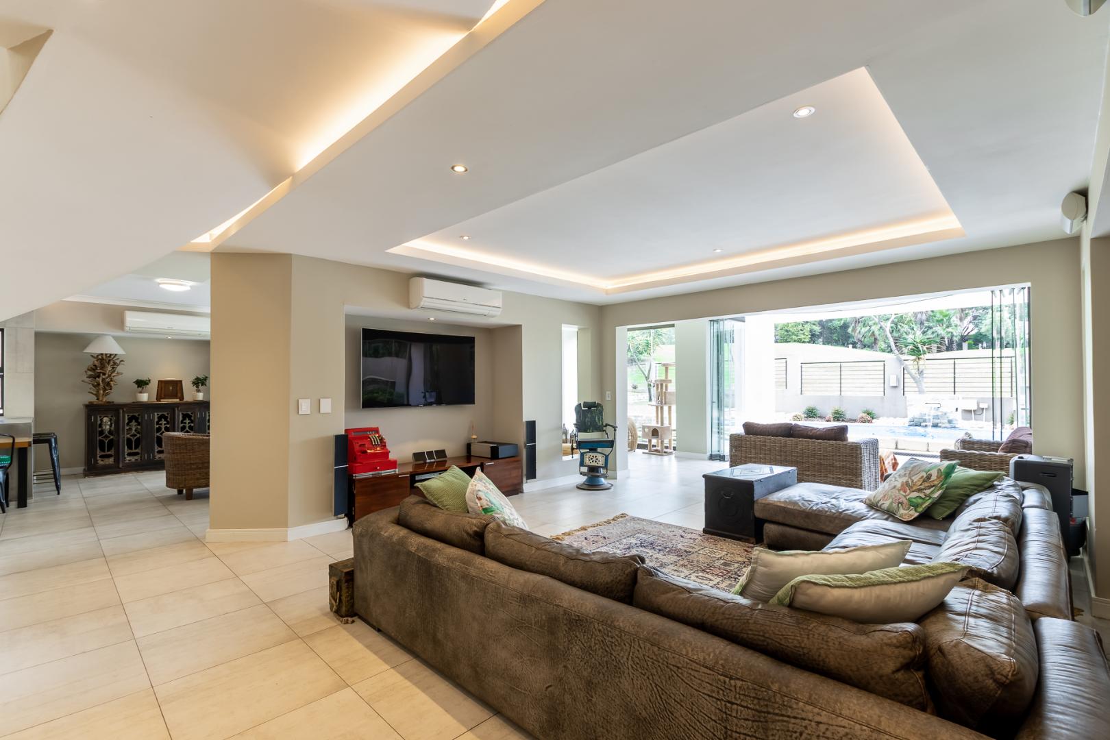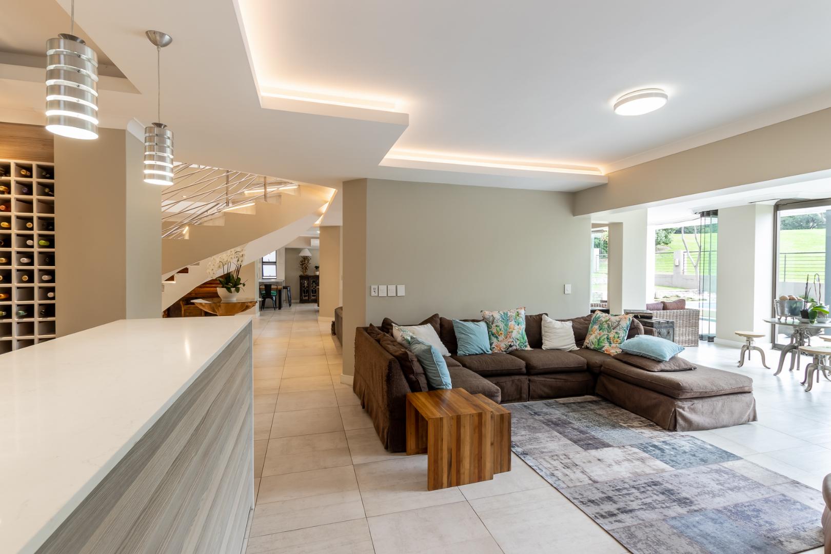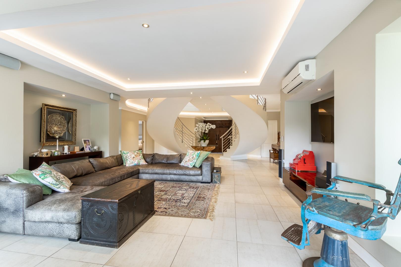 You enter this home through an unusual entrance area, with an impressive wood-carved Moroccan double door. To be met with a double volume entrance hall with sweeping double staircase. This home takes full advantage of the north-facing aspect with its floor to ceiling frameless stacking doors that lead out onto the well-manicured garden with sparkling swimming pool and boma area with fitted gas braai. An ideal outdoor setting for entertaining friends and family.