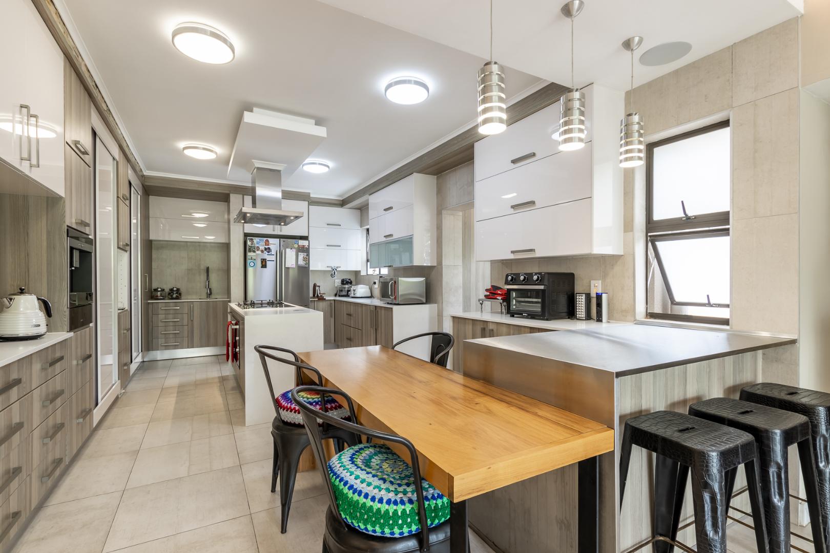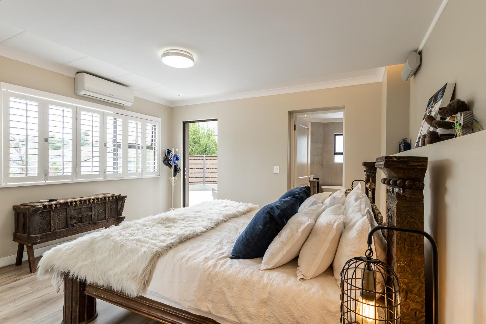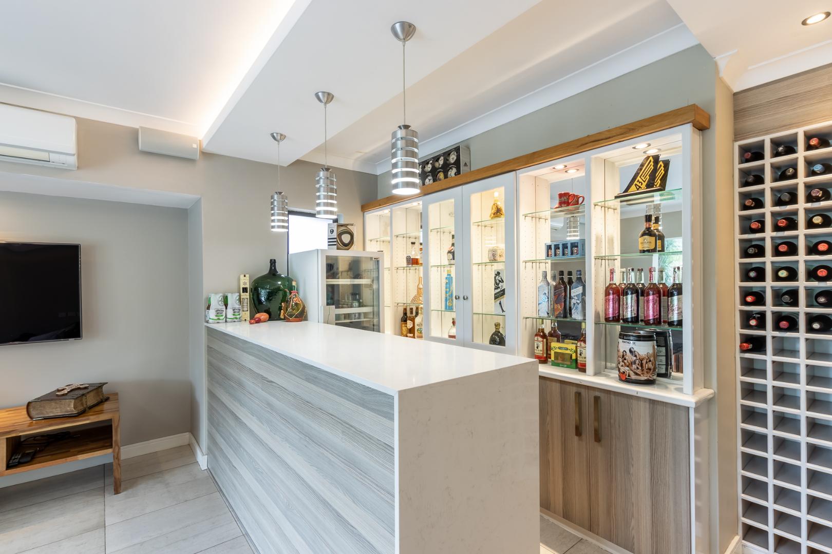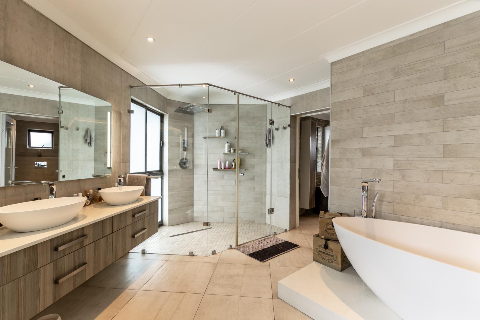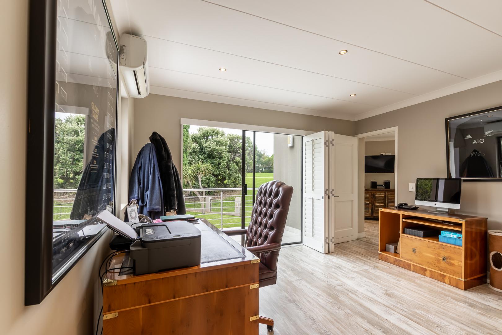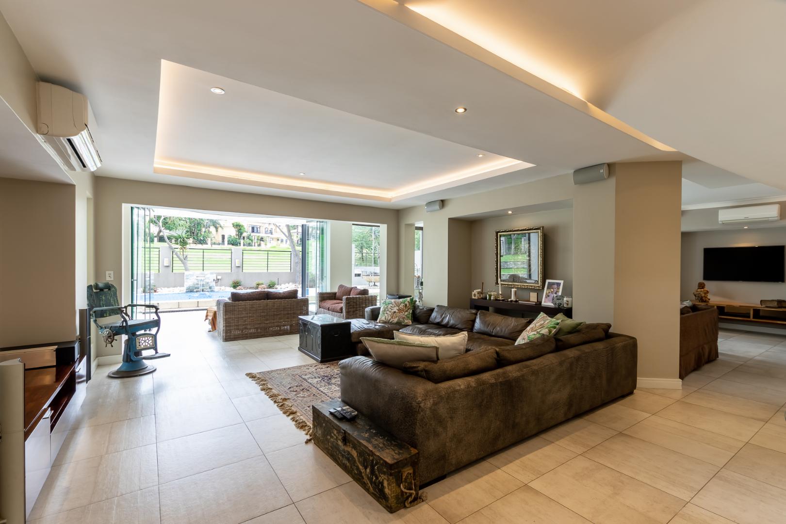 You enter this home through an unusual entrance area, with an impressive wood-carved Moroccan double door. To be met with a double volume entrance hall with sweeping double staircase. This home takes full advantage of the north-facing aspect with its floor to ceiling frameless stacking doors that lead out onto the well-manicured garden with sparkling swimming pool and boma area with fitted gas braai. An ideal outdoor setting for entertaining friends and family.