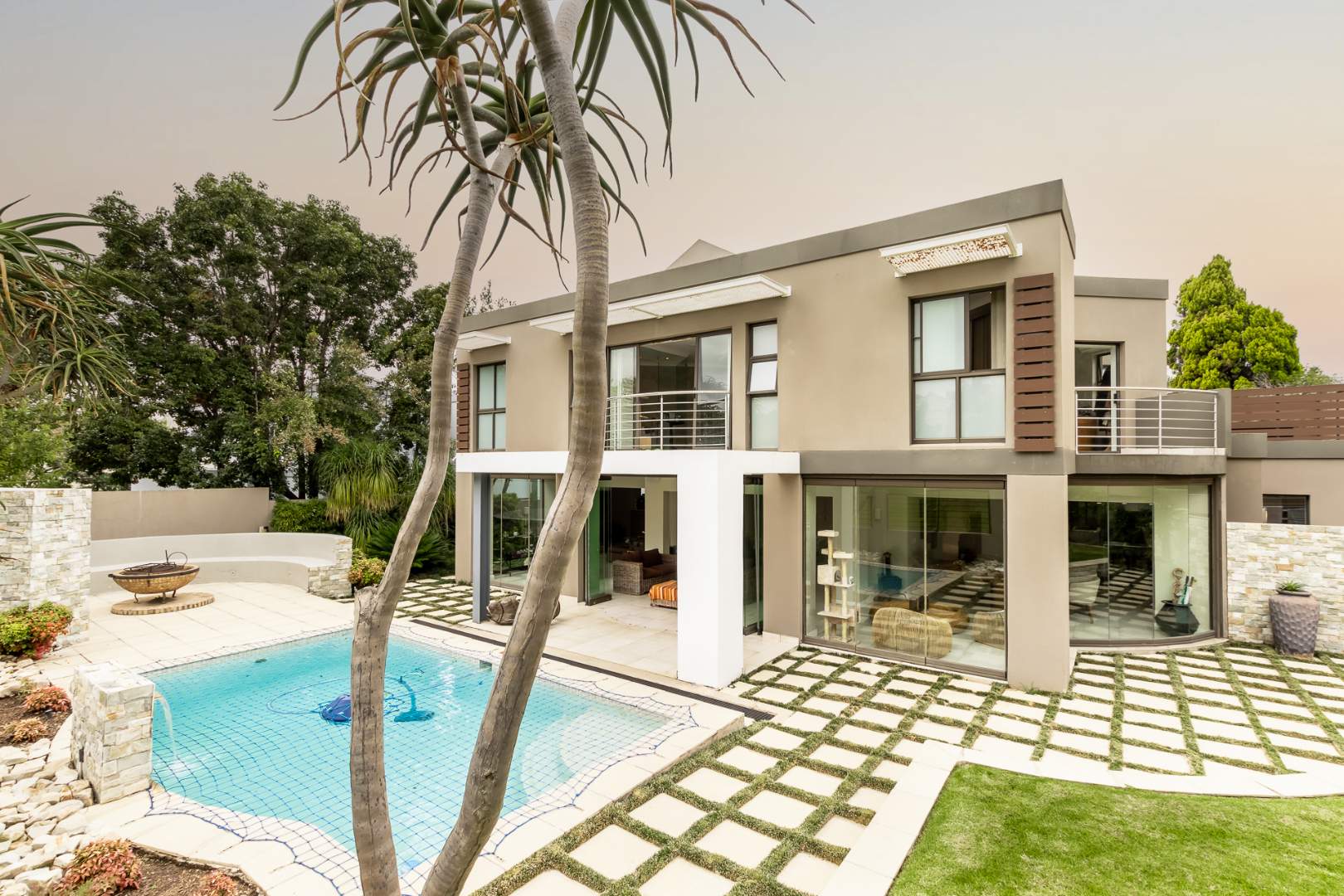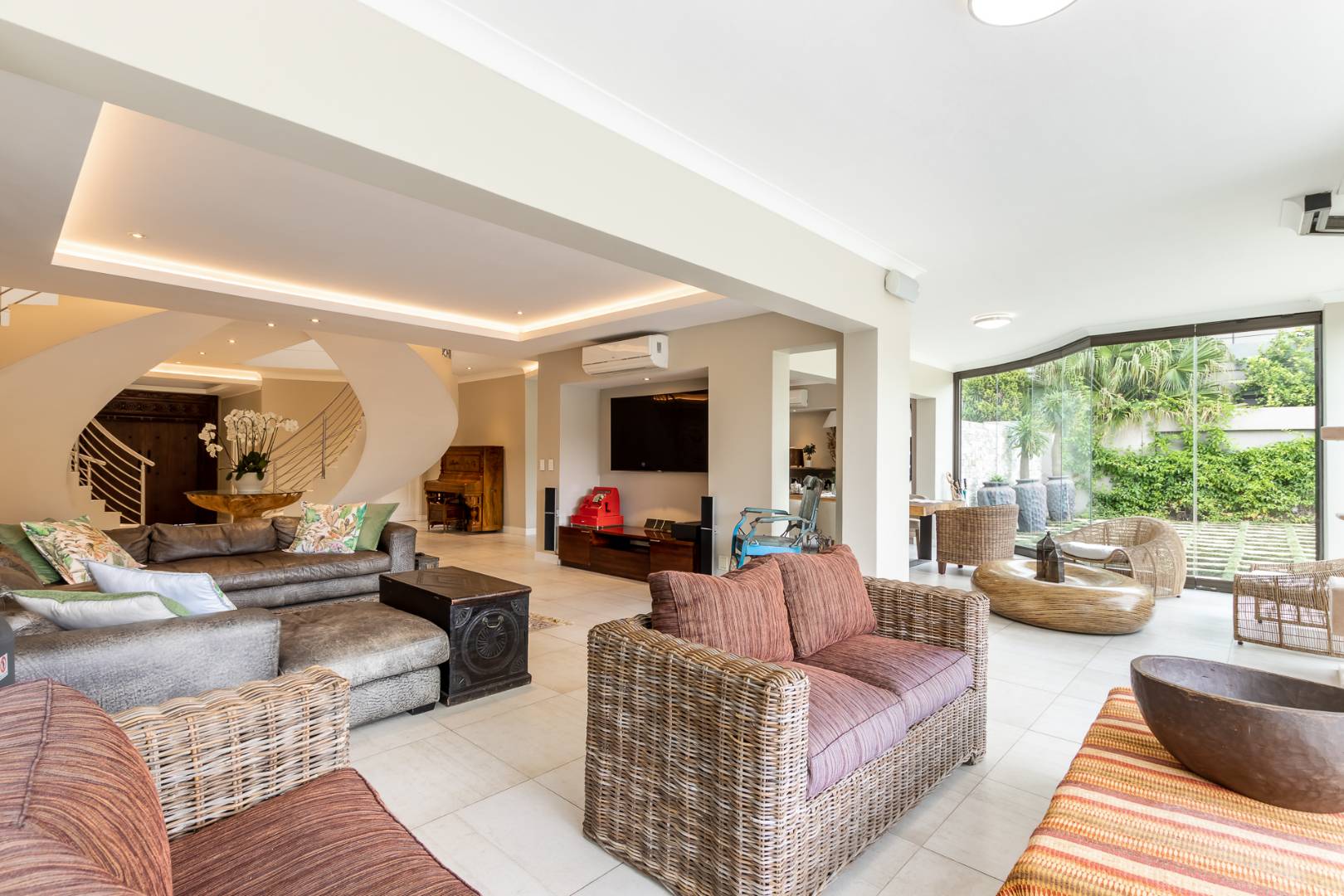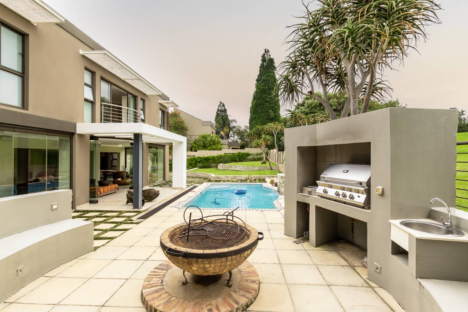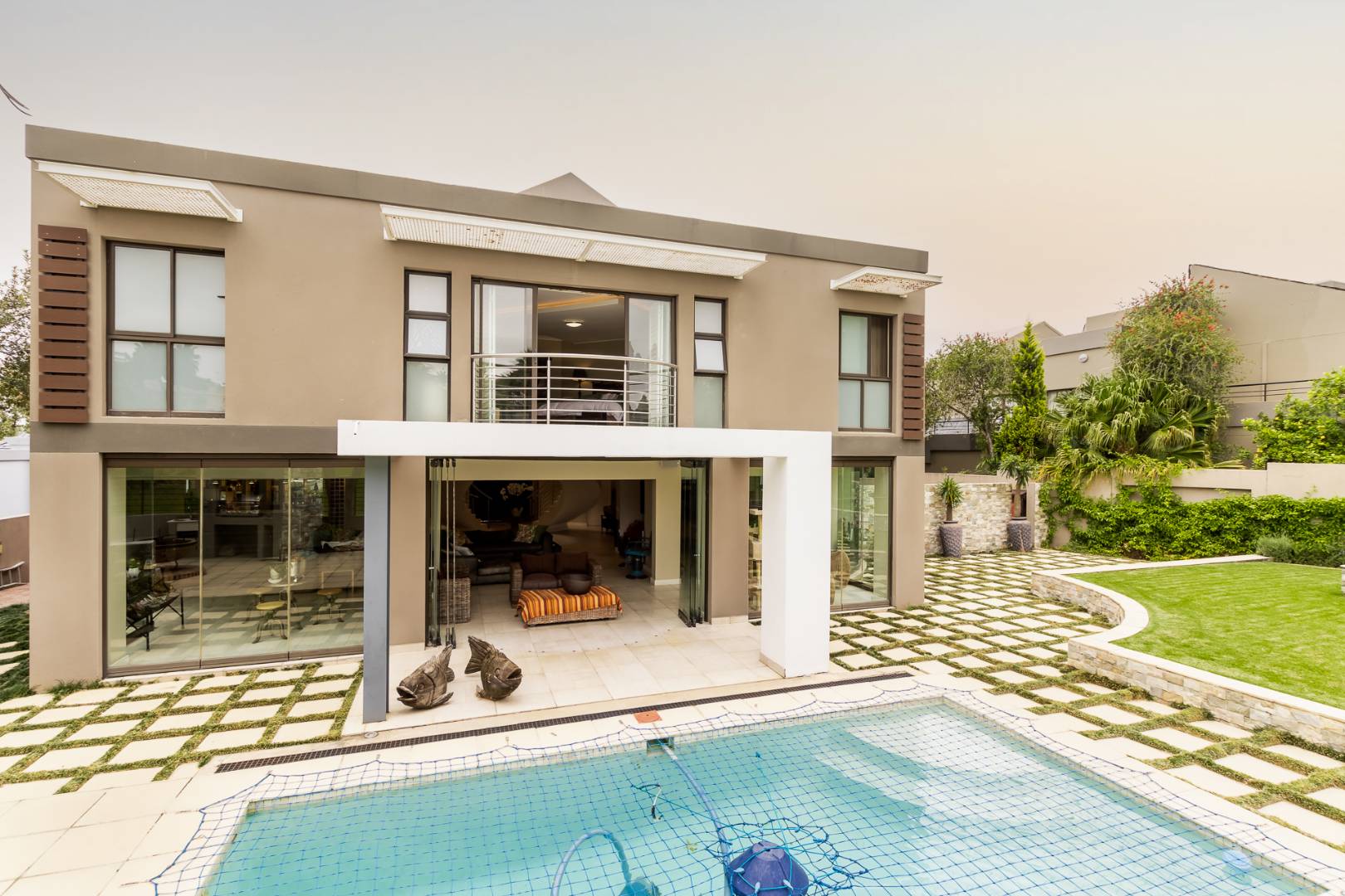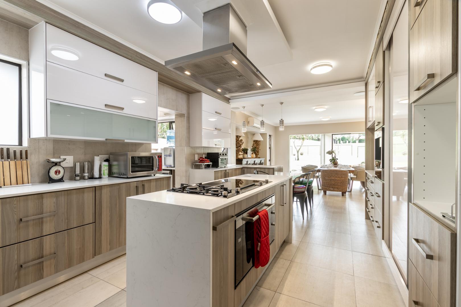 You enter this home through an unusual entrance area, with an impressive wood-carved Moroccan double door. To be met with a double volume entrance hall with sweeping double staircase. This home takes full advantage of the north-facing aspect with its floor to ceiling frameless stacking doors that lead out onto the well-manicured garden with sparkling swimming pool and boma area with fitted gas braai. An ideal outdoor setting for entertaining friends and family.