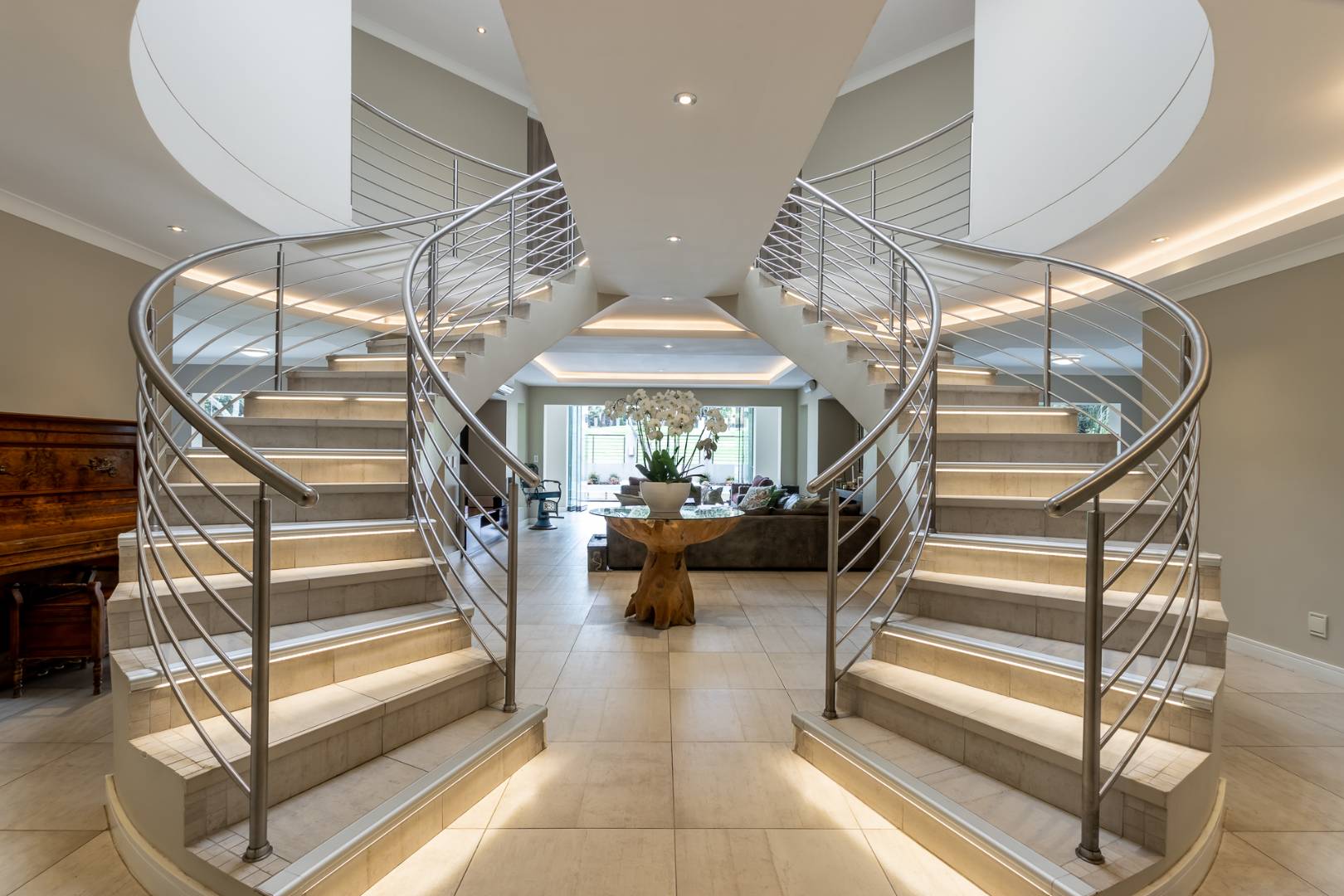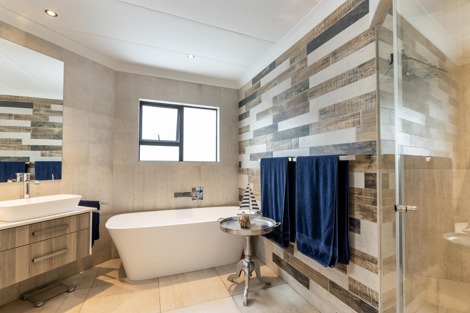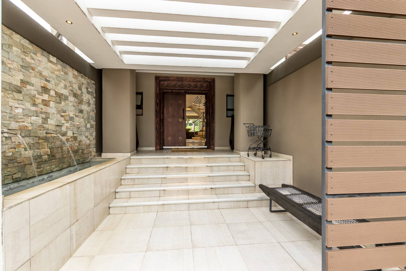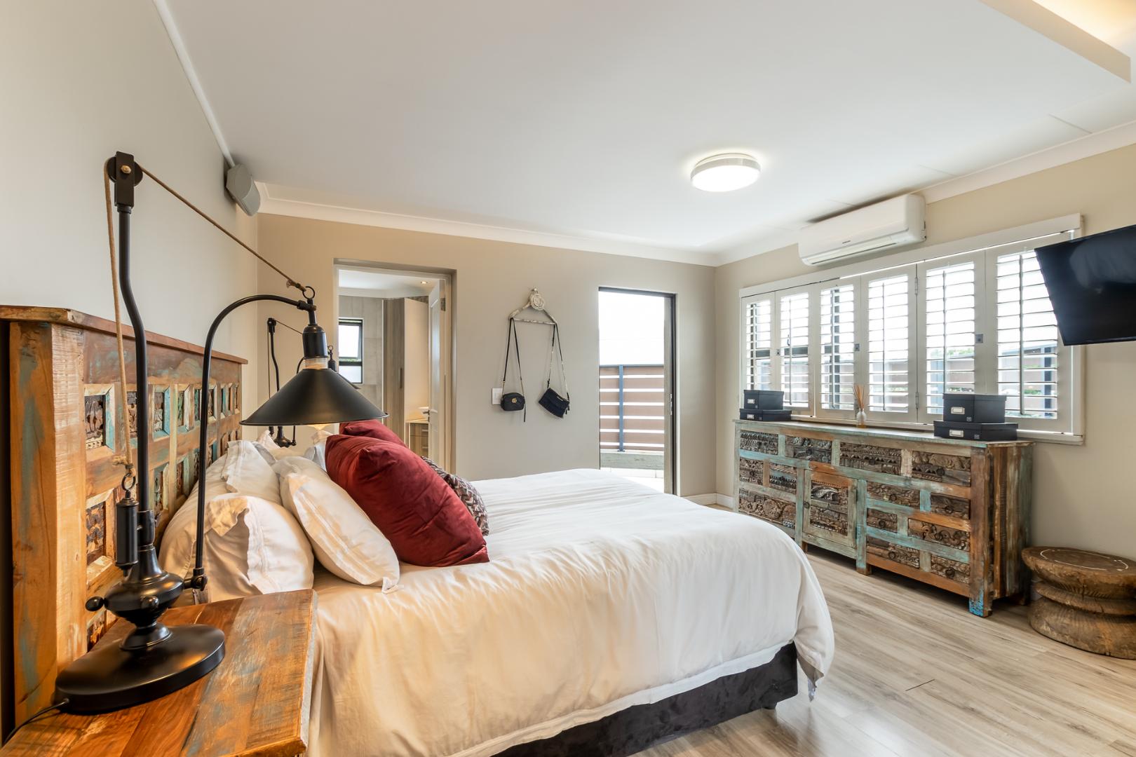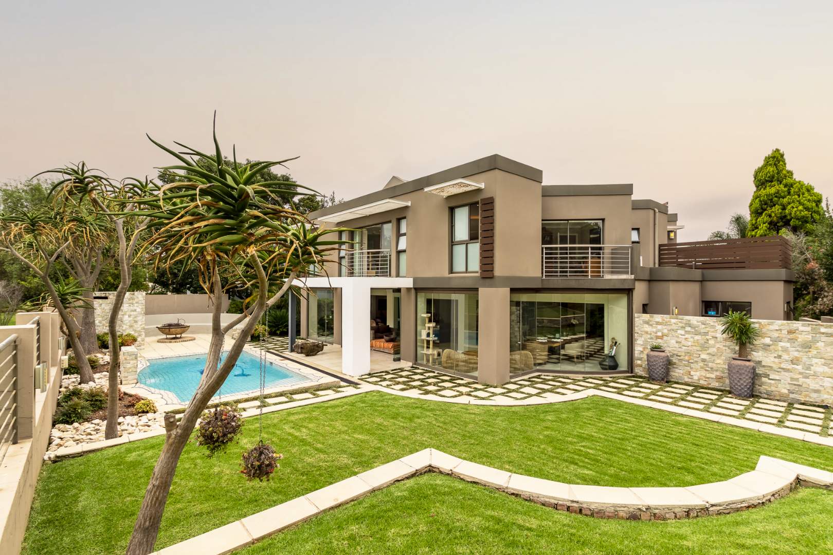 You enter this home through an unusual entrance area, with an impressive wood-carved Moroccan double door. To be met with a double volume entrance hall with sweeping double staircase. This home takes full advantage of the north-facing aspect with its floor to ceiling frameless stacking doors that lead out onto the well-manicured garden with sparkling swimming pool and boma area with fitted gas braai. An ideal outdoor setting for entertaining friends and family.
