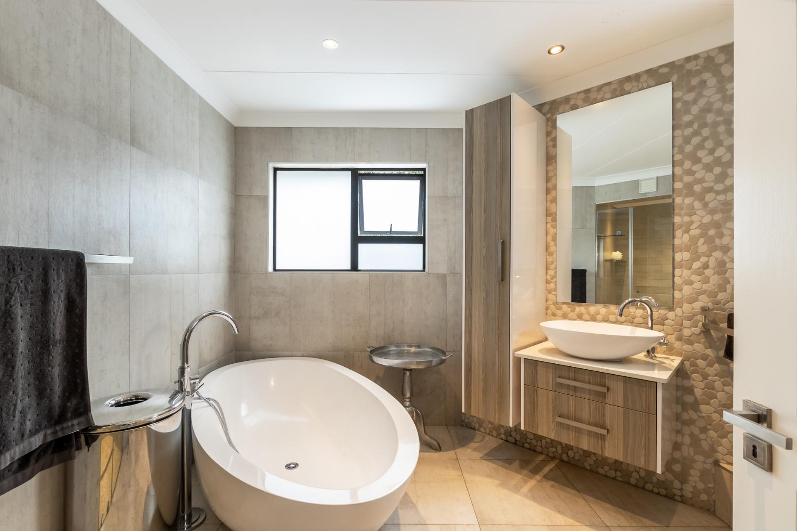 There are 4 en-suite bedrooms, with the master suite having a large “His & Her” walk-in dresser together with a full en-suite bathroom boasting stunning views across the golf course. Triple garage, staff accommodation with kitchenette completes this ultramodern gem found in the trendy Dainfern Golf Estate.